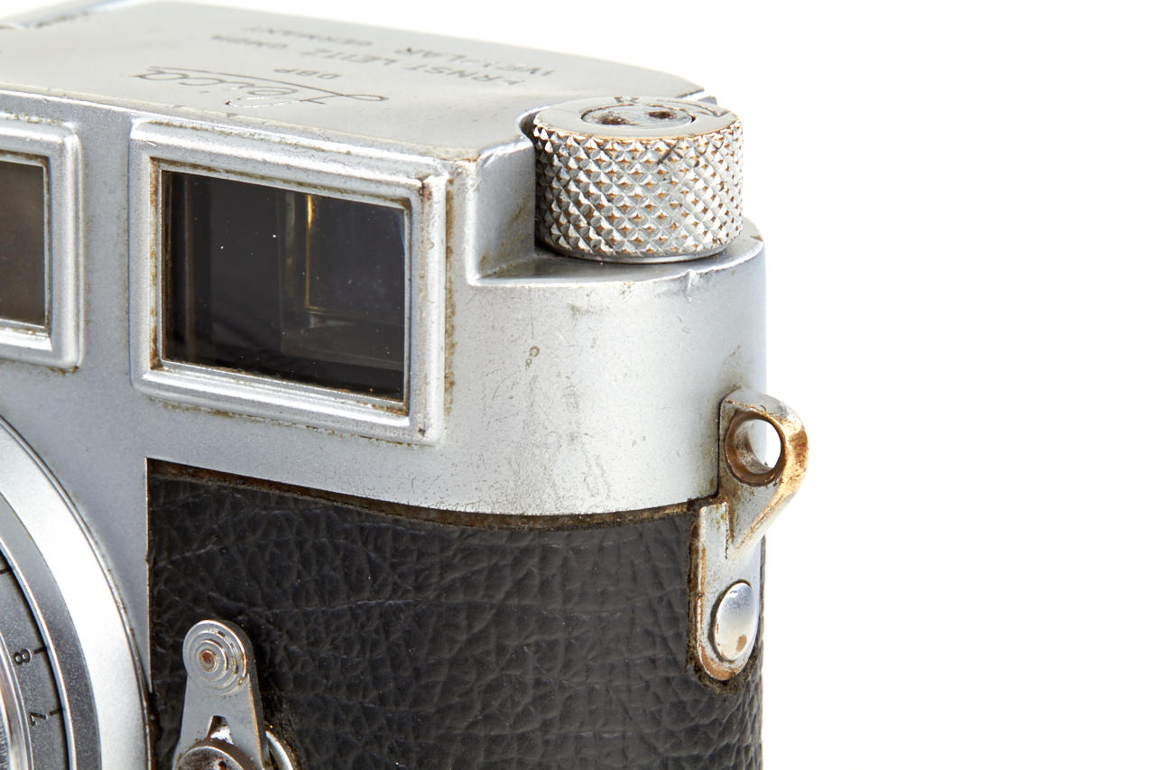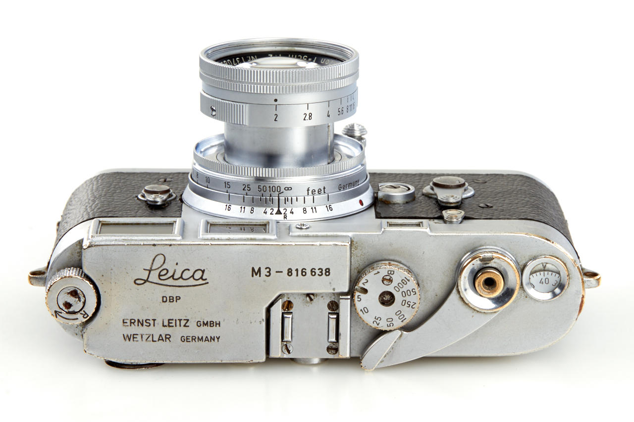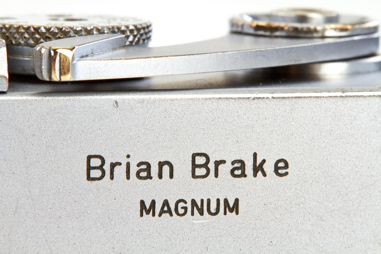 The camera from the estate of the famous New Zealand Magnum photographer Brian Brake, engraved by Leitz on rear of top plate 'Brian Brake Magnum', with matching Summicron 2/5cm no.1370893, cap, case - the book 'BRIAN BRAKE LENS ON THE WORLD' shows Brian Brake with his Leica M3 in China 1957 photographed by Marc Riboud - WestLicht sold Brian Brake's M3 no.853308 in the 30th auction - the offered camera has the patina of professional use over many years, the vulcanite was replaced