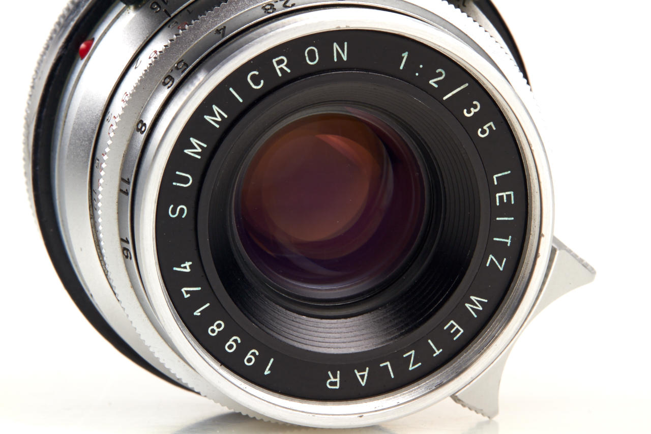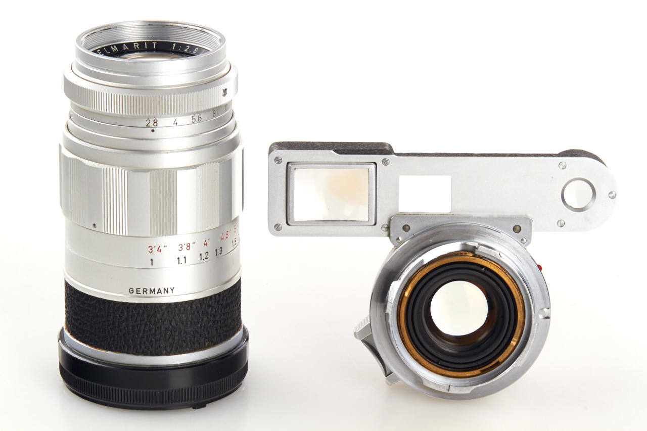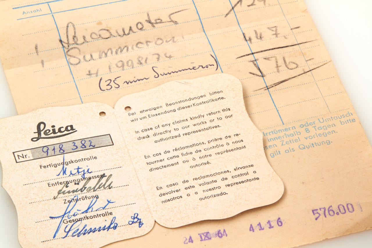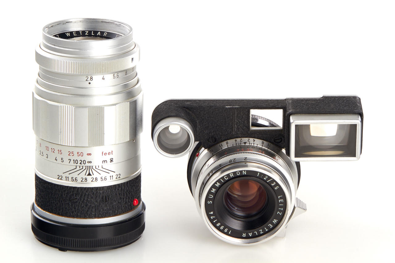 First owners outfit including fine double stroke body in perfect working order with red/gold inspections card (few little marks, condition B+), mint 8-element M3 Summicron 2/35mm no.1998174 with perfect optics (original maker's box, sales invoice from 1964, both caps), near mint Elmarit 2.8/90mm no.1693365 (both caps)