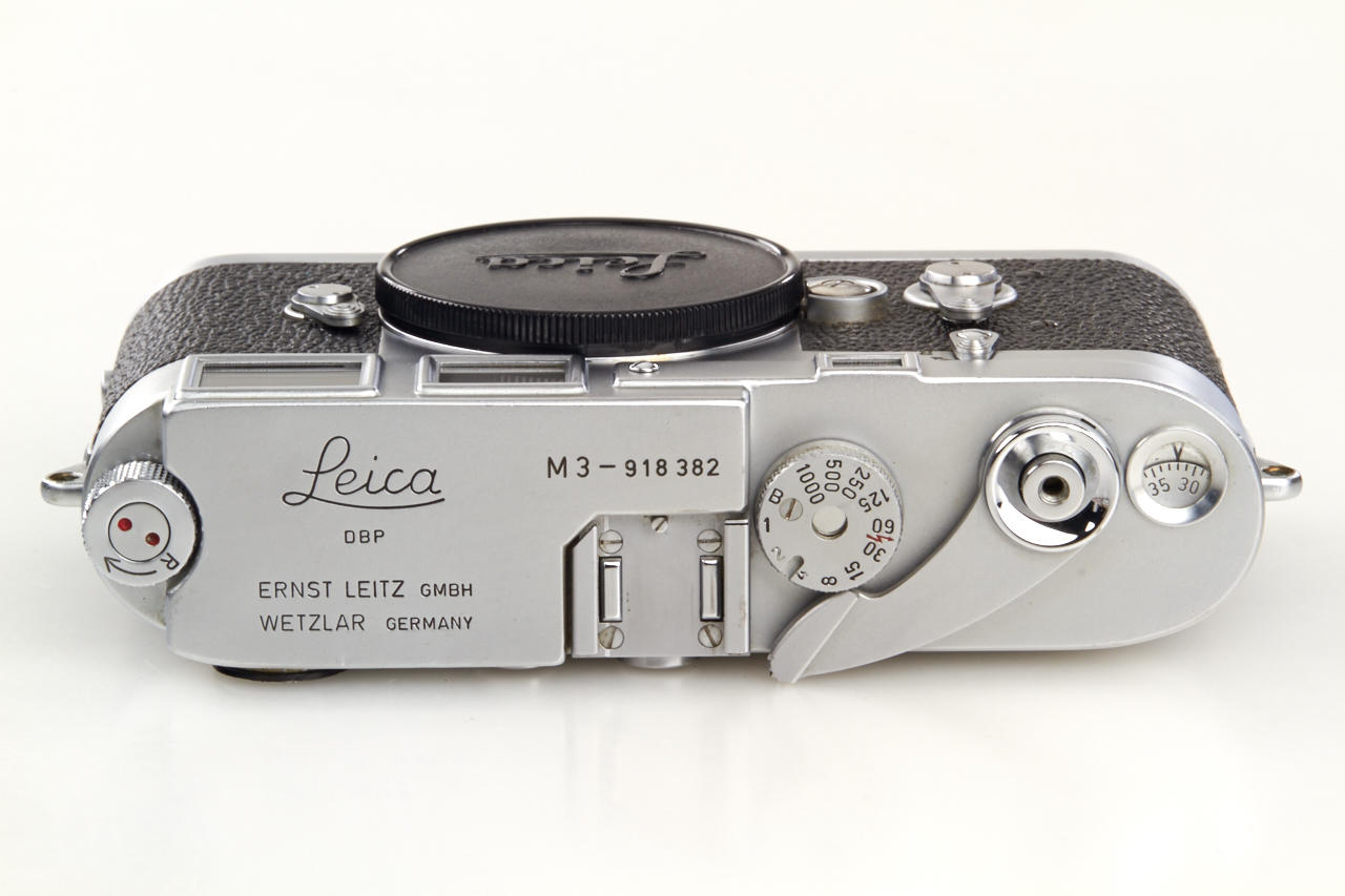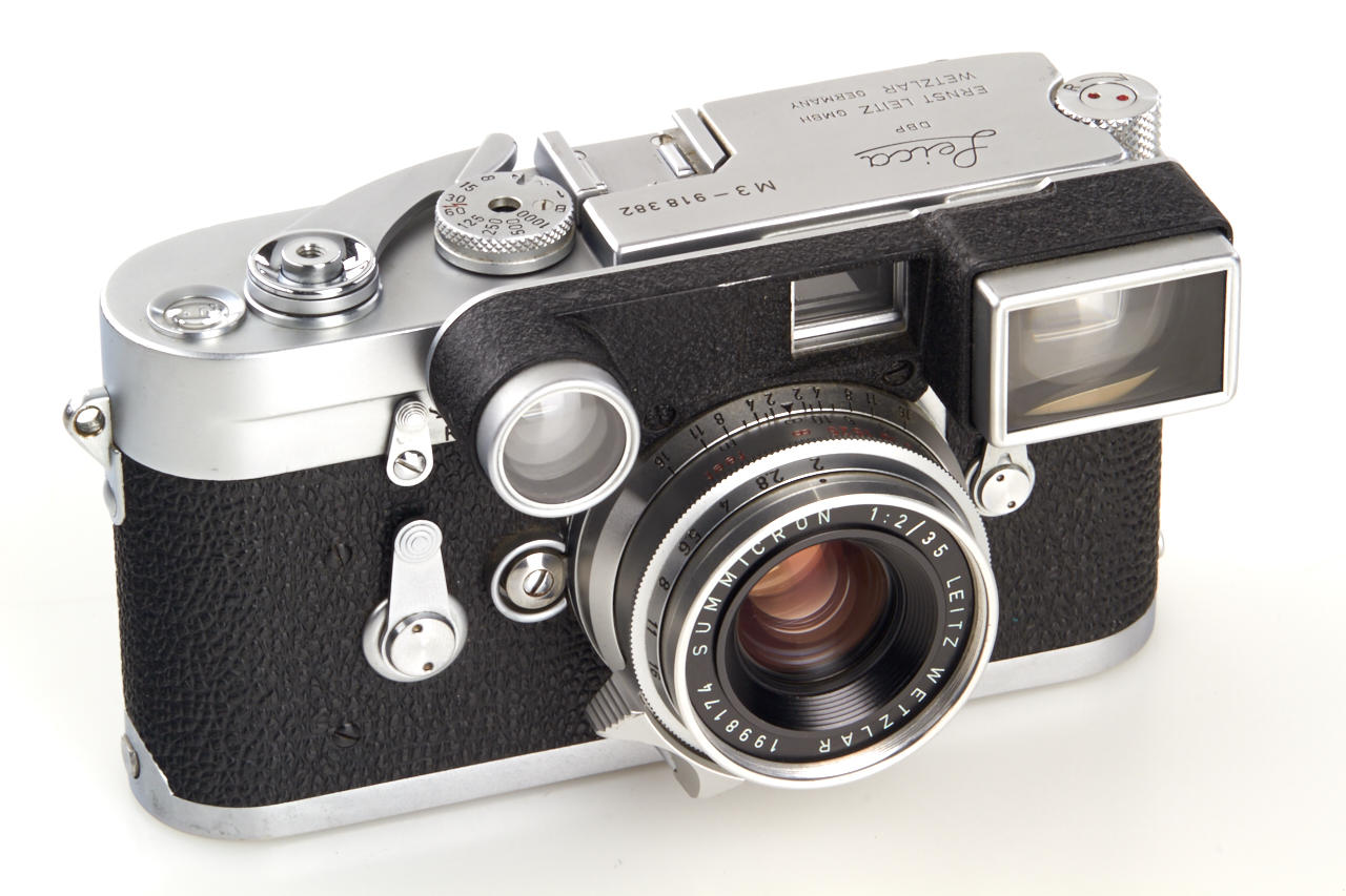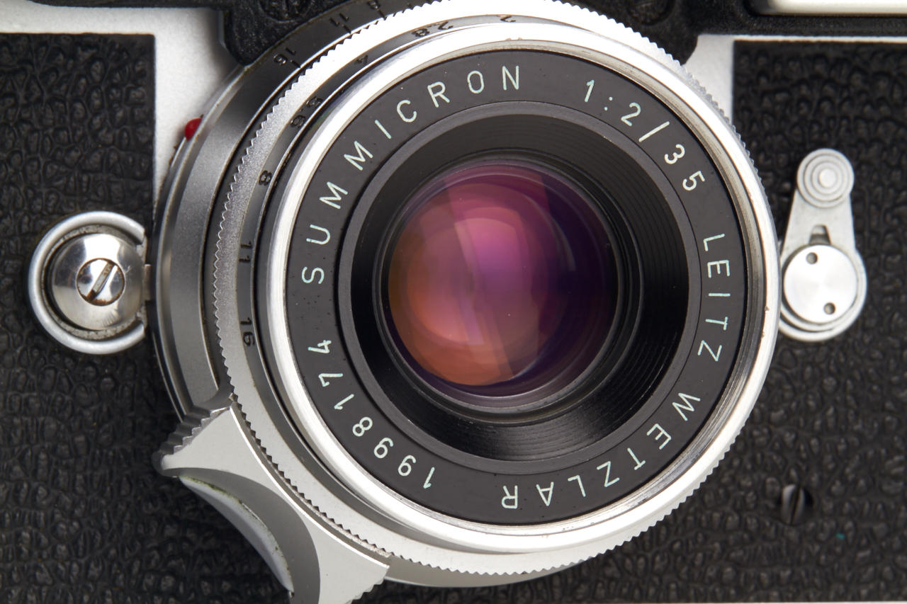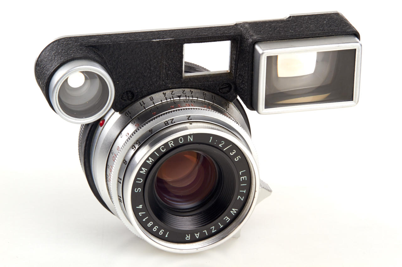 First owners outfit including fine double stroke body in perfect working order with red/gold inspections card (few little marks, condition B+), mint 8-element M3 Summicron 2/35mm no.1998174 with perfect optics (original maker's box, sales invoice from 1964, both caps), near mint Elmarit 2.8/90mm no.1693365 (both caps)