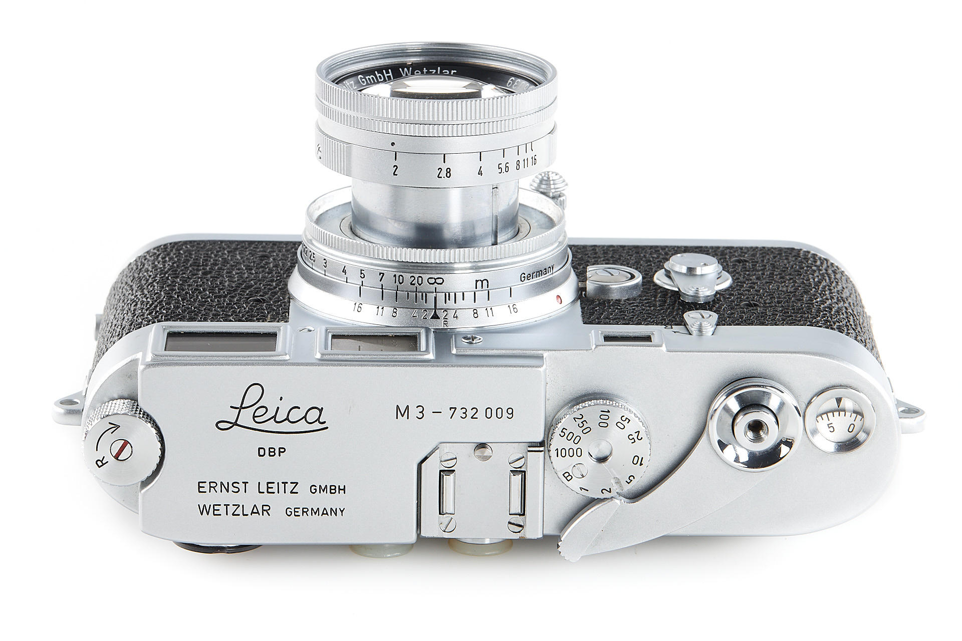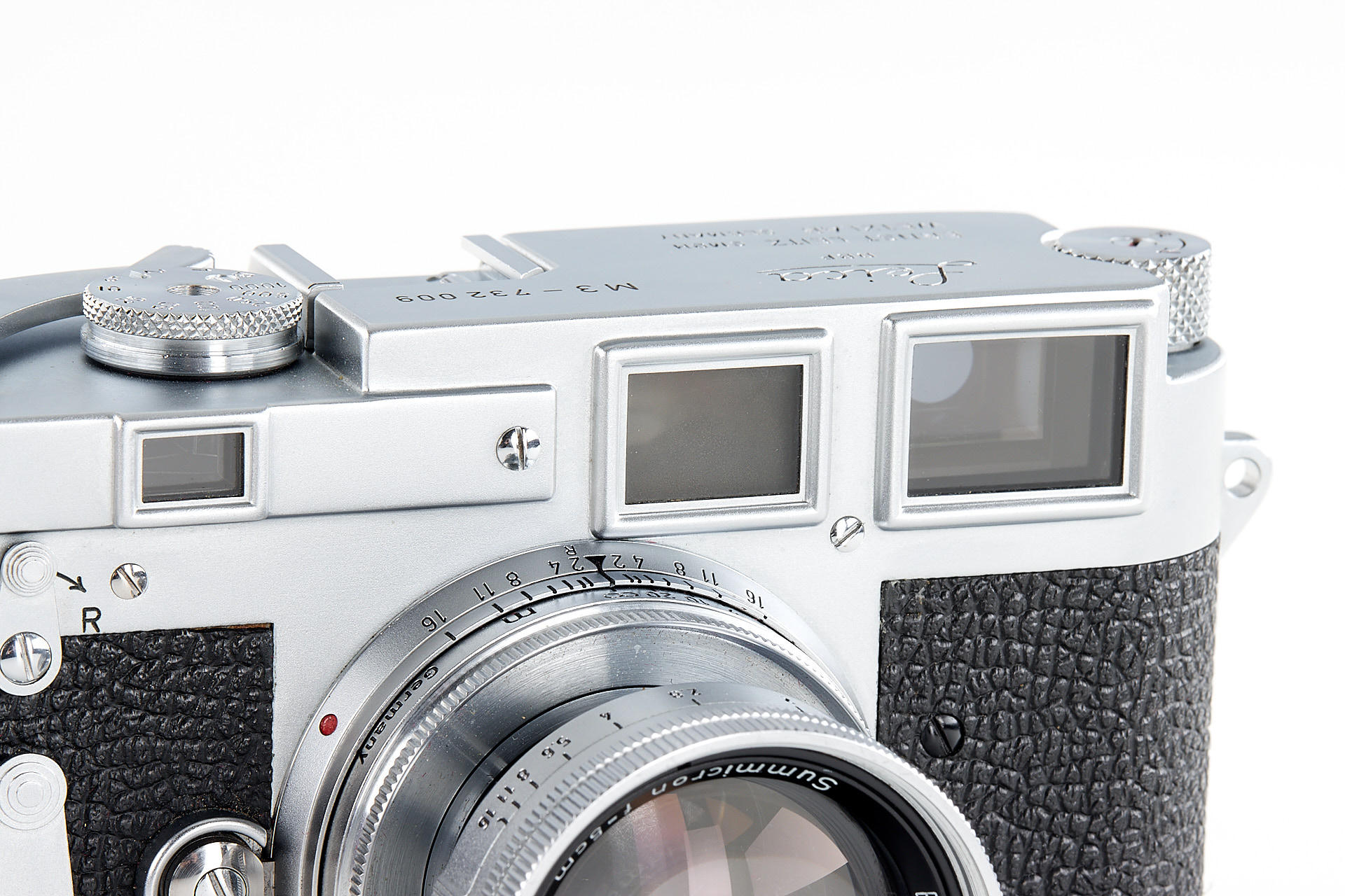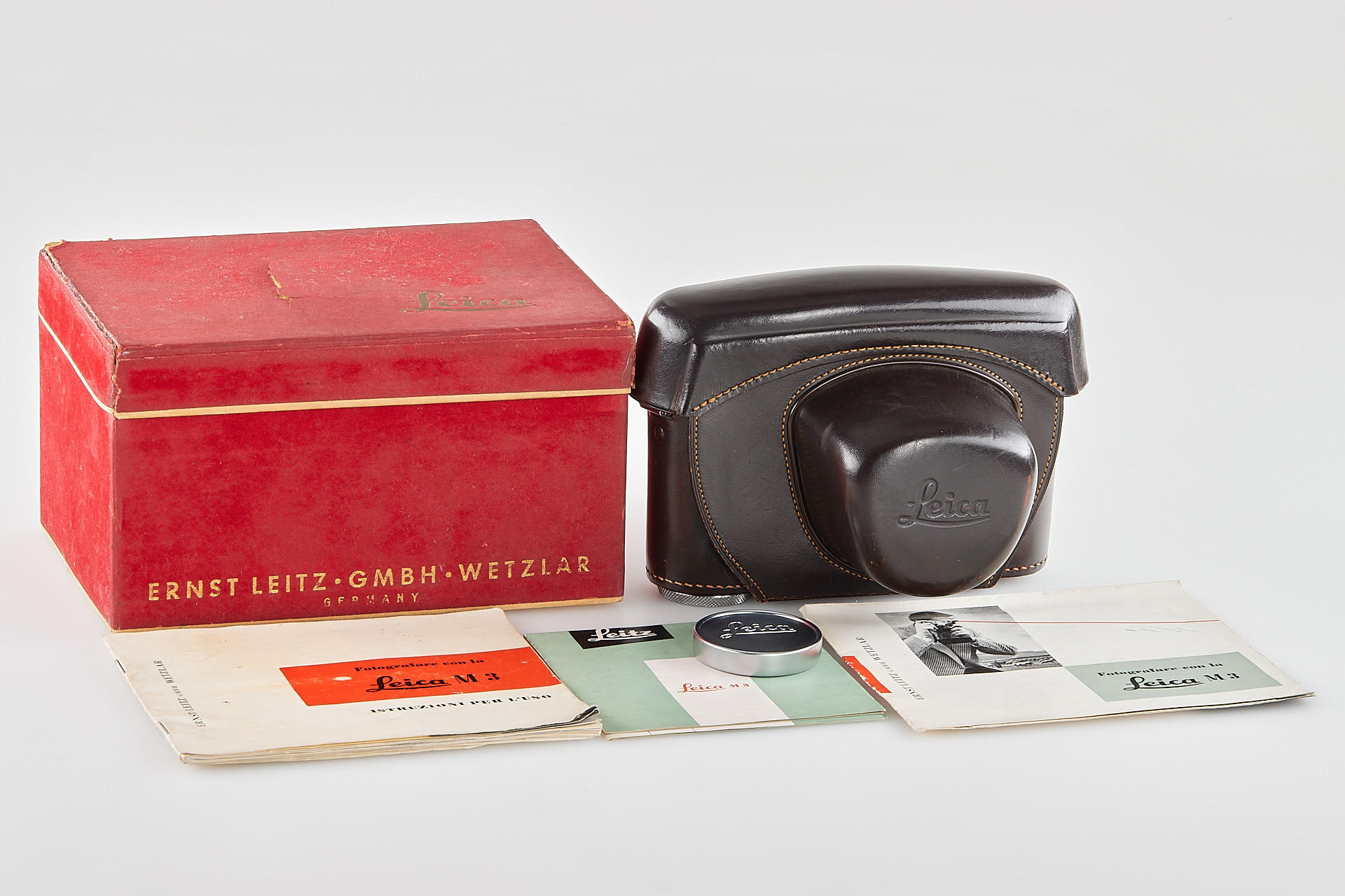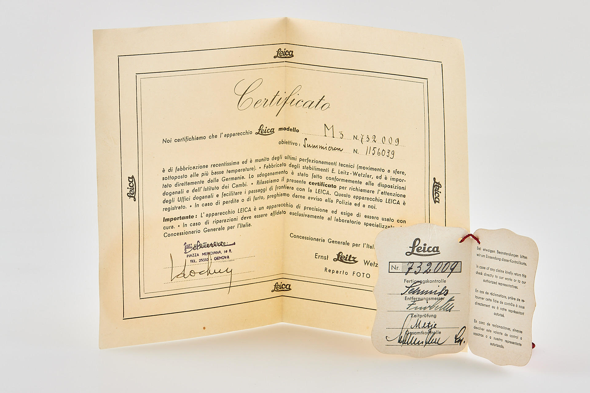 an early M3 body in beautiful, almost mint condition and very good working order, with matching early collapsible Summicron 2/5cm no.1156039 (near mint, slight cleaning marks on the front element, front cap), original control tag with matching number, red maker's box with matching camera number, leather case, Italian instructions and brochure from 1954, very uncommon certificate with matching serial number of the camera and the lens