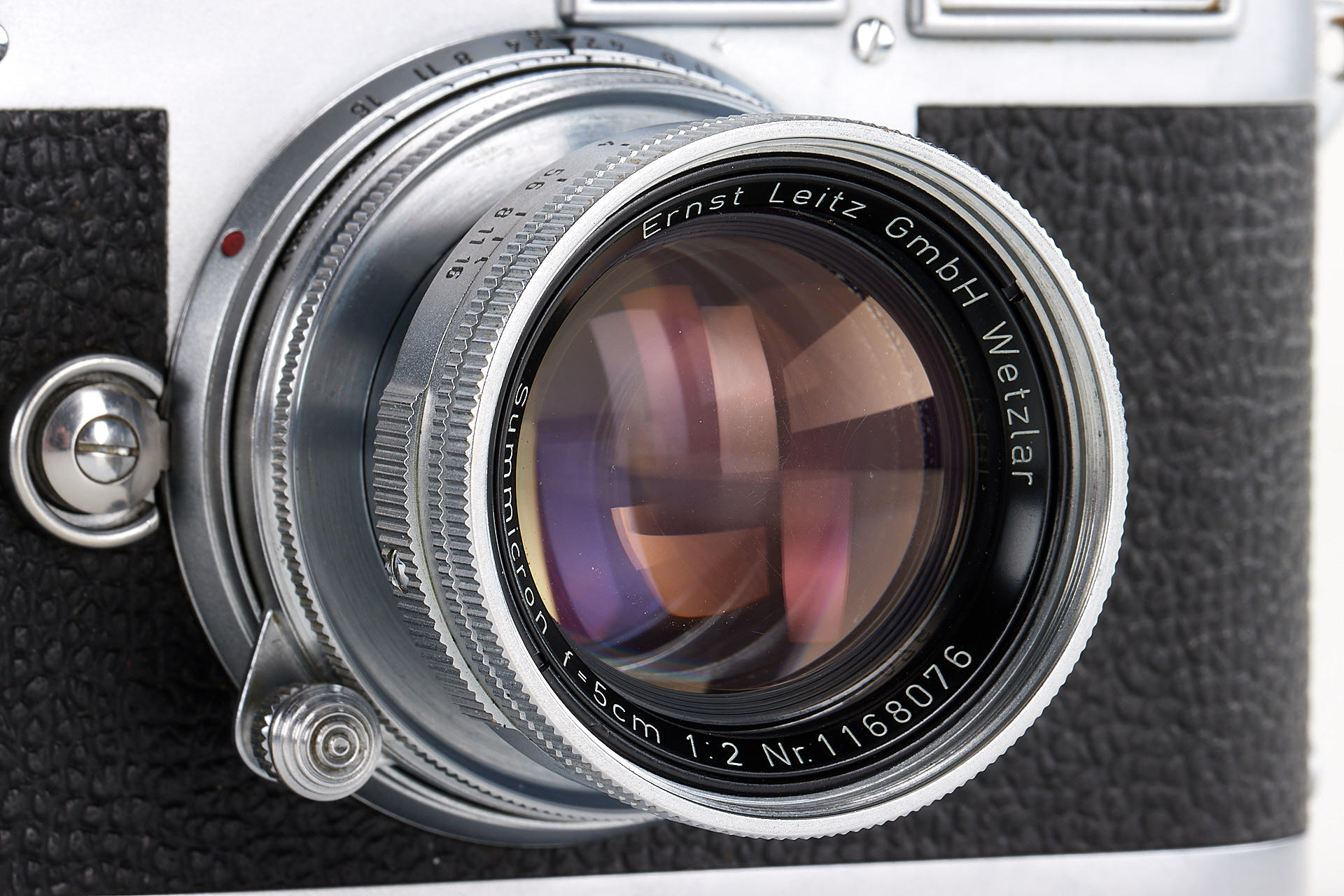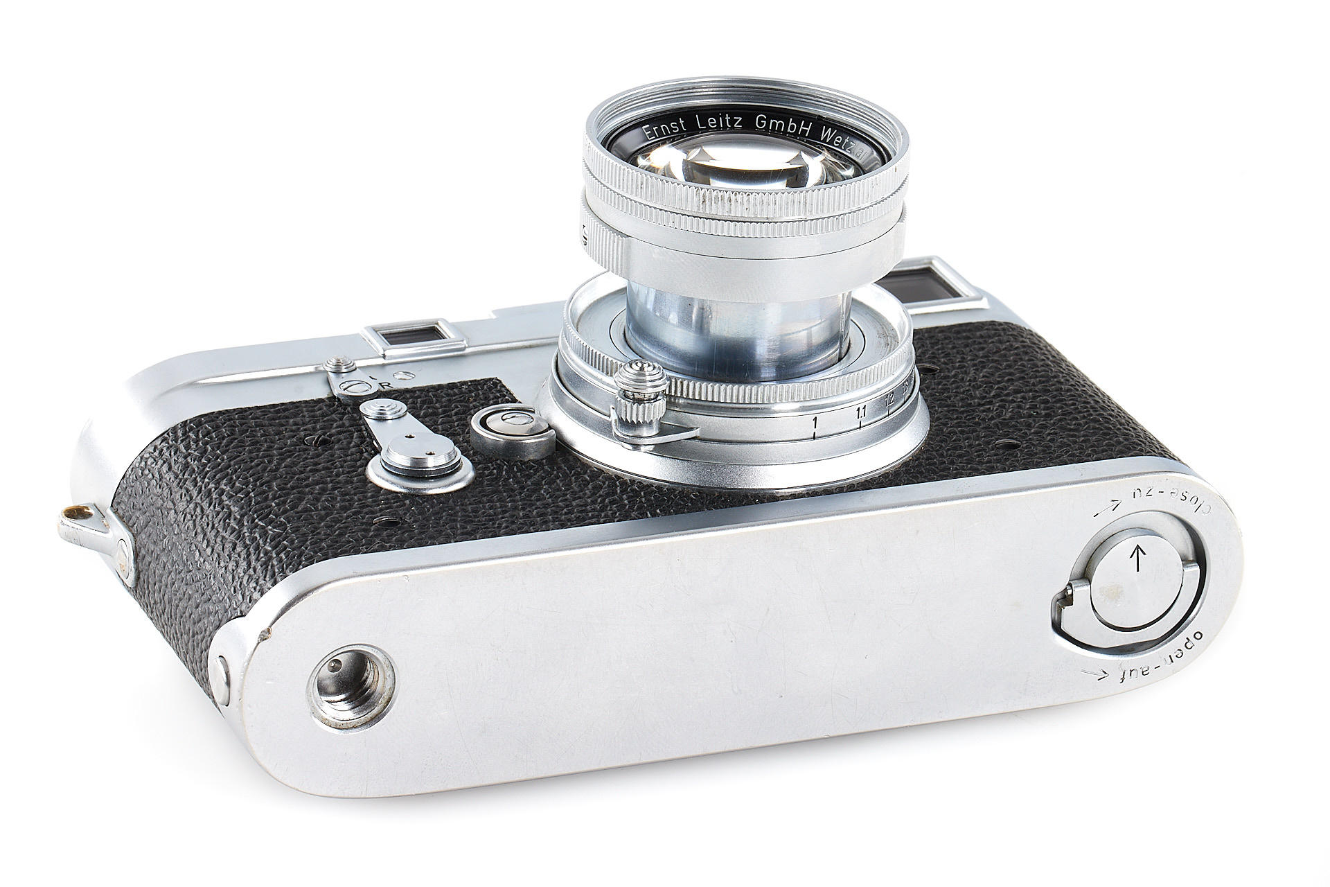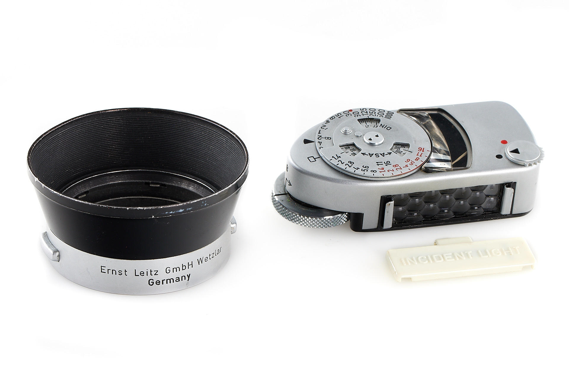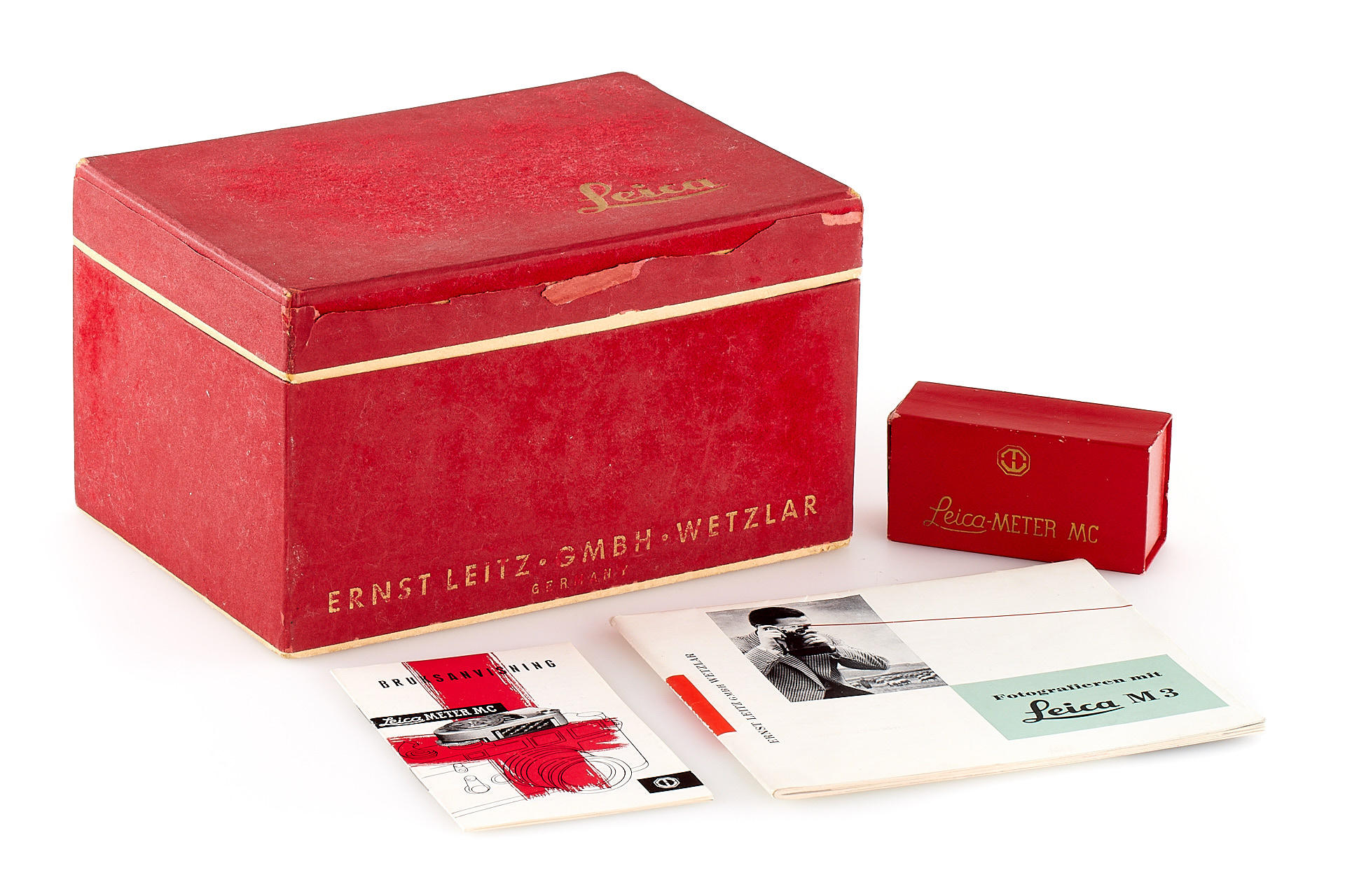 quite early body with all original features, in very good condition and working order, rangefinder with good contrast, with Summicron 2/5cm no.1168076 (1954) with good lenses only showing some light haze and very few cleaning marks, front lens cap, hood IROOA, Leicameter MC no.60545 (not reacting) German instructions, ever ready case and matching red maker's box
