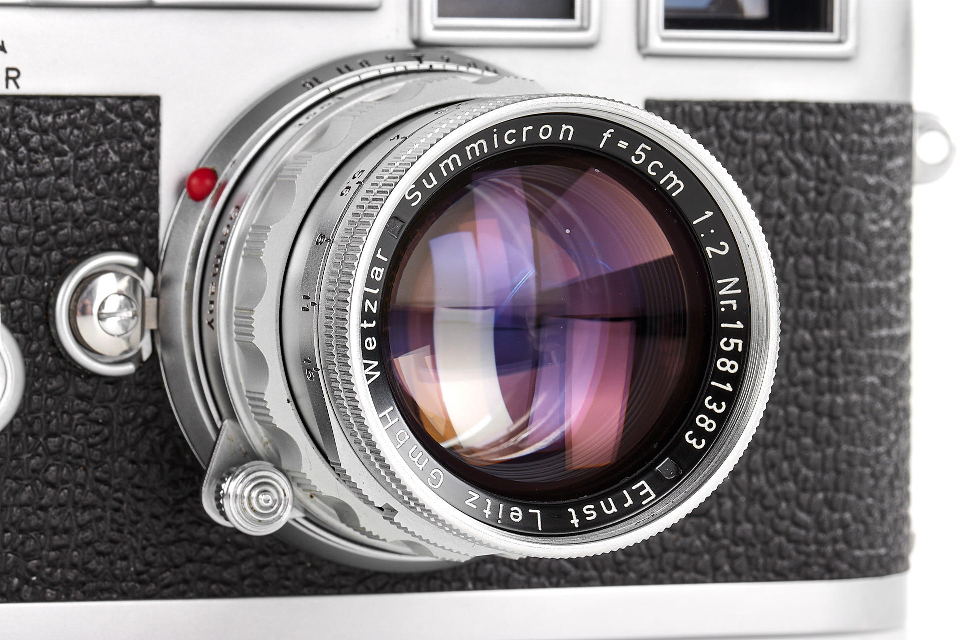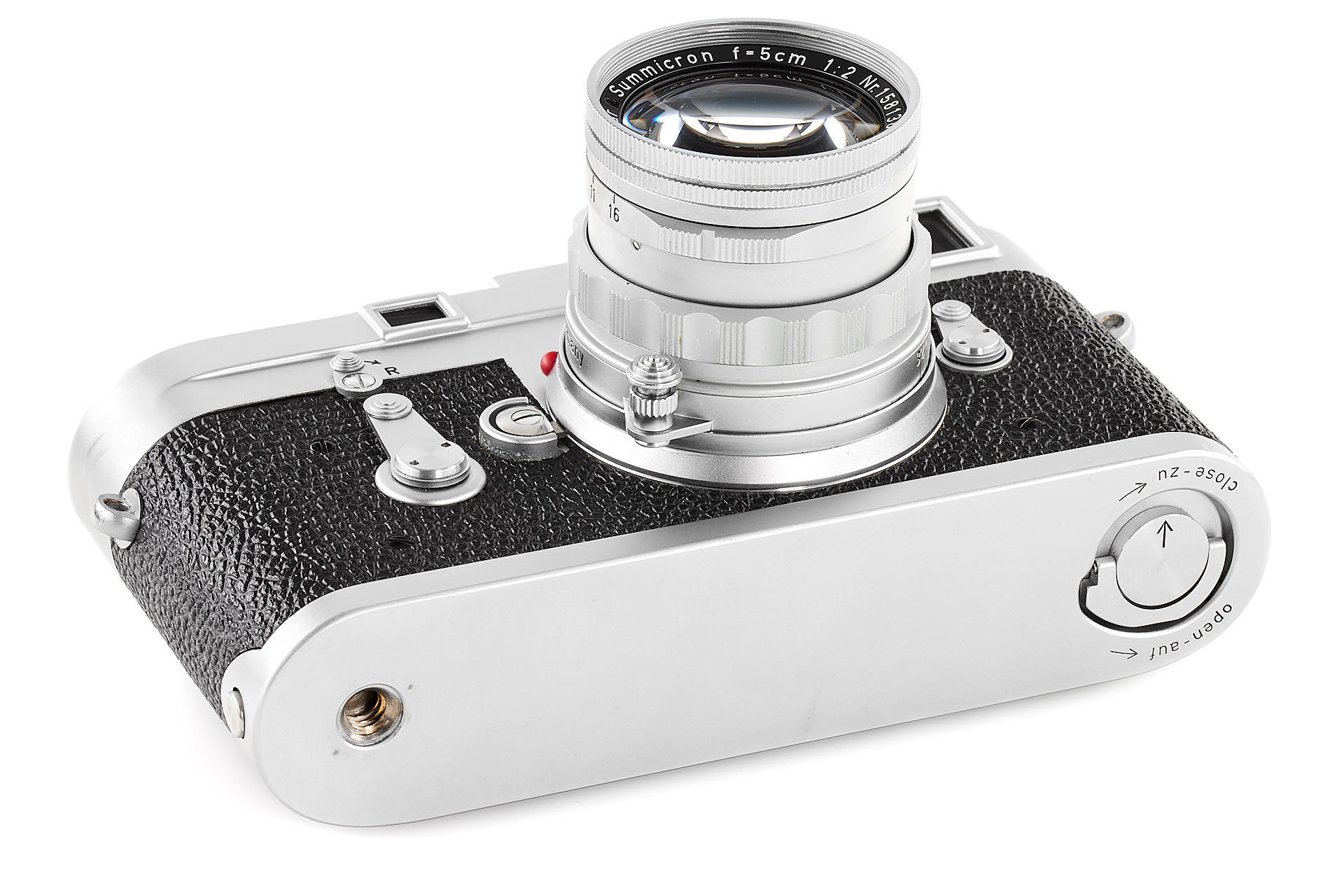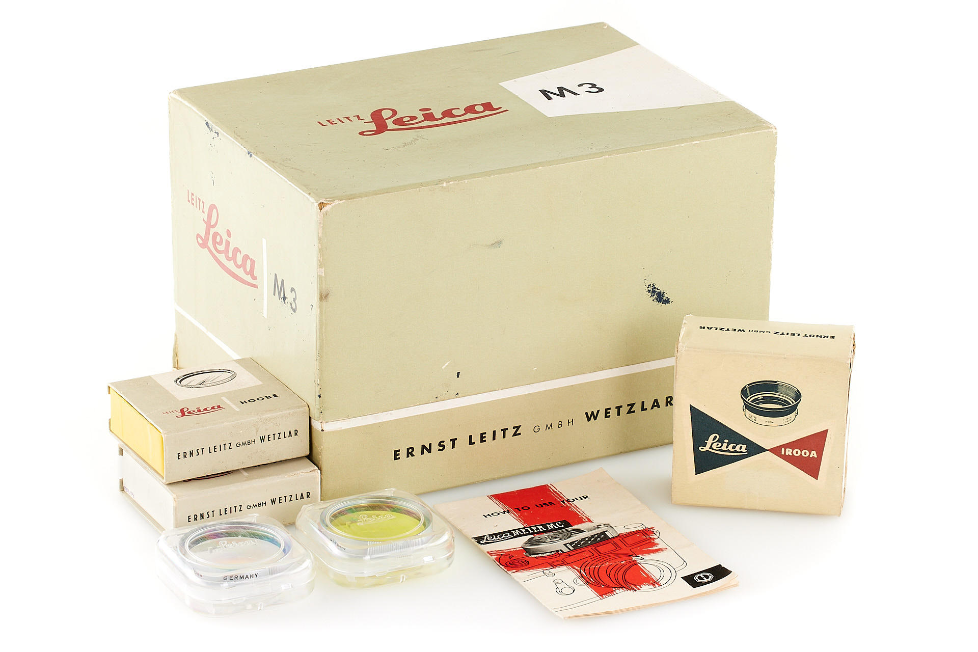 Body in near mint and original condition, in good working order, with matching Summicron rigid no.1581383 with almost perfect lenses (front lens cap), with IROOA hood, UV and yellow filters (all with maker's boxes), ever ready case and original maker's box with both body and lens matching serial numbers