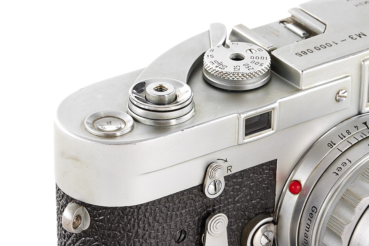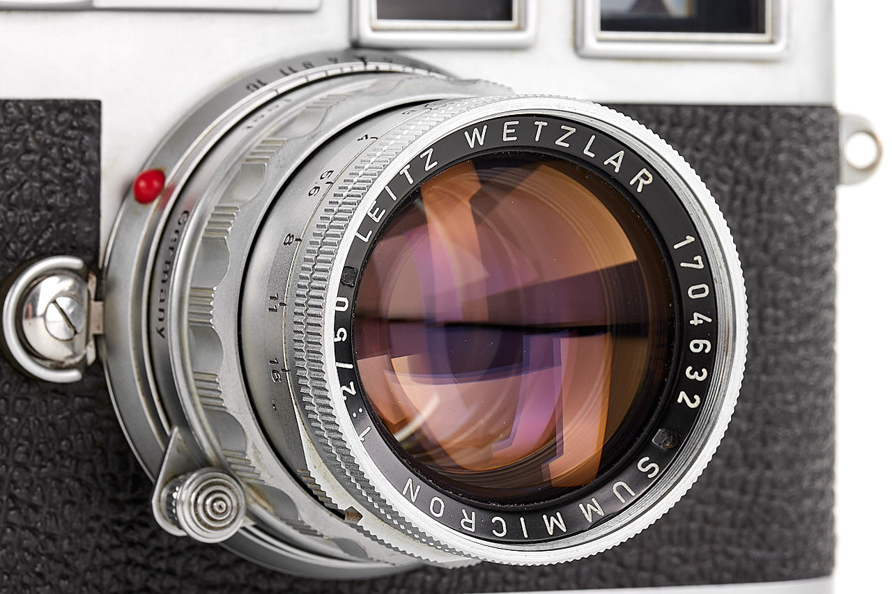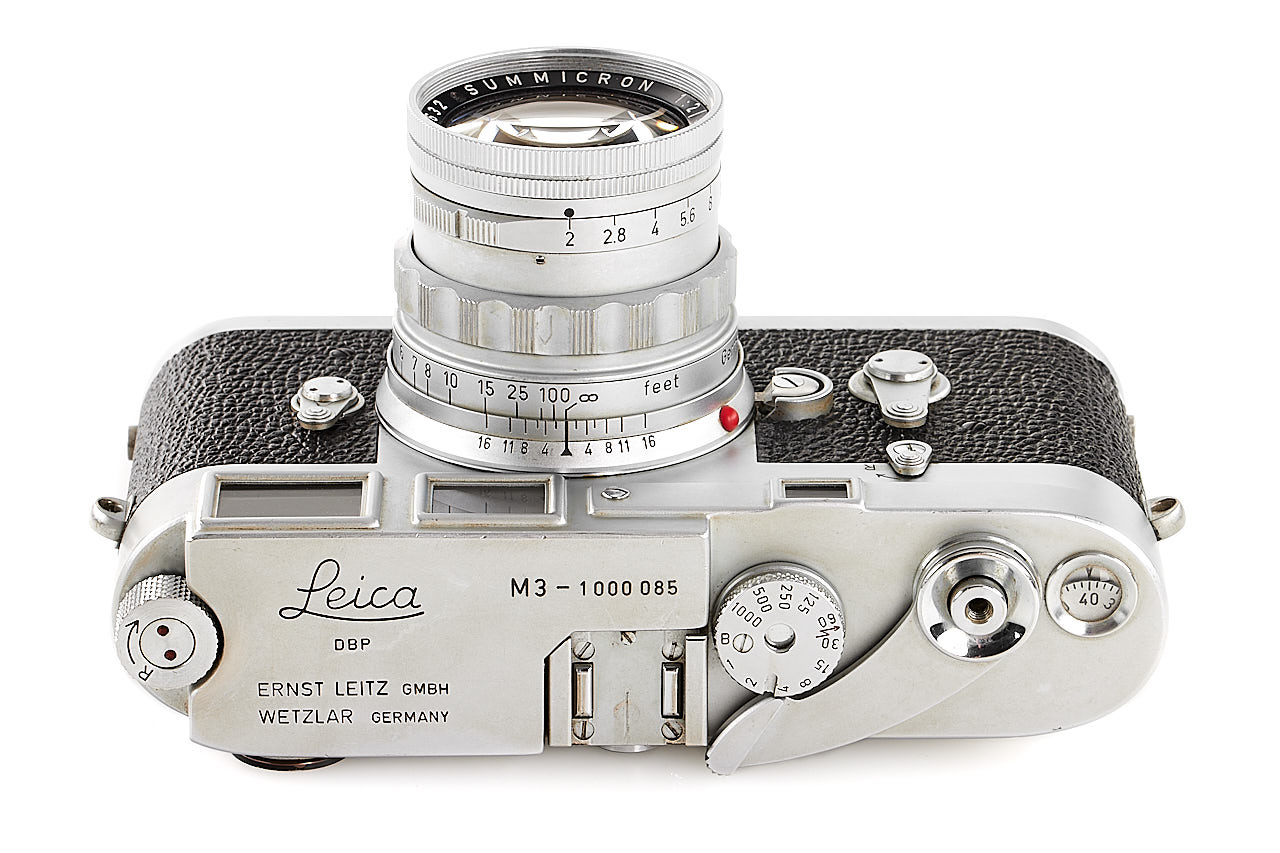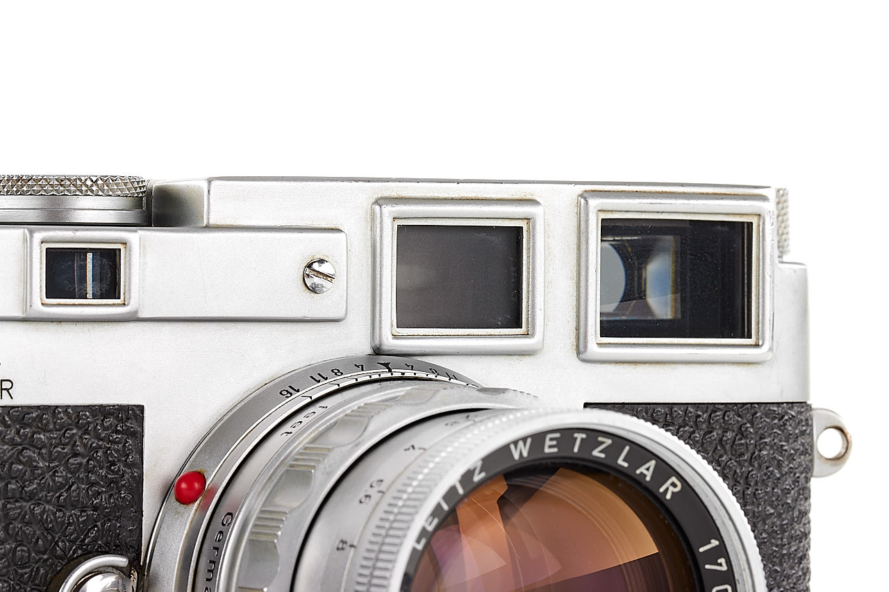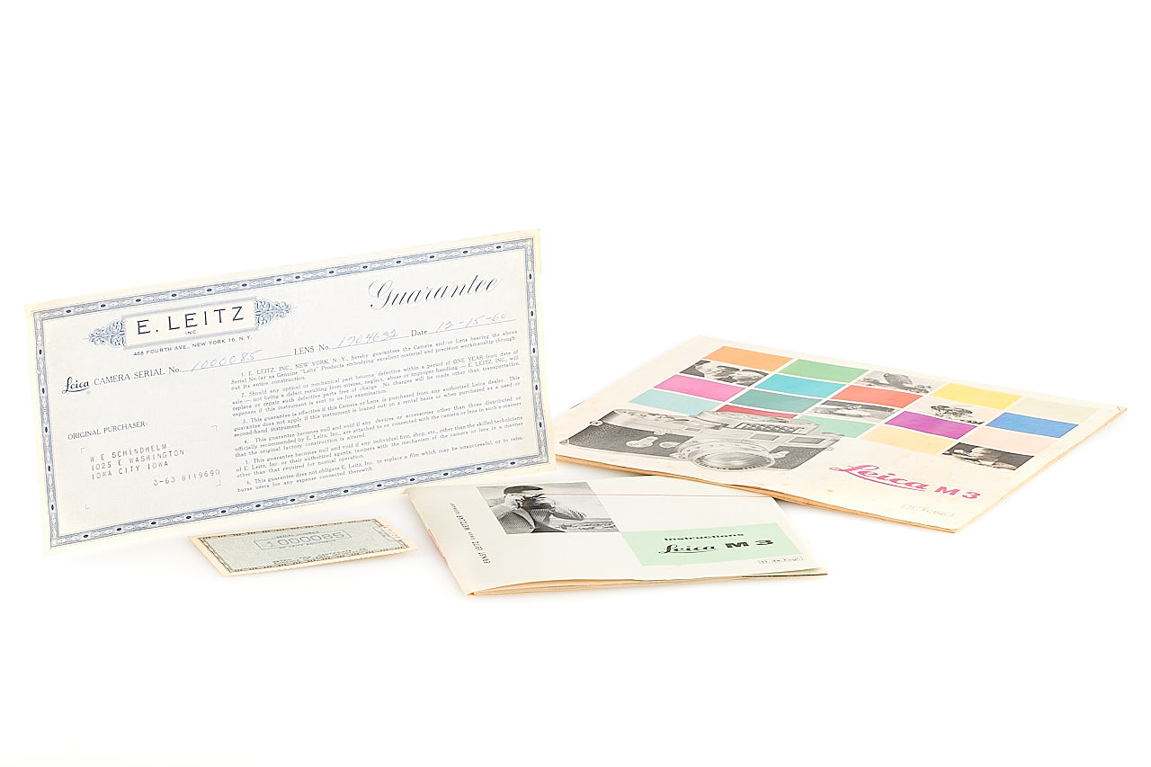 A classic, single-stroke Leica M3 with a distinctive serial number, in very nice condition and in working order, only a few signs of use, missing vulcanite on the back door, with matching rigid Summicron 2/50mm in feet scale no.1704632, good optics, with front lens cap, leather strap, instructions, papers, warranty card and import certificate, both the body and lens were delivered to Manca, New York in 1960.