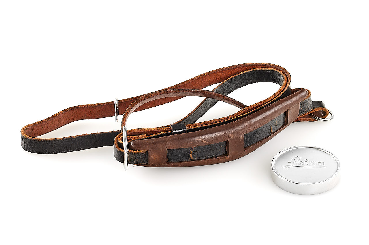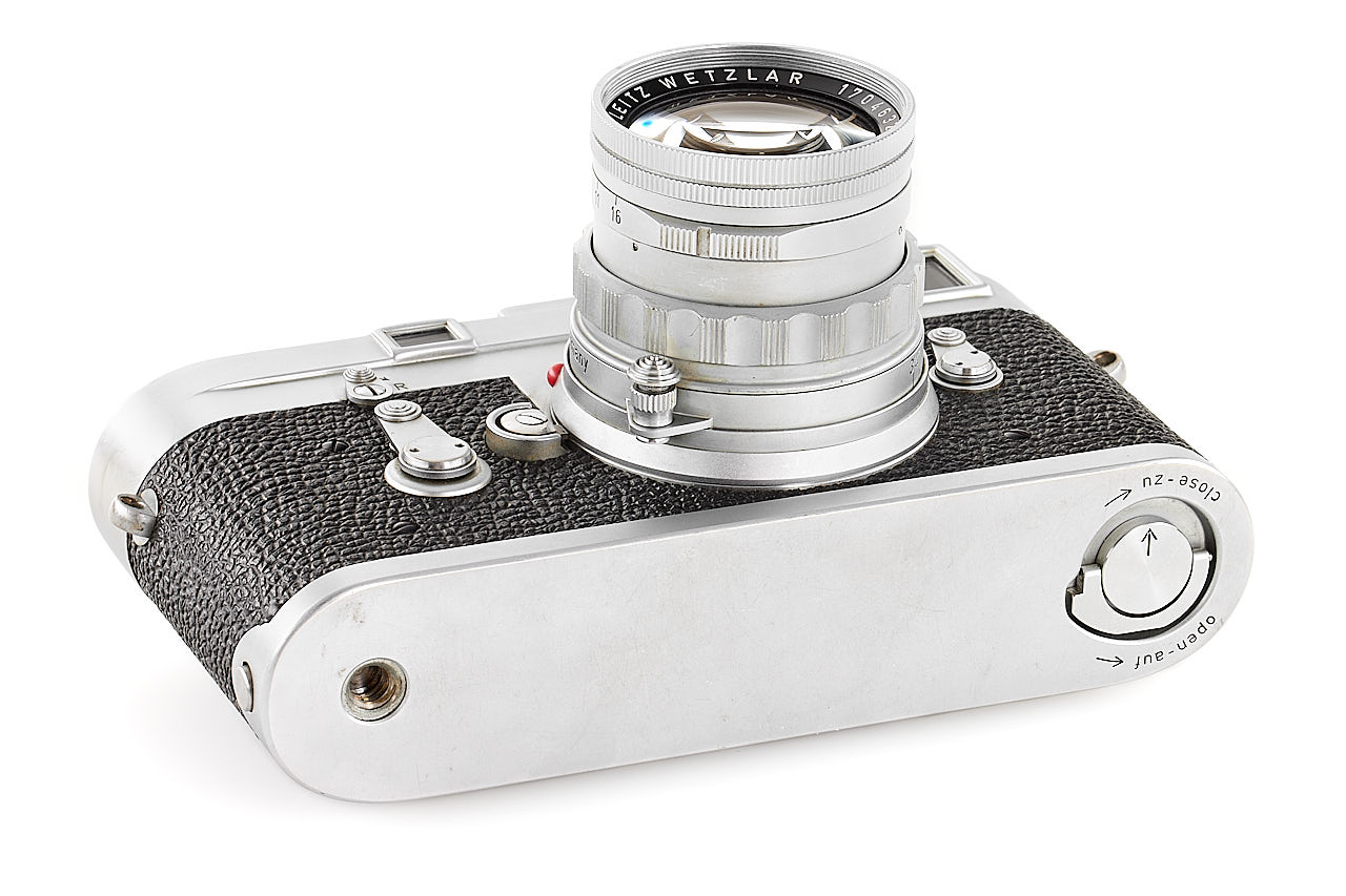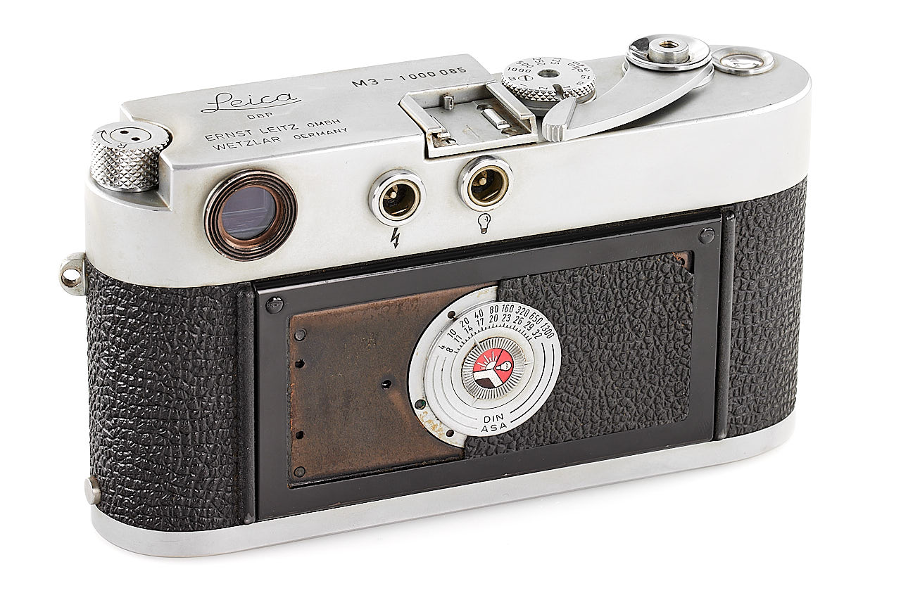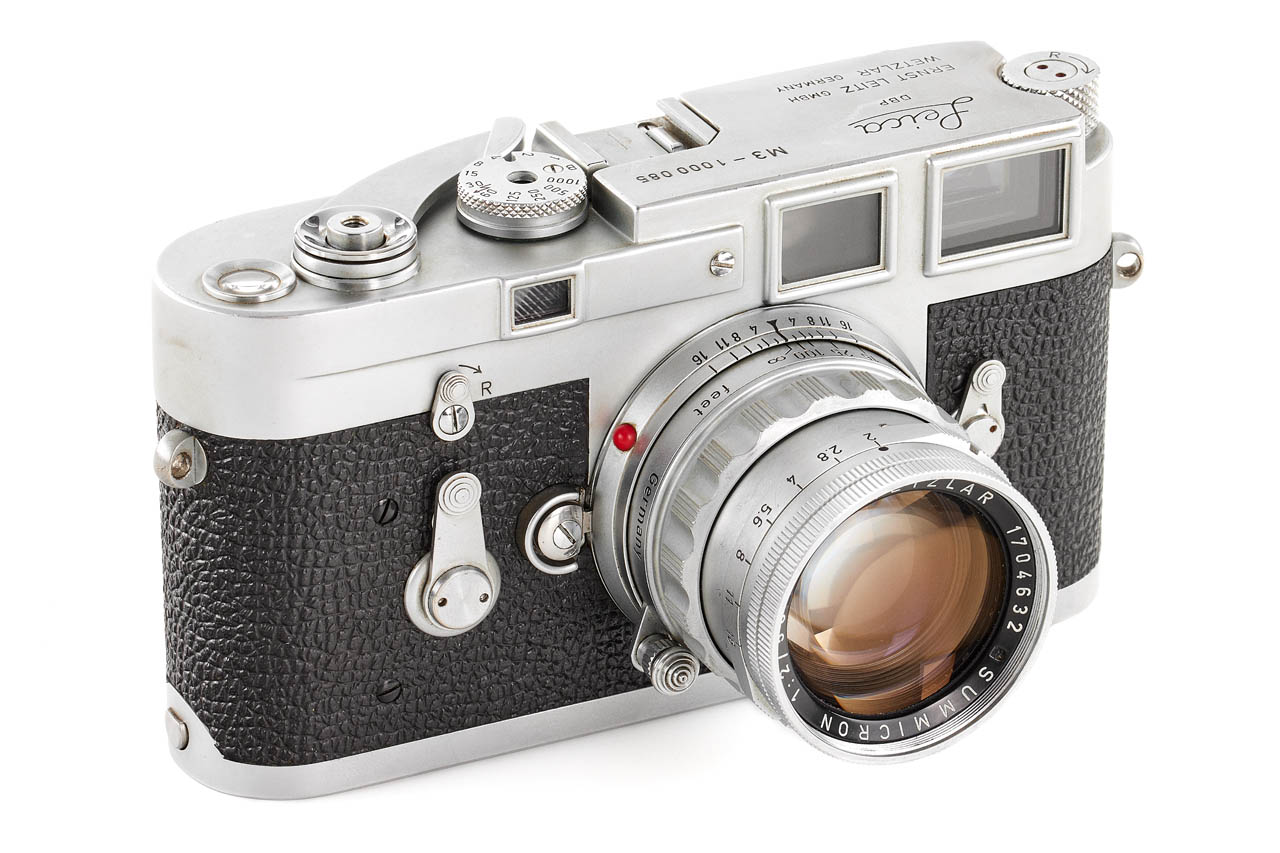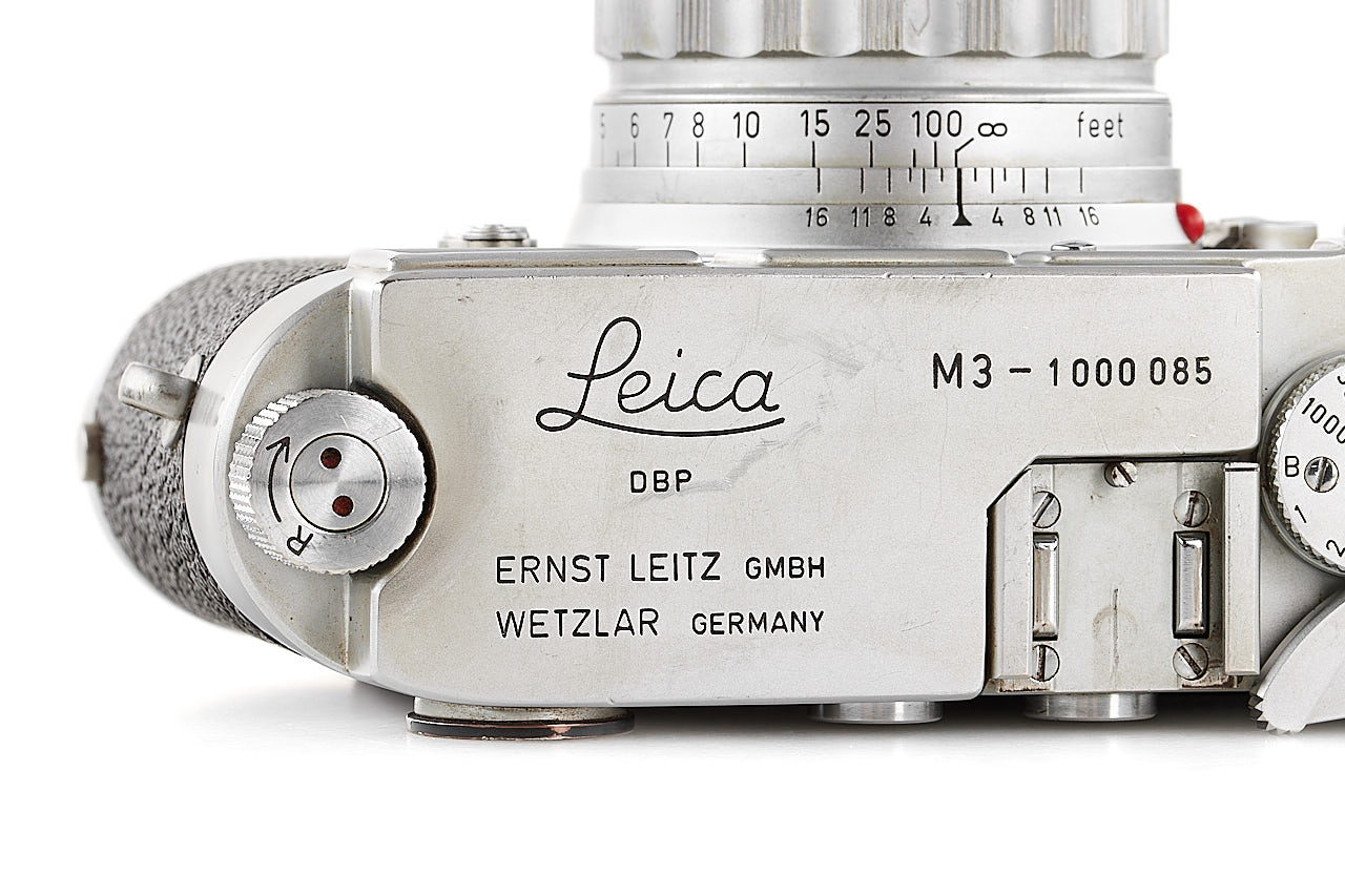 A classic, single-stroke Leica M3 with a distinctive serial number, in very nice condition and in working order, only a few signs of use, missing vulcanite on the back door, with matching rigid Summicron 2/50mm in feet scale no.1704632, good optics, with front lens cap, leather strap, instructions, papers, warranty card and import certificate, both the body and lens were delivered to Manca, New York in 1960.