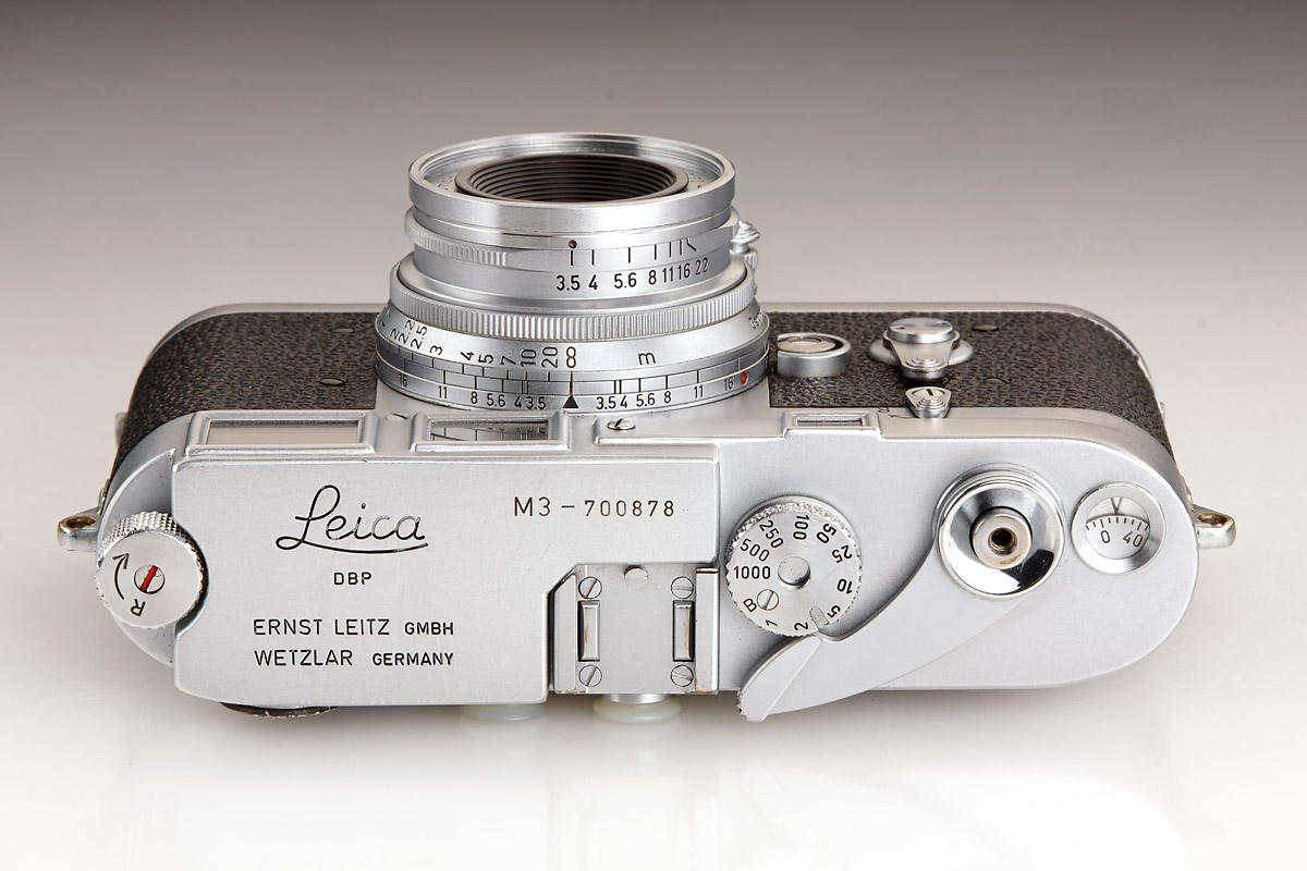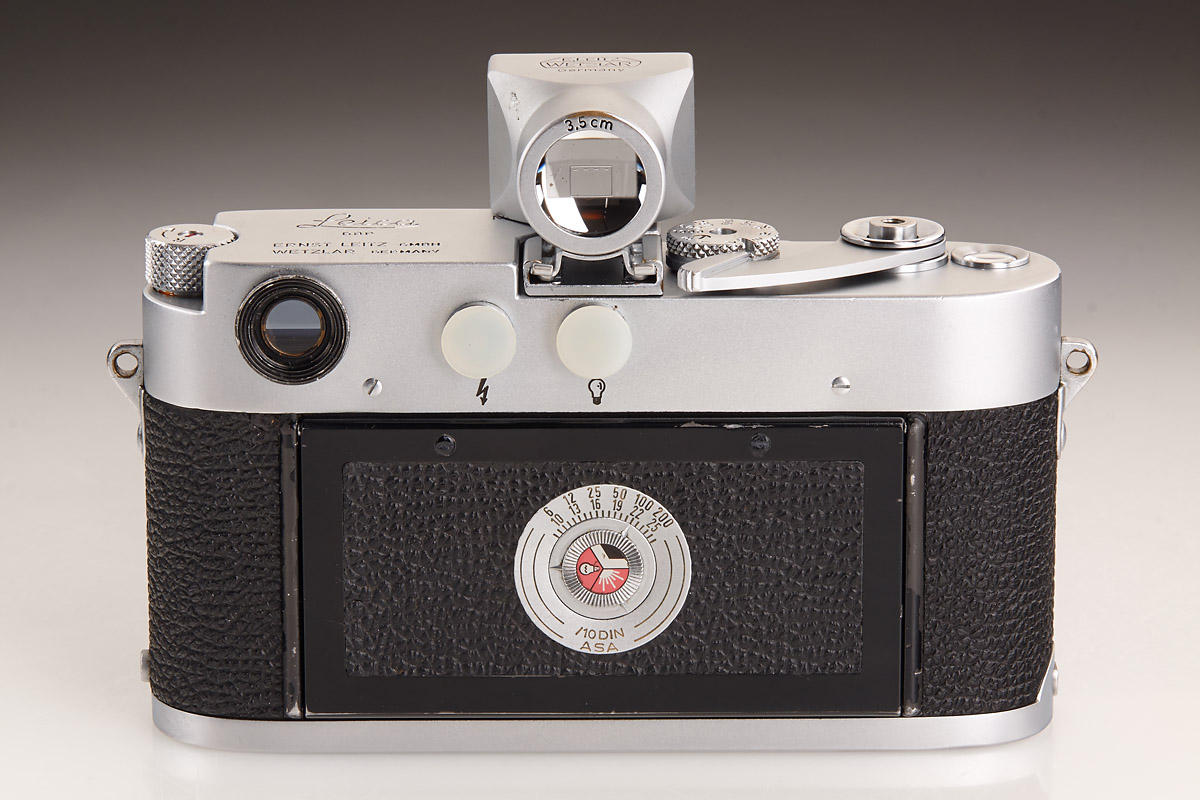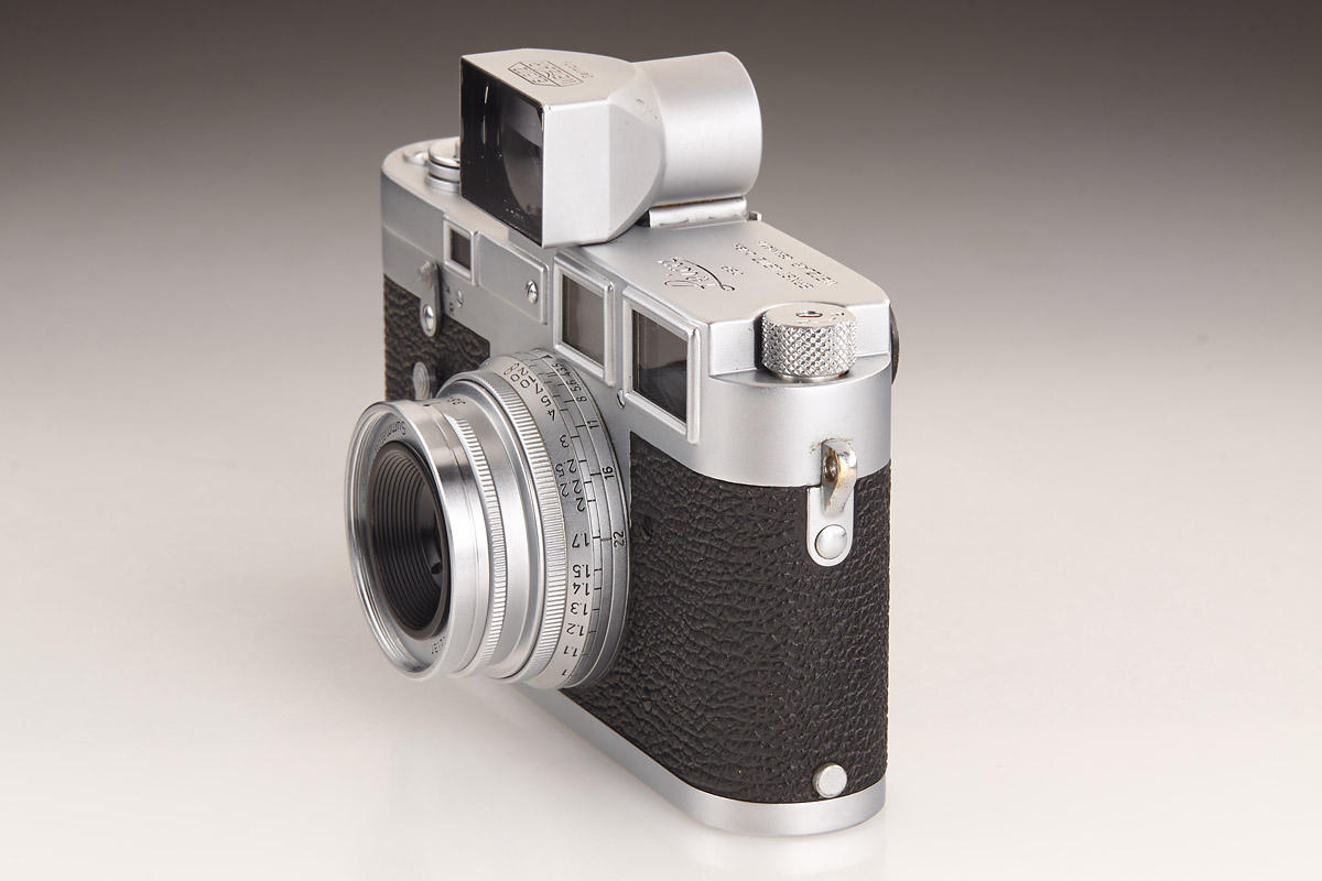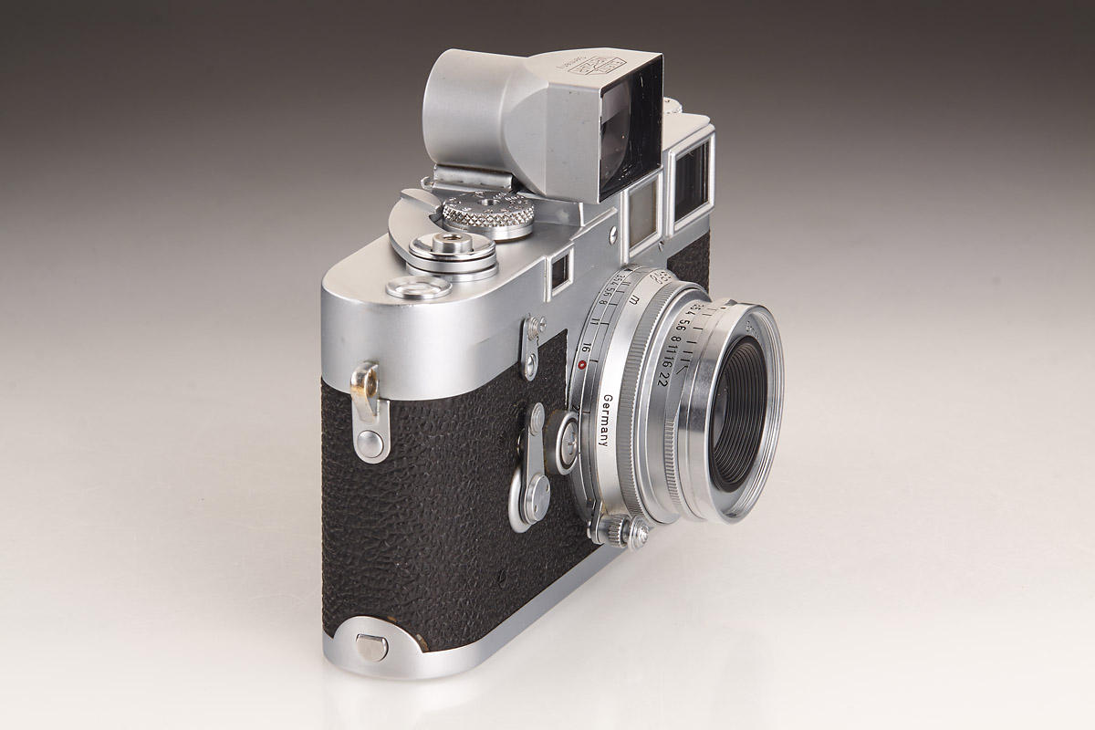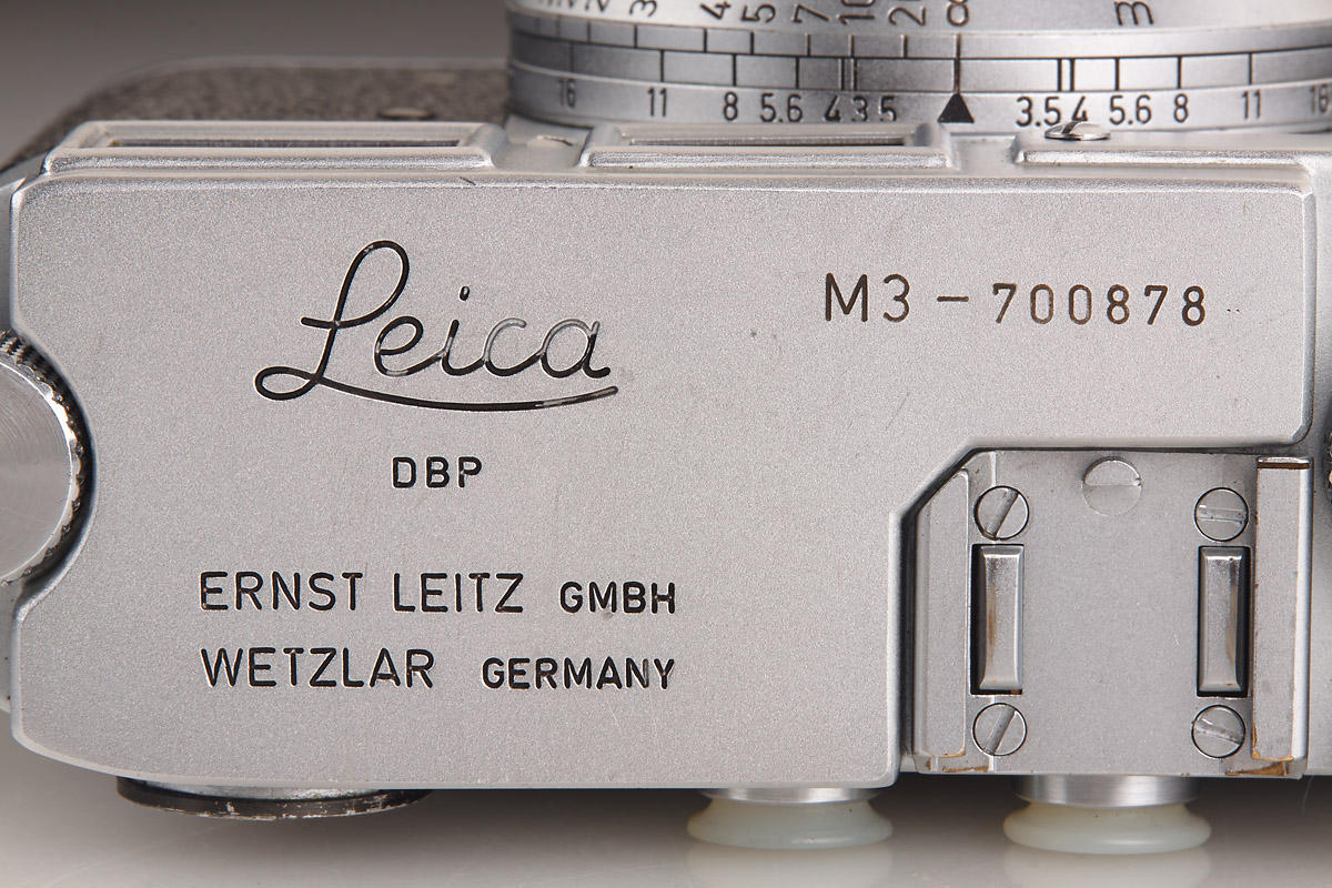 LEICA M3 with un-numbered (prototype or sample) Summaron 3.5/3.5 cm, matching 3.5 cm SBLOO BL finder, IROOA hood and cap. Early M3 from a small batch of 200 cameras (700801-701000), second version (double stroke) with all original features, in very good condition with clean finder and perfect shutter. All in all, 10,000 M3 cameras were produced in the first year, rising to almost 50,000 units in 1955. After more than 225,000 cameras in different versions, the production of the first M-camera was terminated in 1968. Frühe M3 aus einer kleinen Serie von 200 Kameras (700801-701000), es ist dies die zweite Version der M3 mit Doppelaufzug in sehr schönem und funktionierendem Originalzustand, Im ersten Jahr wurden 10.000 M3 Kameras fertiggestellt, 1955 waren es bereits 50.000 Einheiten. Nach mehr als 225.000 Kameras in verschiedenen Ausführungen wurde die Produktion der ersten M-Kamera im Jahre 1968 beendet.