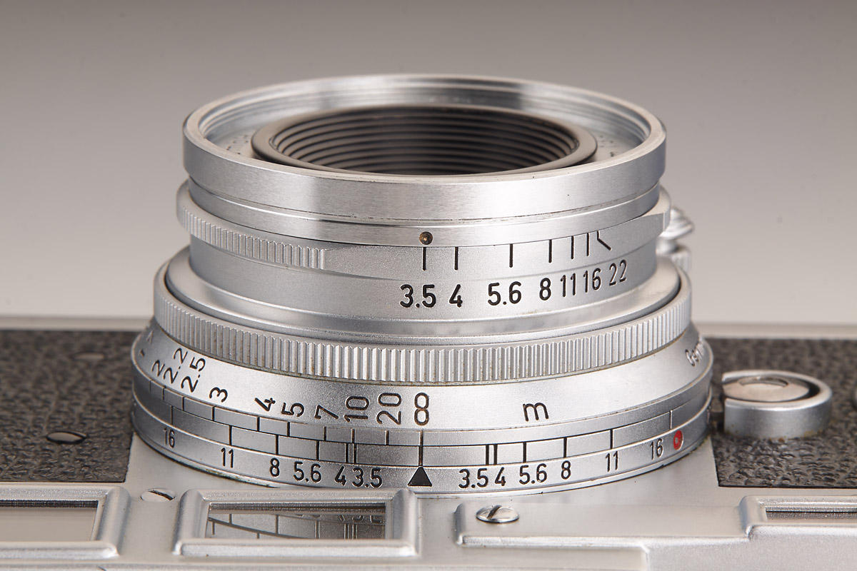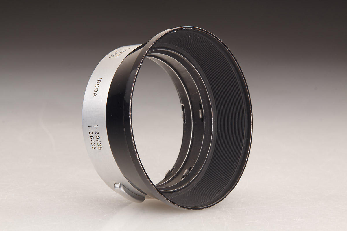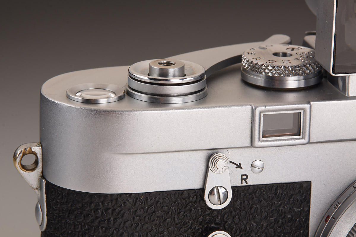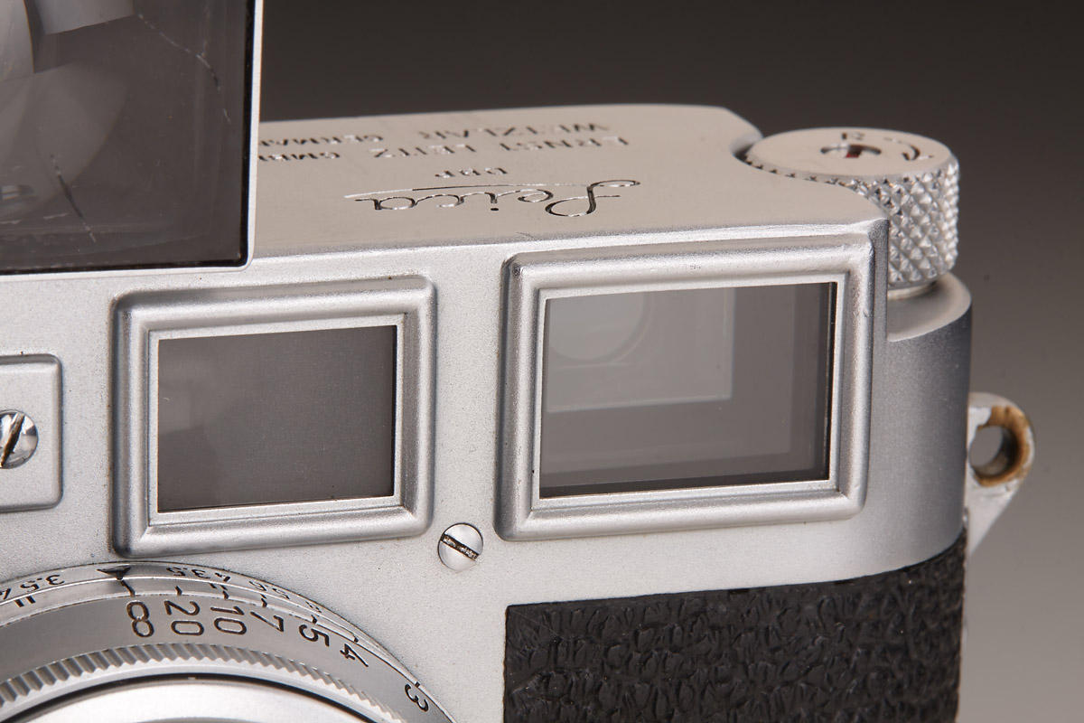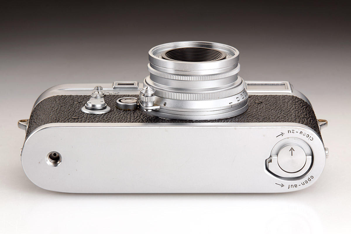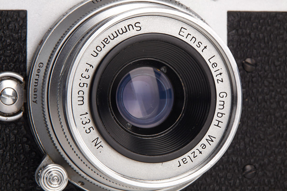 LEICA M3 with un-numbered (prototype or sample) Summaron 3.5/3.5 cm, matching 3.5 cm SBLOO BL finder, IROOA hood and cap. Early M3 from a small batch of 200 cameras (700801-701000), second version (double stroke) with all original features, in very good condition with clean finder and perfect shutter. All in all, 10,000 M3 cameras were produced in the first year, rising to almost 50,000 units in 1955. After more than 225,000 cameras in different versions, the production of the first M-camera was terminated in 1968. Frühe M3 aus einer kleinen Serie von 200 Kameras (700801-701000), es ist dies die zweite Version der M3 mit Doppelaufzug in sehr schönem und funktionierendem Originalzustand, Im ersten Jahr wurden 10.000 M3 Kameras fertiggestellt, 1955 waren es bereits 50.000 Einheiten. Nach mehr als 225.000 Kameras in verschiedenen Ausführungen wurde die Produktion der ersten M-Kamera im Jahre 1968 beendet.