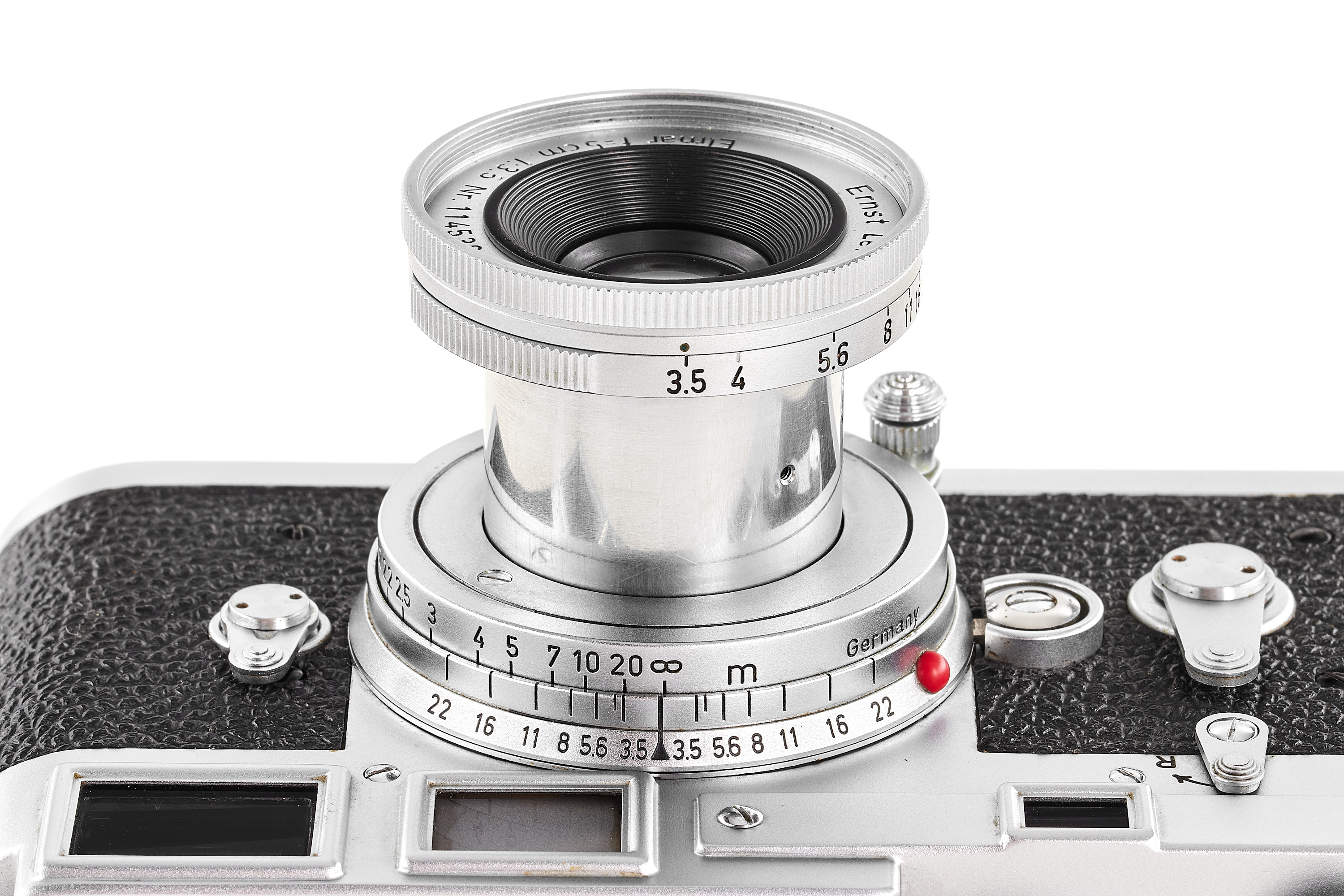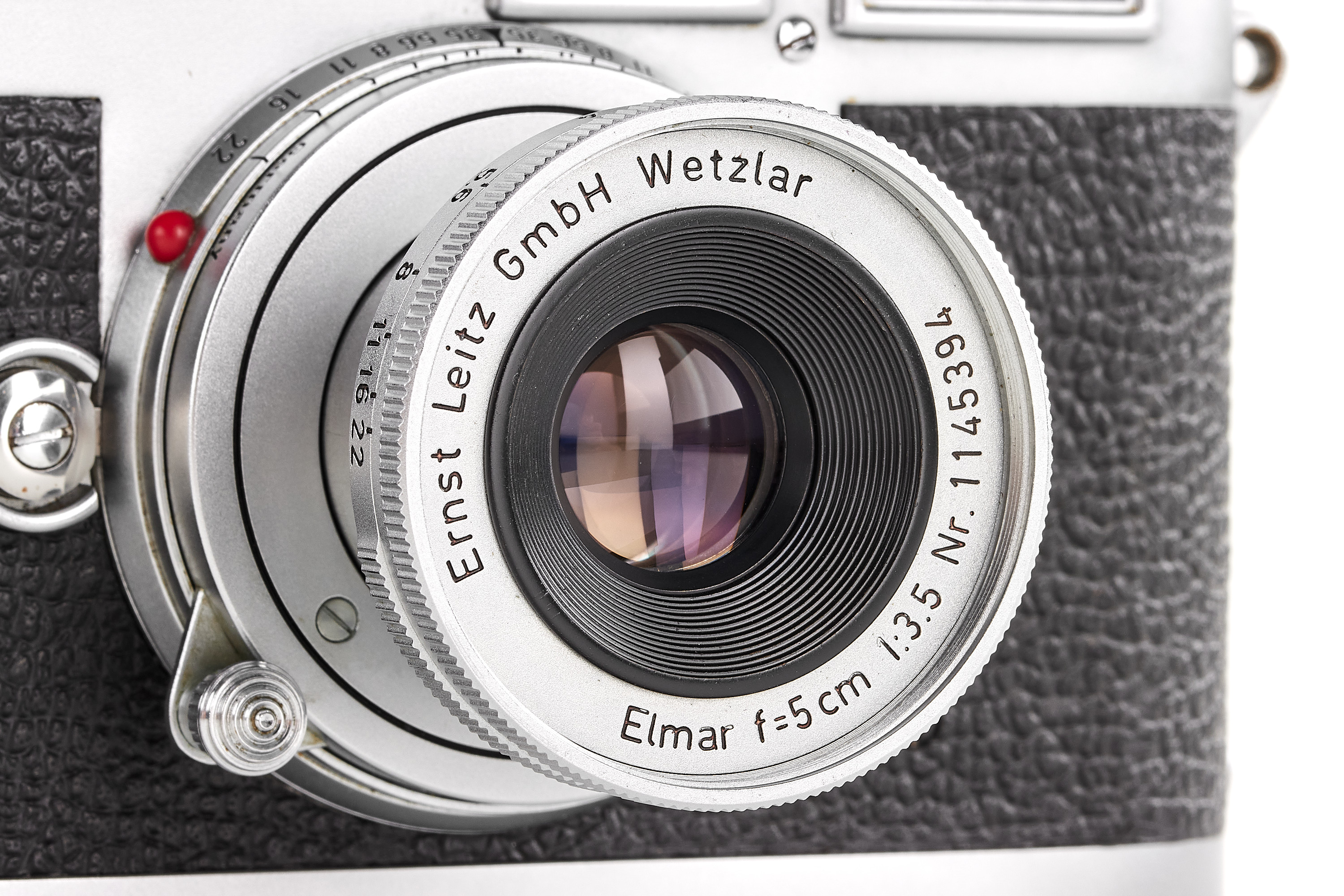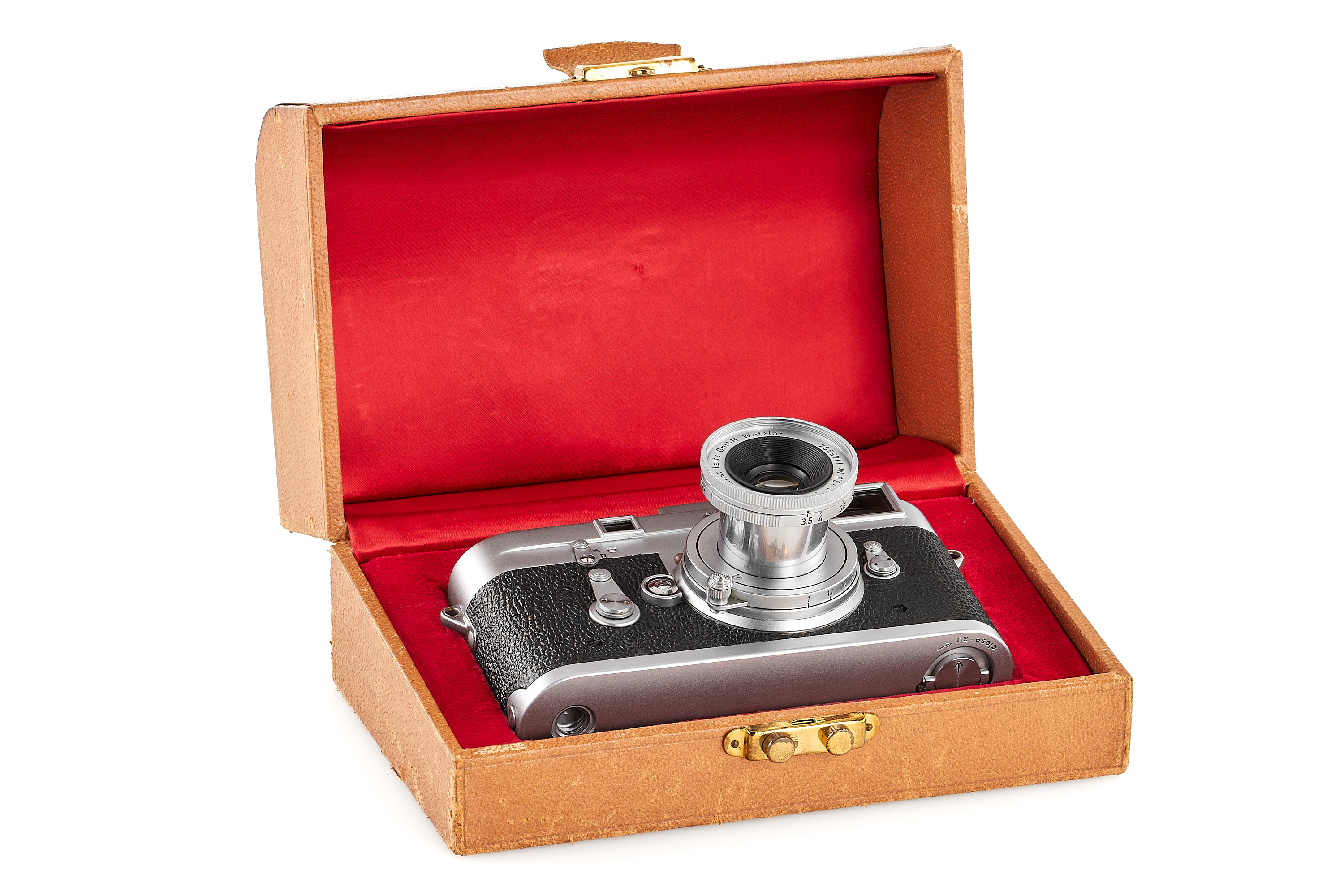 Diese Kamera ist in zahlreichen Publikationen, darunter Lager I (Seite 172), gut dokumentiert und hat eine umfangreiche Provenienz. Sie wurde 1970 von Michael von Rosen erworben, der sie bis 2001 in seinem Privatmuseum aufbewahrte. Die Kamera befindet sich in einem schönen und perfekt funktionierenden Zustand, mit einem Elmar-Objektiv 3.5/5 cm und einer außergewöhnlich seltenen Präsentationsbox. Sie wird außerdem mit einem Exemplar des Leitz-Auslieferungsbuchs und einem Gutachten von Ottmar Michaely geliefert.