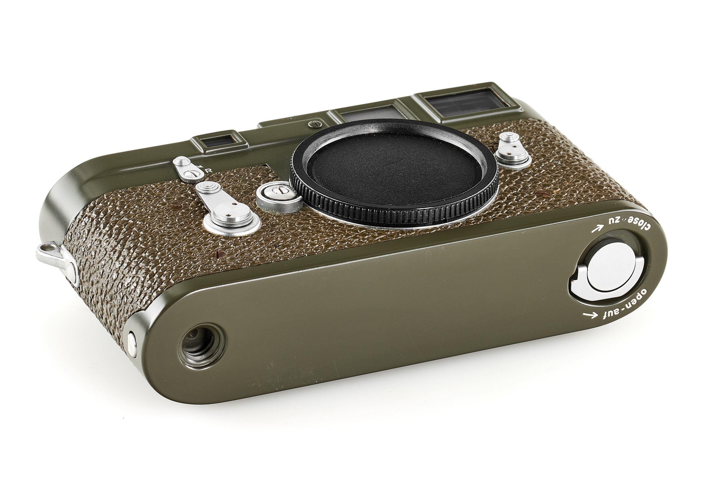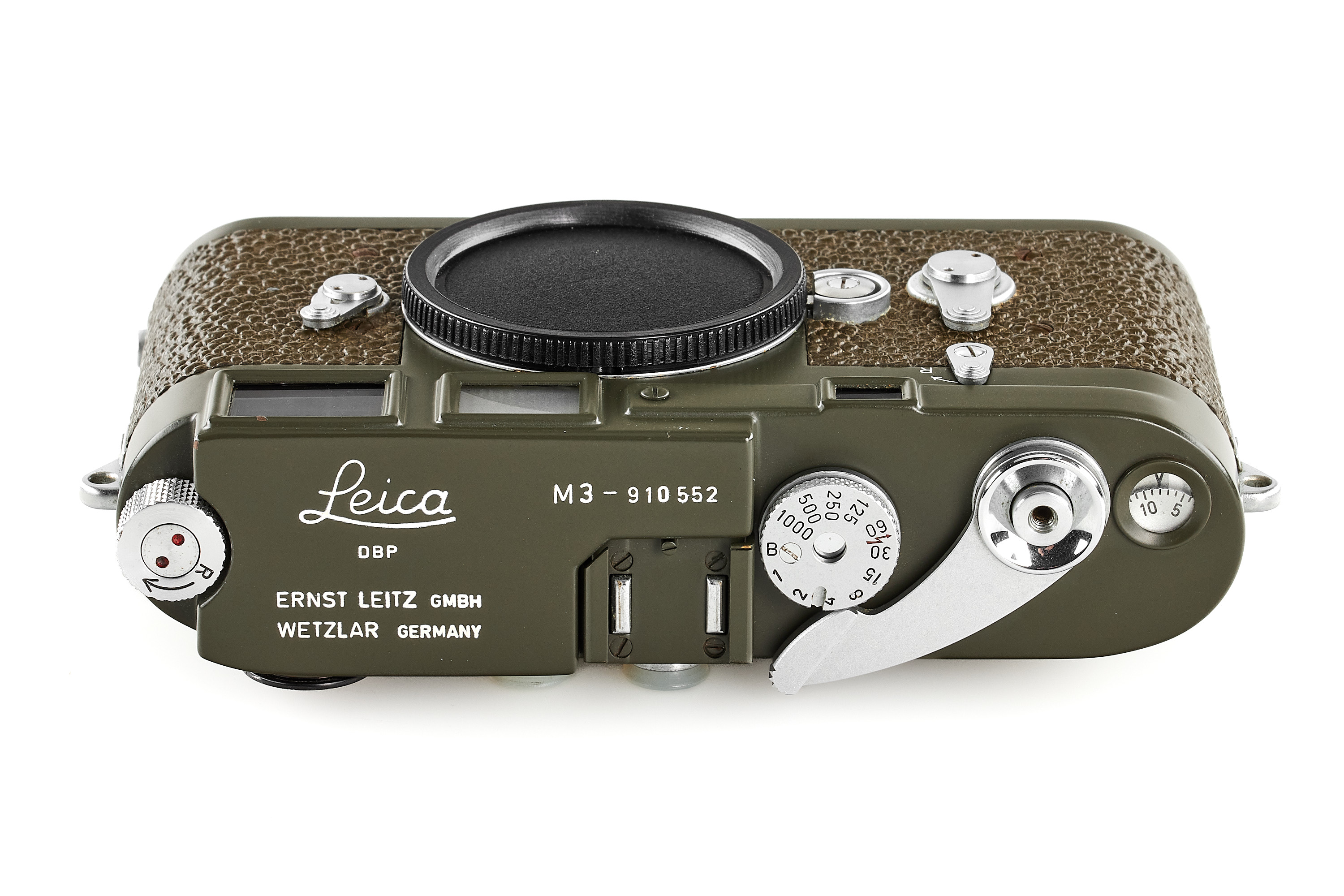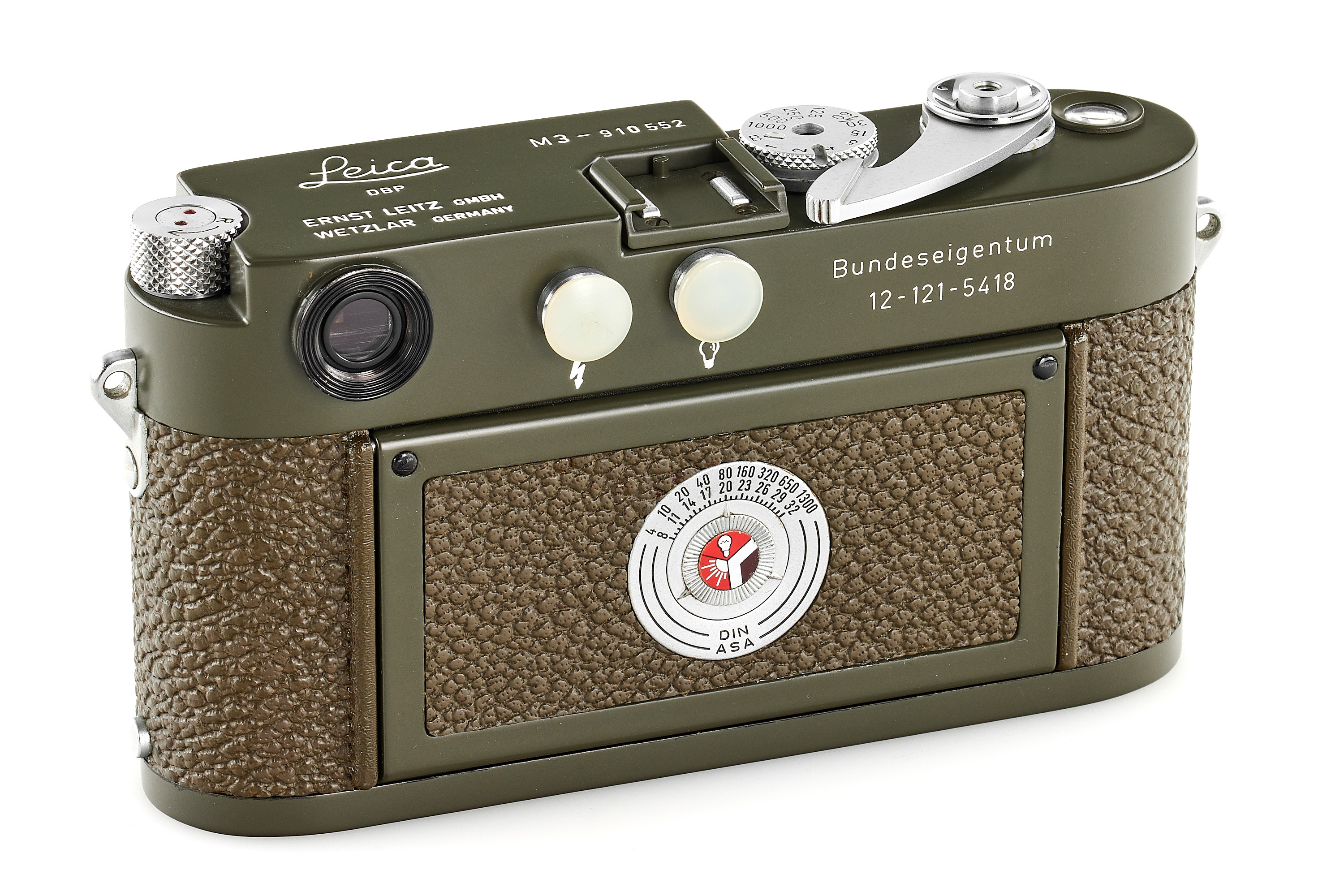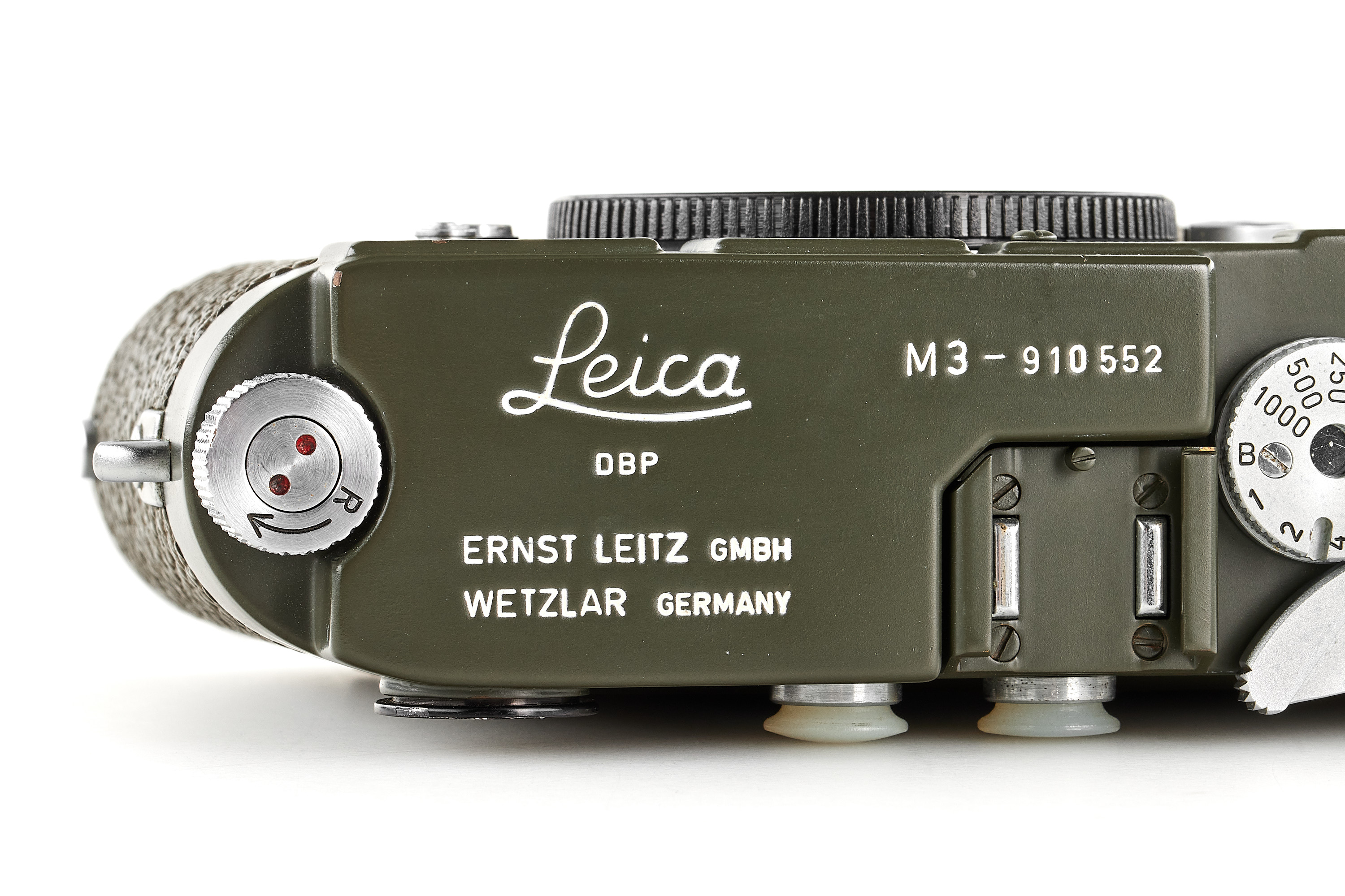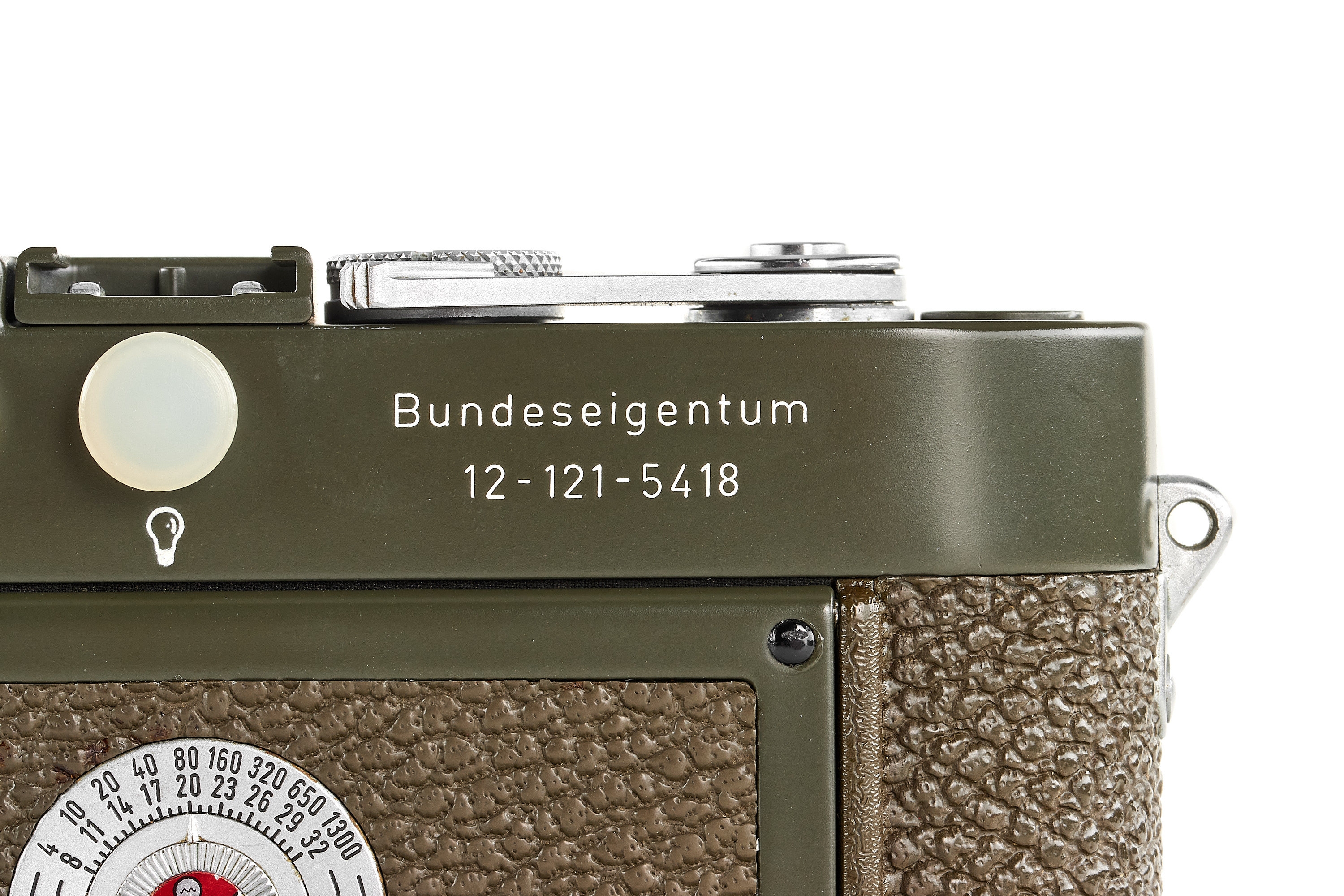 Very rare early version olive paint Leica M3 'Bundeseigentum' with long strap lugs and early vulcanite pattern, double stroke advance, engraved 'Bundeseigentum 12-121-5418' on the top plate, the camera was restored by Leica in the 1980s (both top plate and base plate repainted).