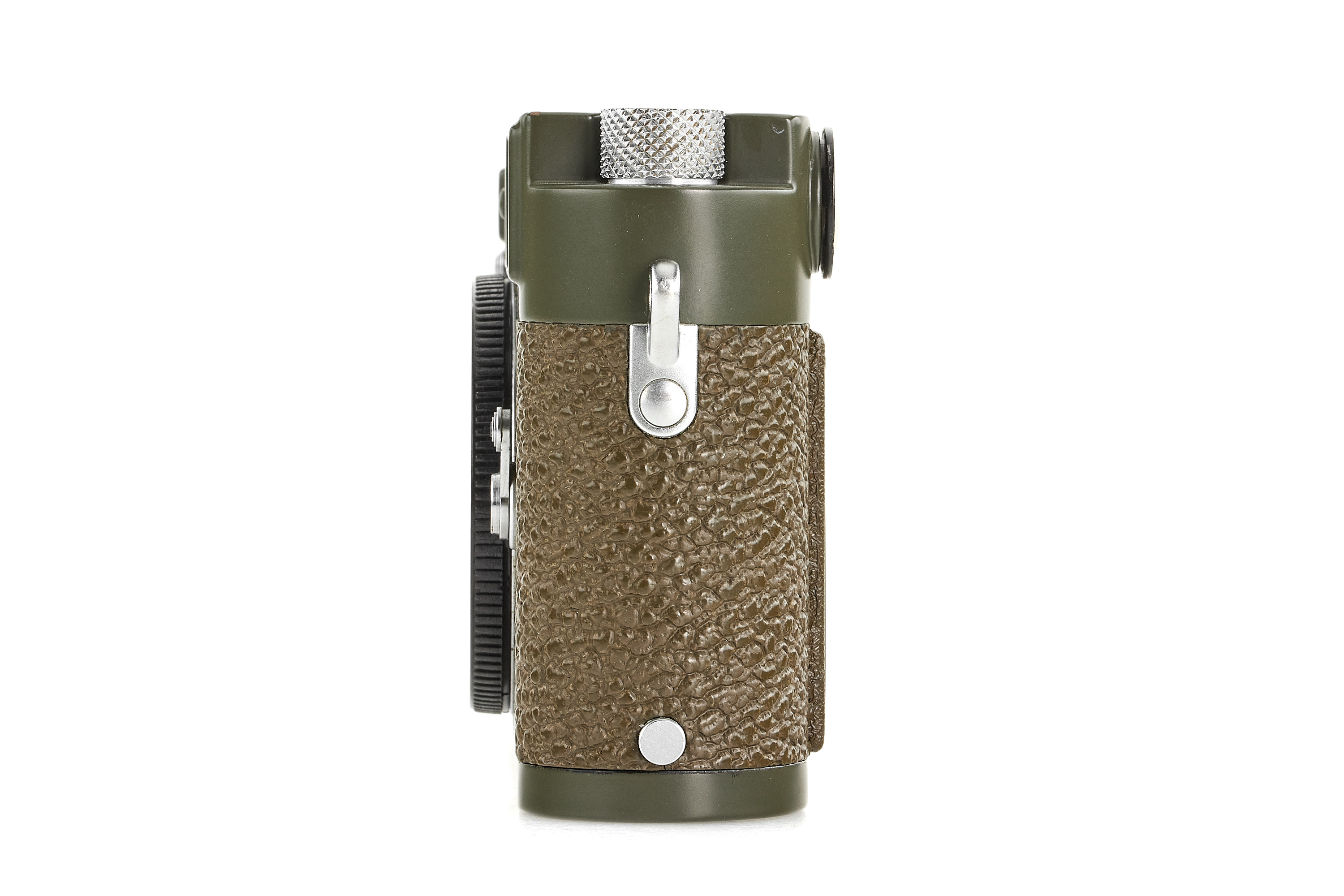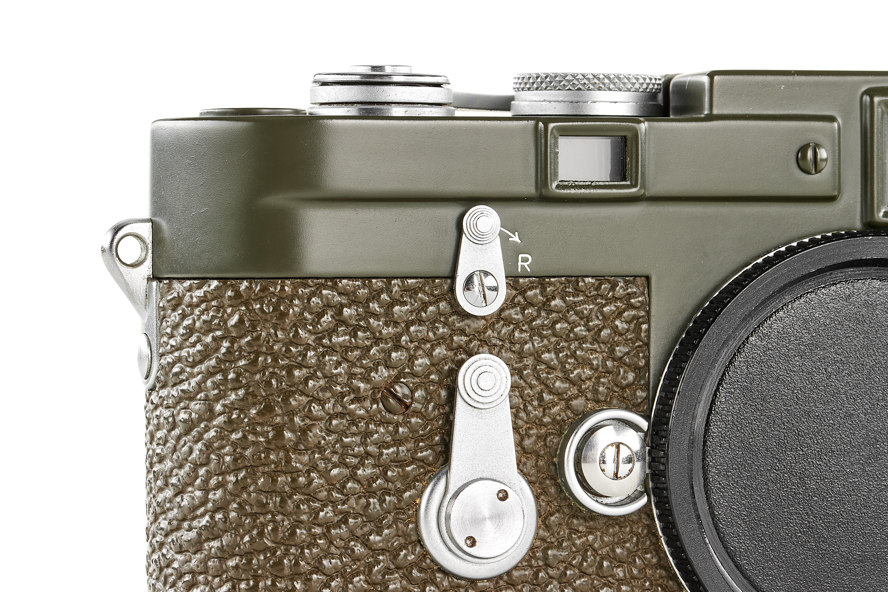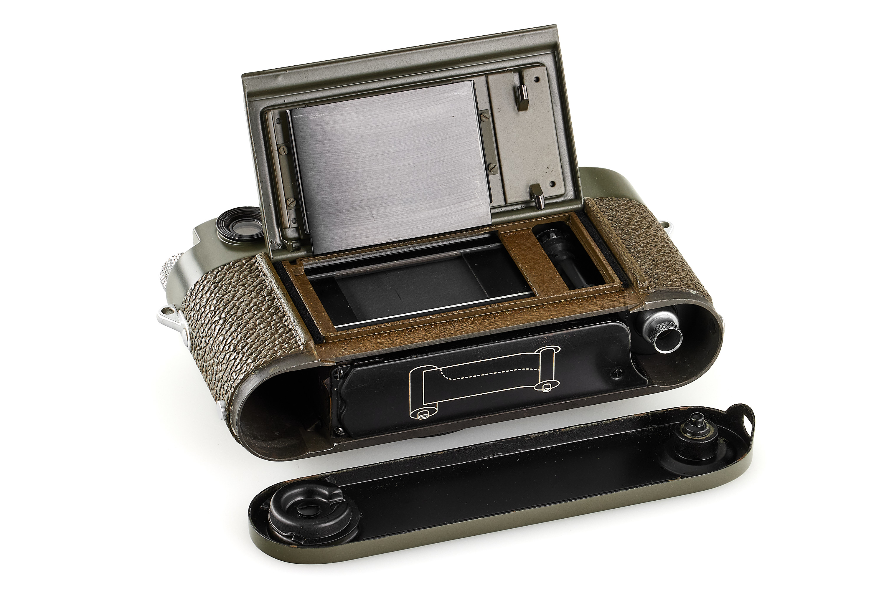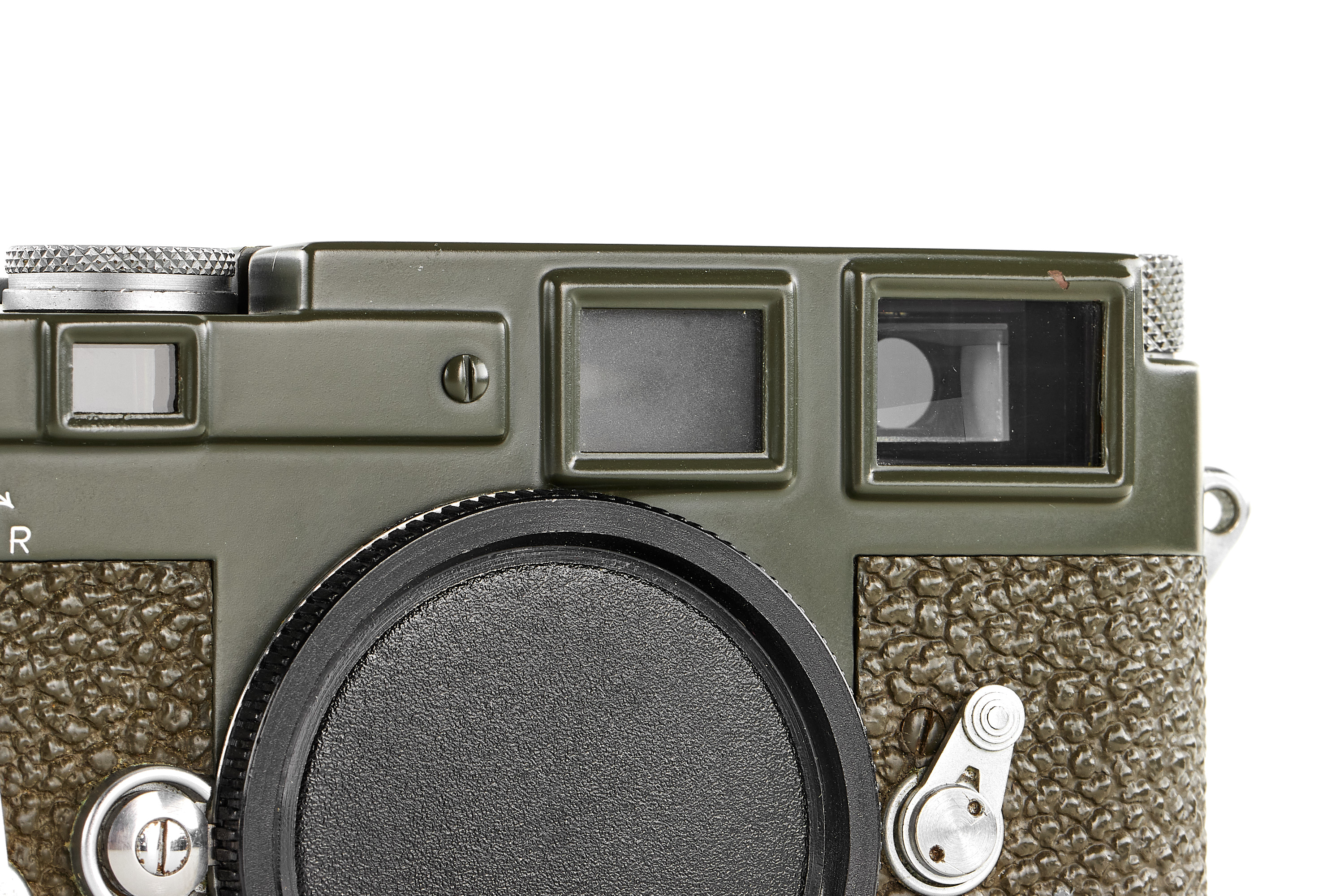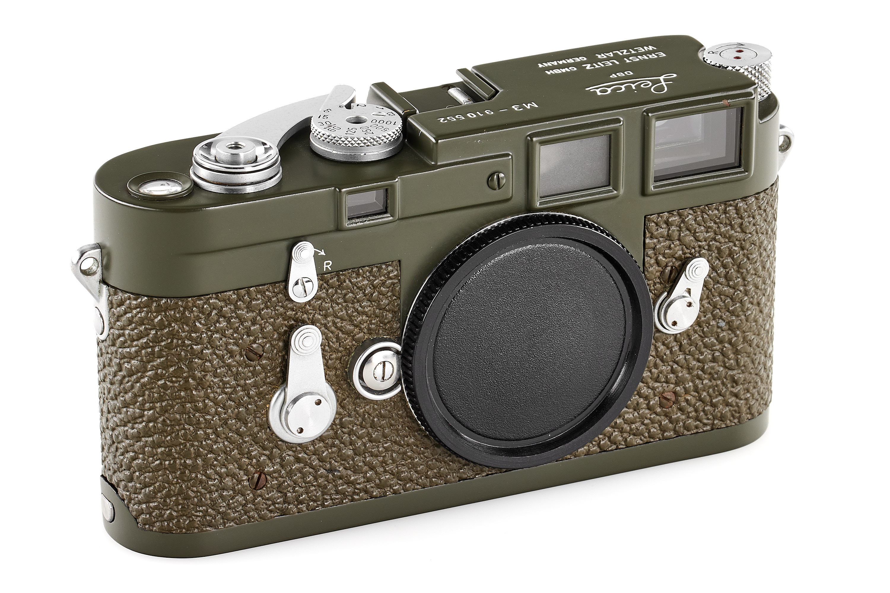 Very rare early version olive paint Leica M3 'Bundeseigentum' with long strap lugs and early vulcanite pattern, double stroke advance, engraved 'Bundeseigentum 12-121-5418' on the top plate, the camera was restored by Leica in the 1980s (both top plate and base plate repainted).