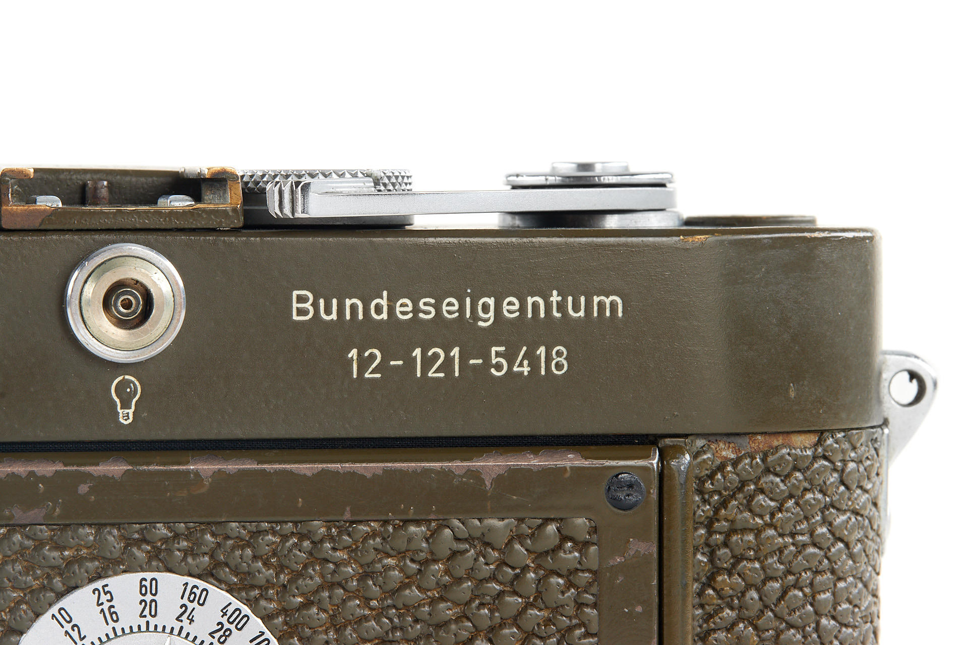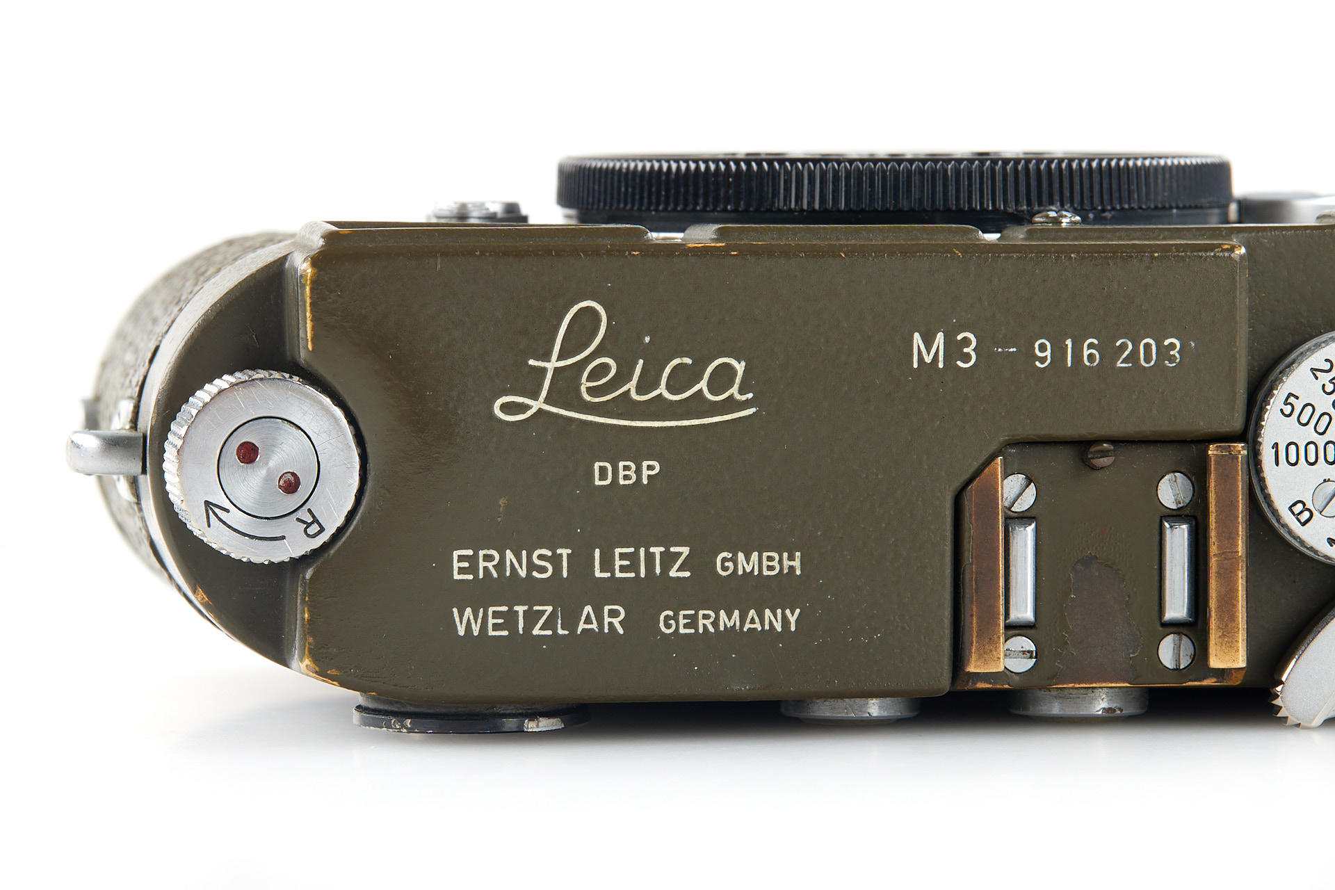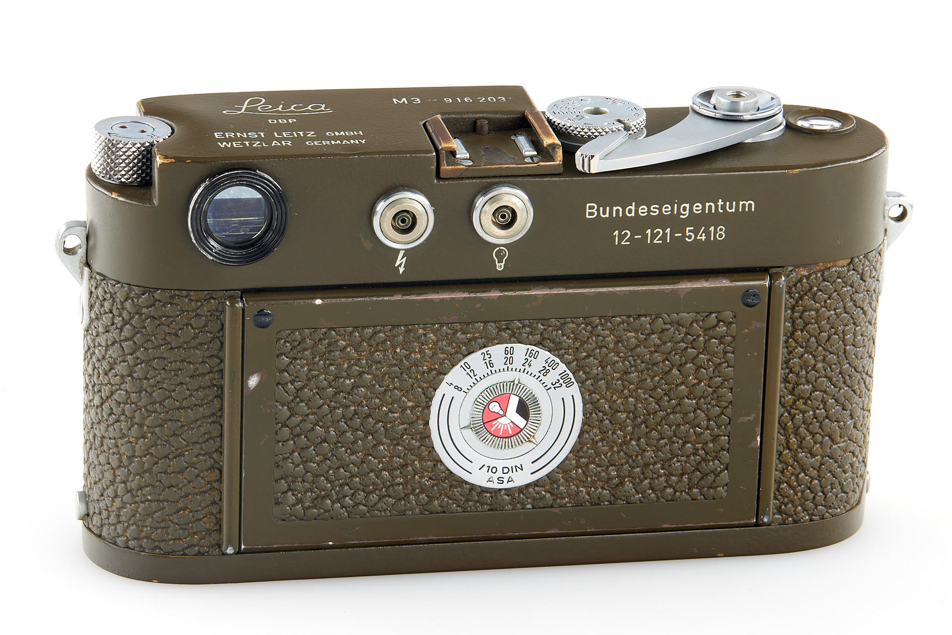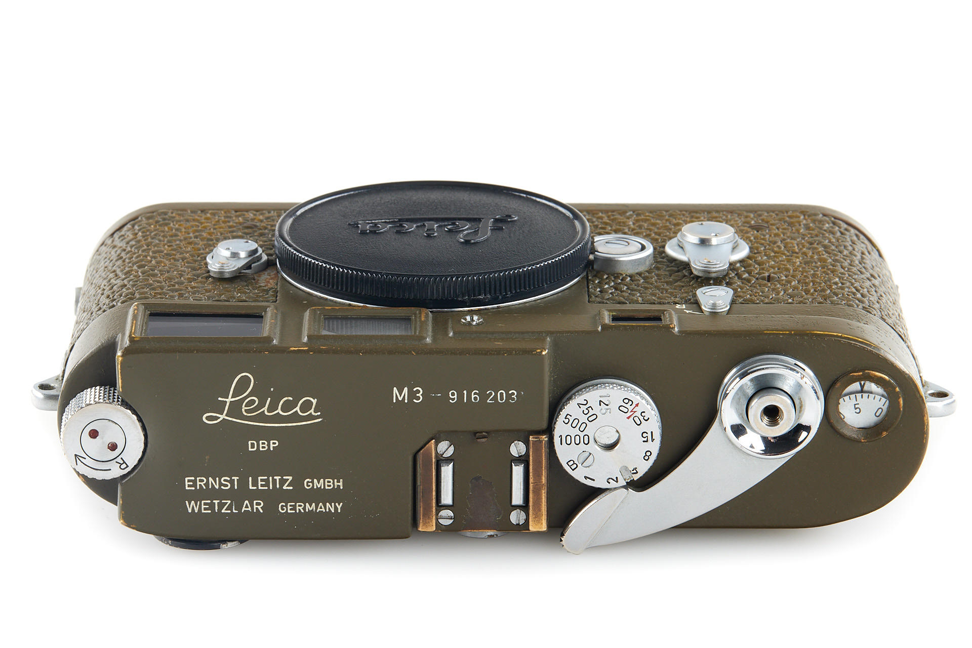 very early first version military olive green M3 in original, unrestored condition and perfect working order, early green Vulkanite with coarse pattern (two small pieces missing), top plate engraved on the rear with 'Bundeseigentum 12-121-5418', unlike the later examples these early M3 olive cameras were made to individual orders from military, entries in Leica control books reveal that this camera is the second one known from in 916XXX serial number range and the last M3 olive with double stroke advance(!), included with this camera is the written expertise from Mr. Ottmar Michaely