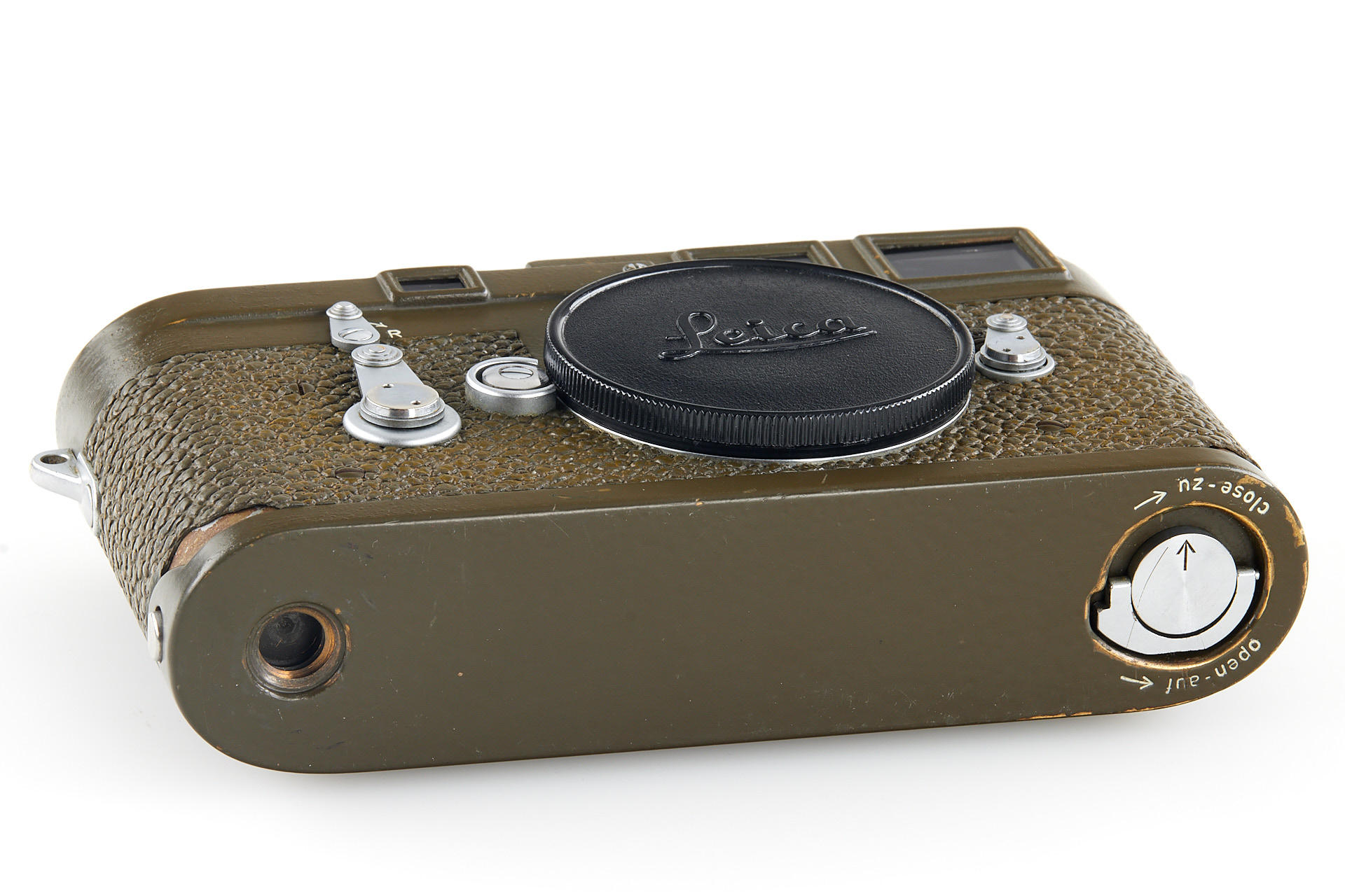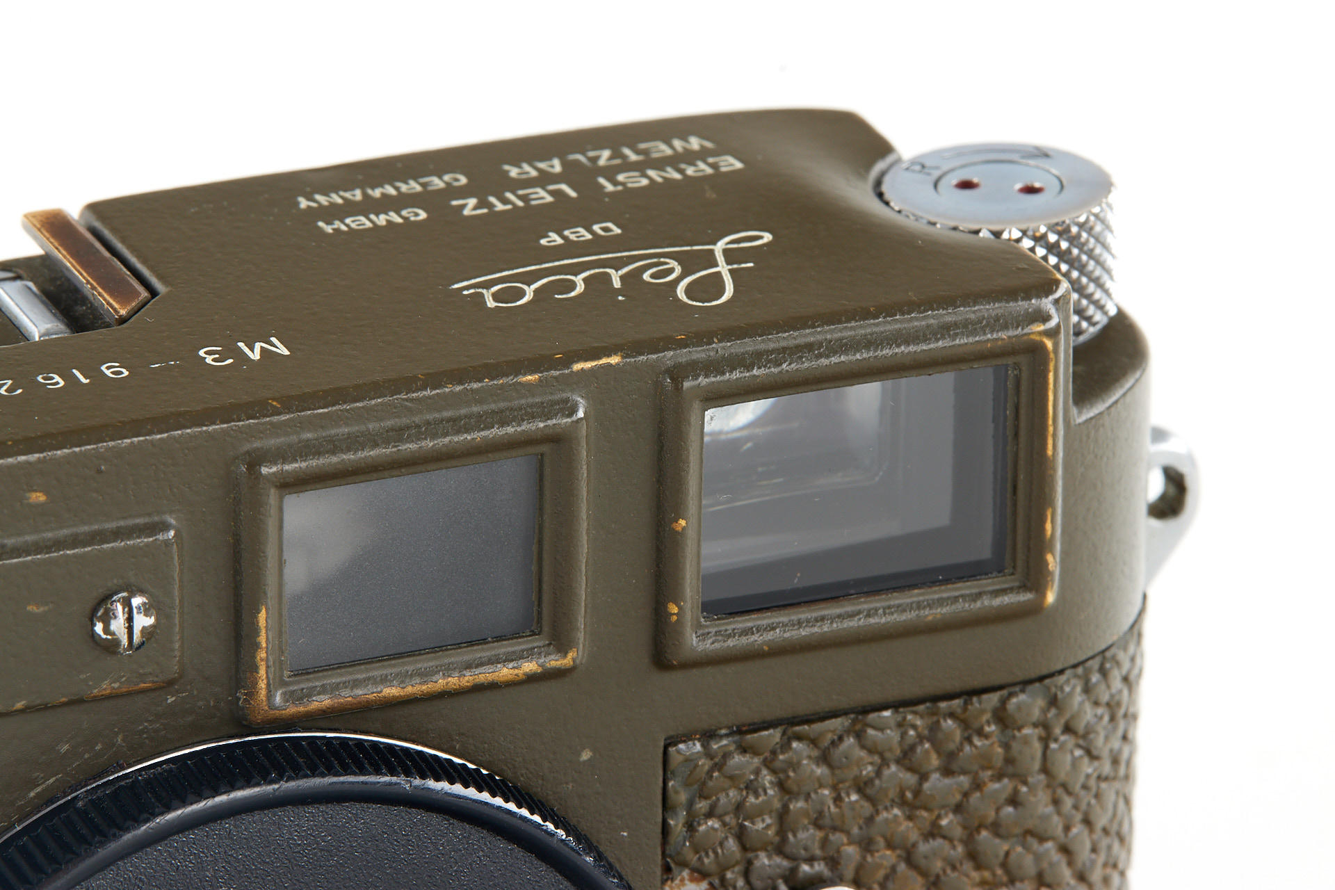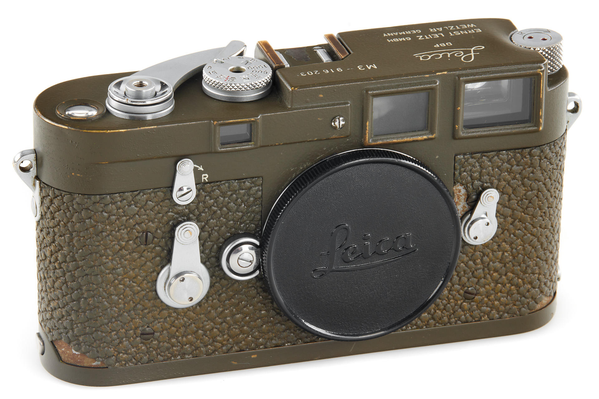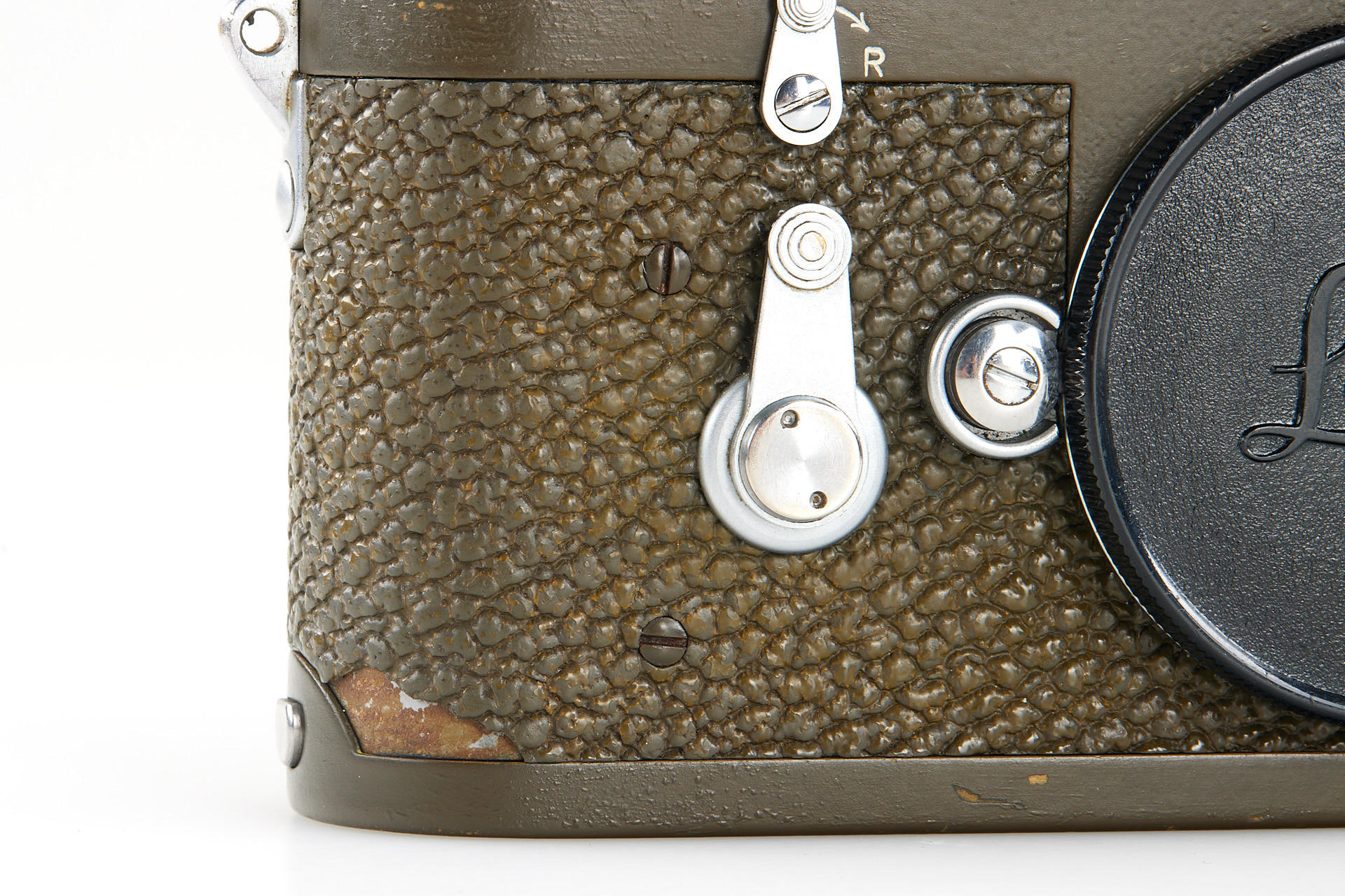 very early first version military olive green M3 in original, unrestored condition and perfect working order, early green Vulkanite with coarse pattern (two small pieces missing), top plate engraved on the rear with 'Bundeseigentum 12-121-5418', unlike the later examples these early M3 olive cameras were made to individual orders from military, entries in Leica control books reveal that this camera is the second one known from in 916XXX serial number range and the last M3 olive with double stroke advance(!), included with this camera is the written expertise from Mr. Ottmar Michaely