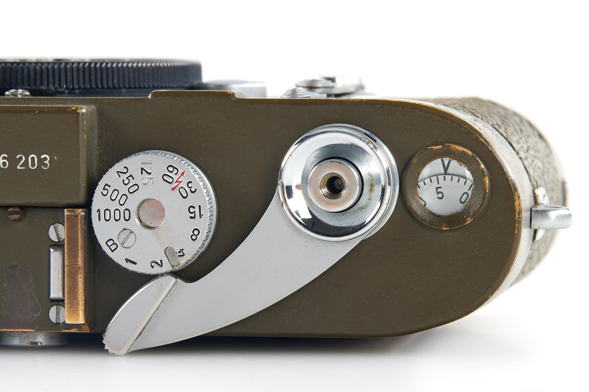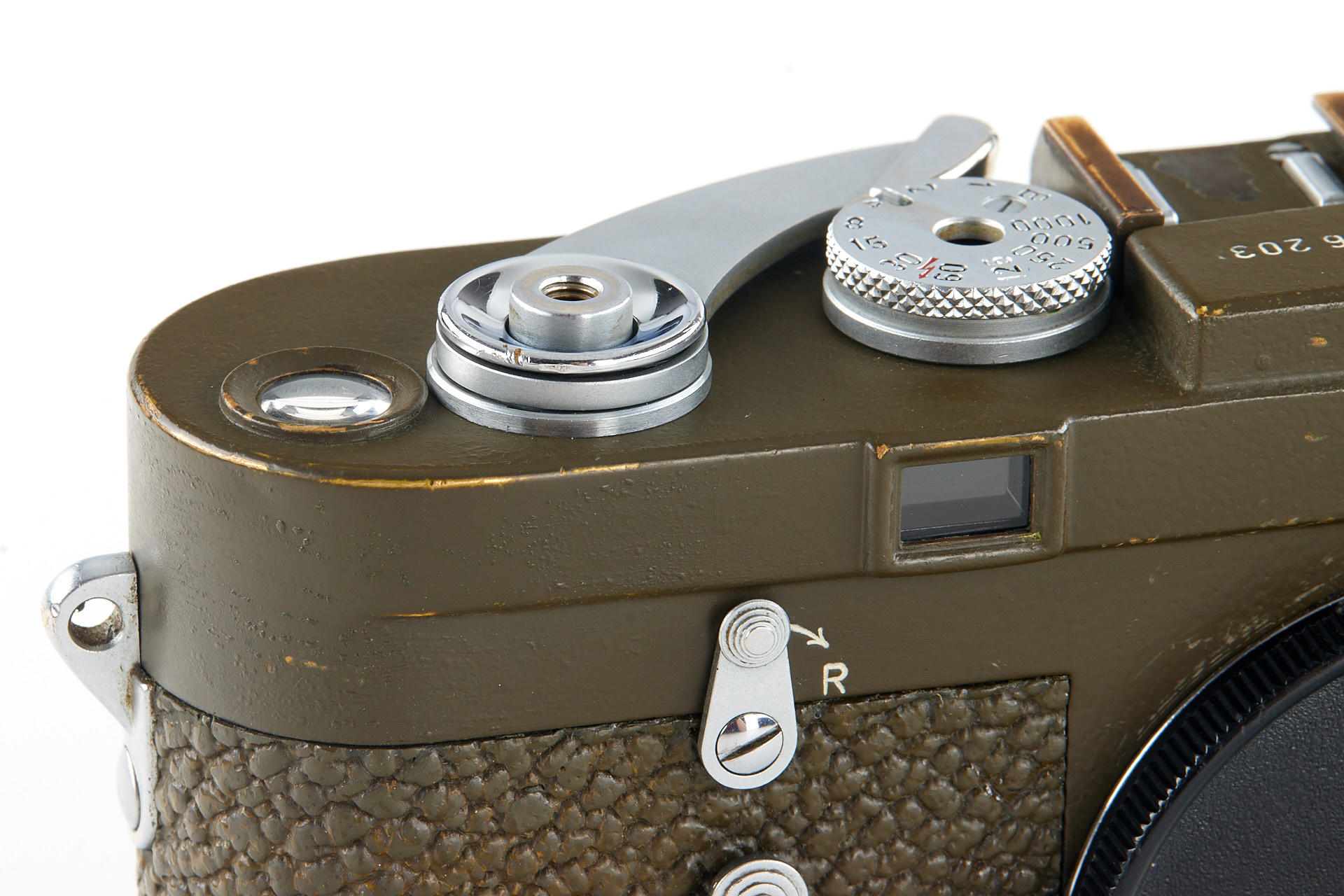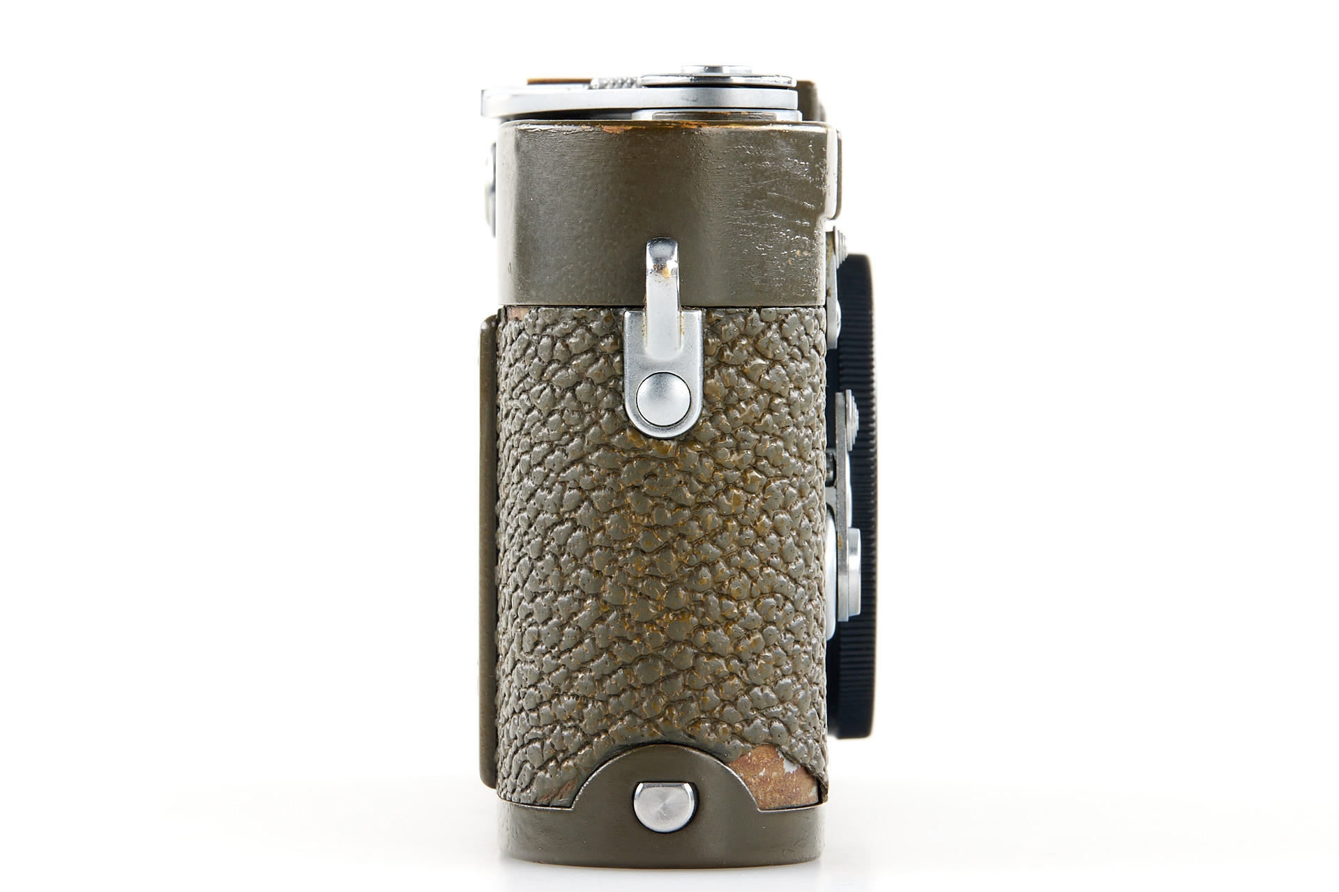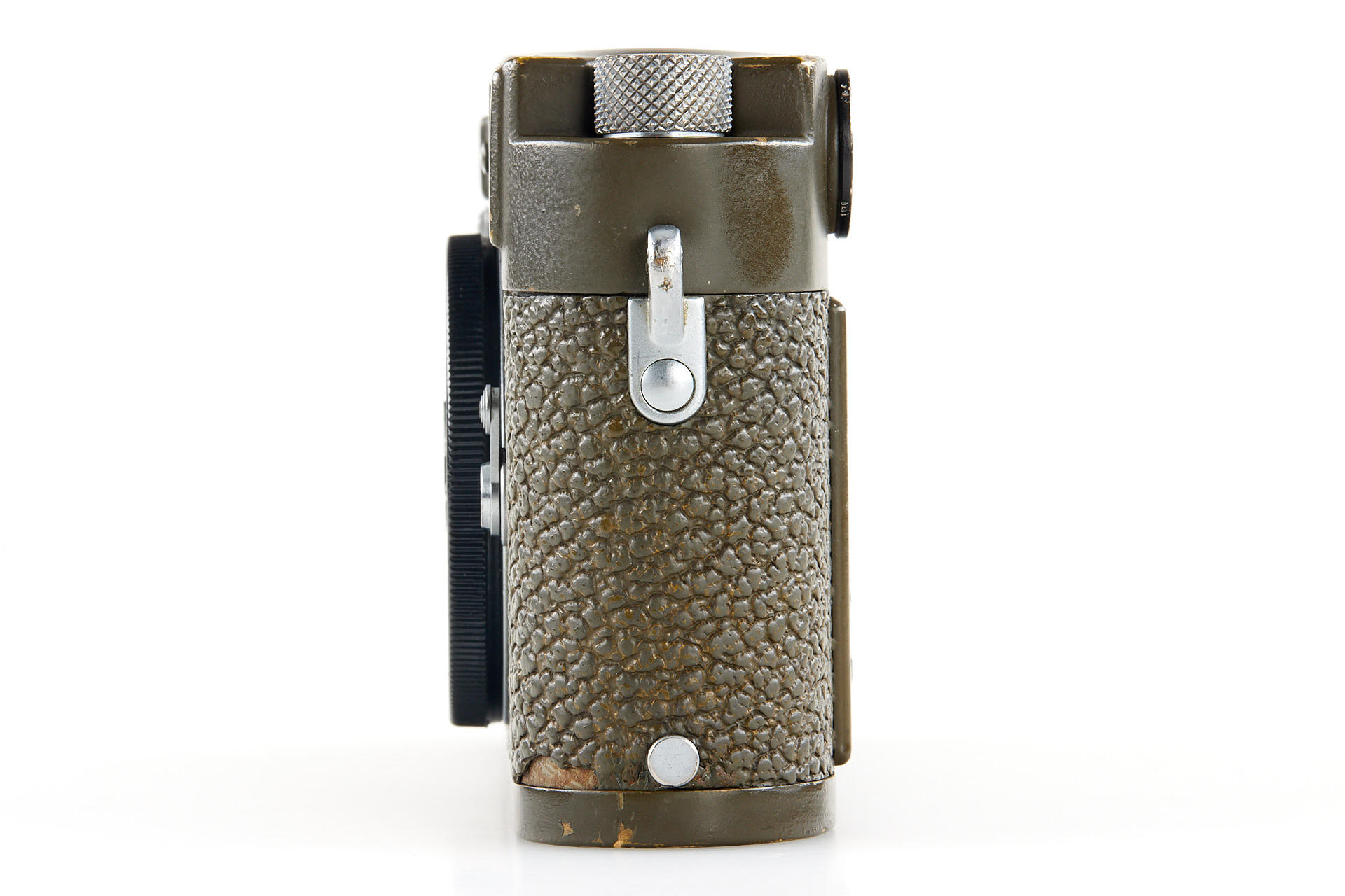 very early first version military olive green M3 in original, unrestored condition and perfect working order, early green Vulkanite with coarse pattern (two small pieces missing), top plate engraved on the rear with 'Bundeseigentum 12-121-5418', unlike the later examples these early M3 olive cameras were made to individual orders from military, entries in Leica control books reveal that this camera is the second one known from in 916XXX serial number range and the last M3 olive with double stroke advance(!), included with this camera is the written expertise from Mr. Ottmar Michaely
