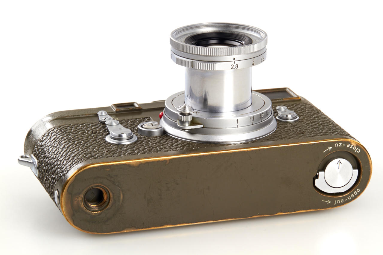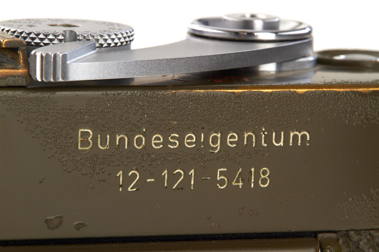 very early first version (production started with number 910501) military olive green M3 in original unrestored condition and perfect working order, engraved on rear 'Bundeseigentum 12-121-5418', with chrome Elmar 2.8/5cm no.1575496
