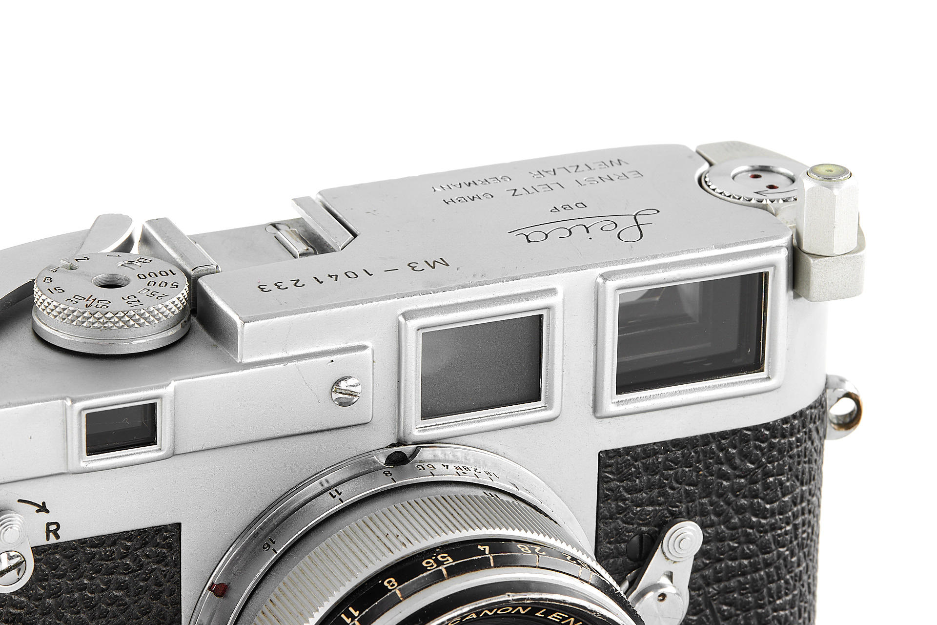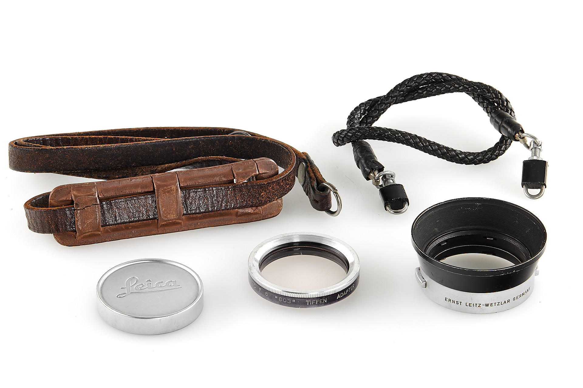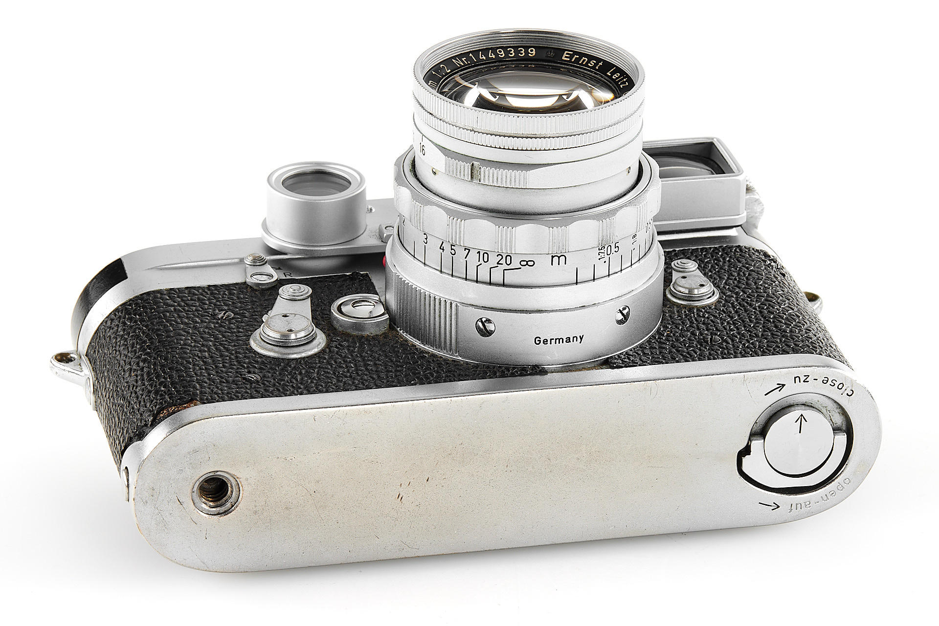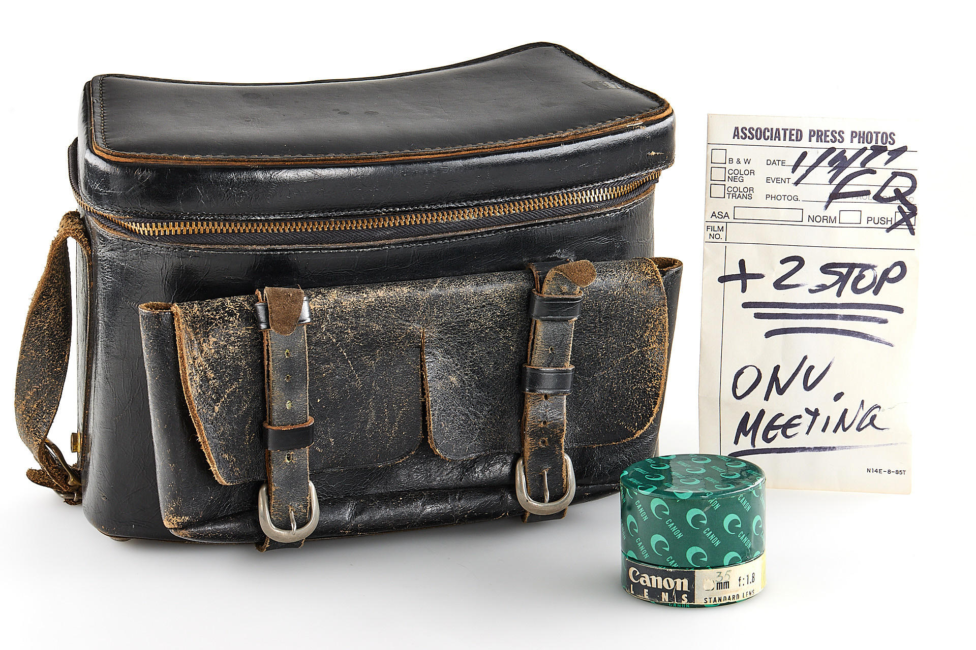 outfit used by the famous Italian photographer Felice Quinto (1929-2010), composed of the Leica M3 chrome double stroke no.915268, Leica M3 chrome single stroke no.1041233, (both with rapid rewind adapter), Summicron dual-range 2/50mm no.1449339 with SDPOO close-focus adapter, IROOA hood, front cap and plastic keeper, SBOOI 5cm finder, Canon f. Leica M39 1.8/35mm no.23765 with Leica M adapter, Tiffen adapter and filter, rear lens cap and maker's box (not matching), 2x leather straps, US made leather outfit case. Considered as the first ‚Paparazzo‘, Felice Quinto inspired his friend Federico Fellini for a character in the film ‘La Dolce Vita’. He moved to the USA in the sixties where he worked for the AP (Associated Press) and took some compromising pictures of stars becoming the ‘King of Paparazzi’, he also covered JFK funeral and marches in the Civil Rights Movement. F. Quinto met and photographed the New York jet-set at the famous Studio 54 such as Mick Jagger, Liza Minelli, Sylvester Stallone, Salvador Dali and Andy Warhol who wrote in 1984: ‘Quinto is a serious photographer. His work is great.’. included in the lot is also AP (Associated Press) film process envelope marked 'ONU meeting' (United Nation meeting), large outfit case.
