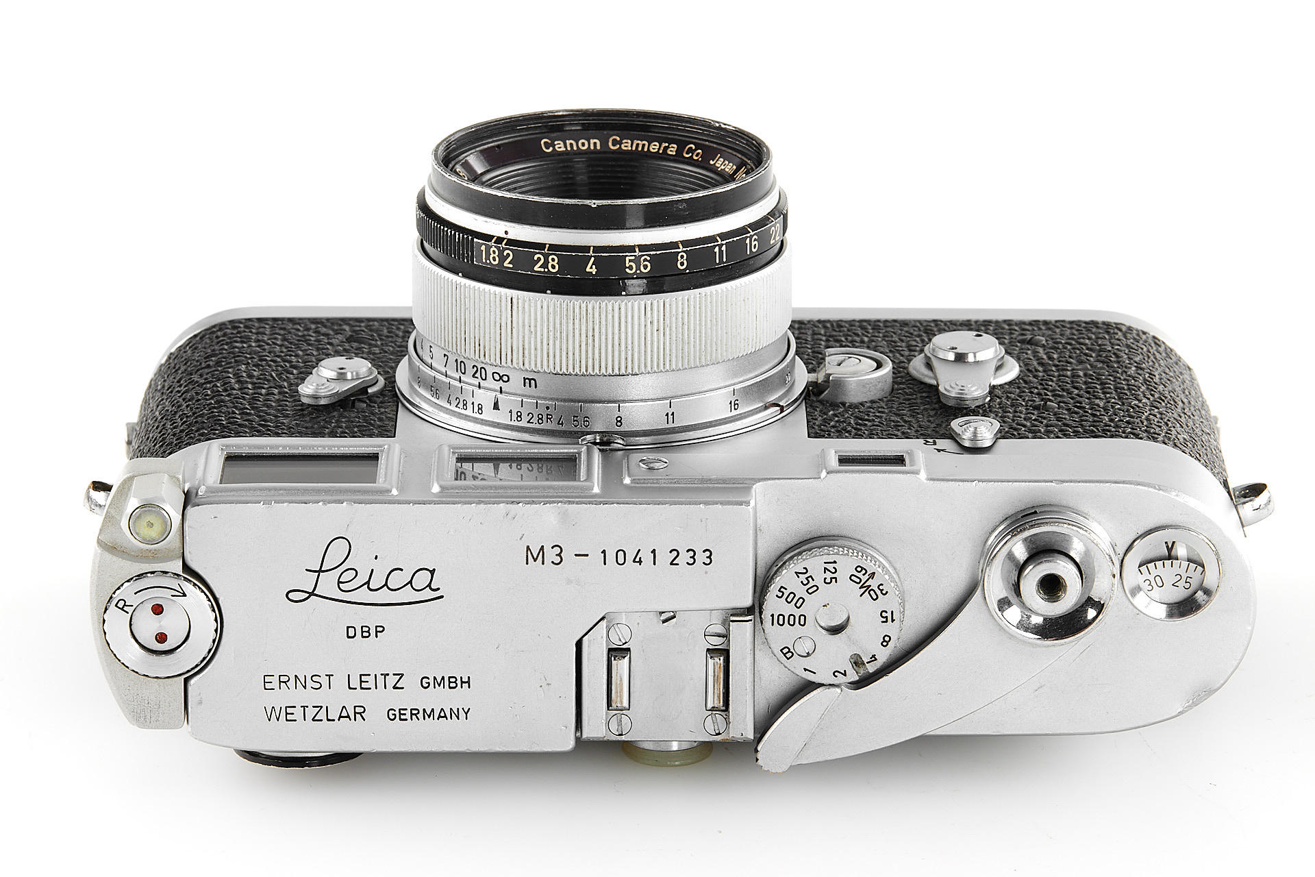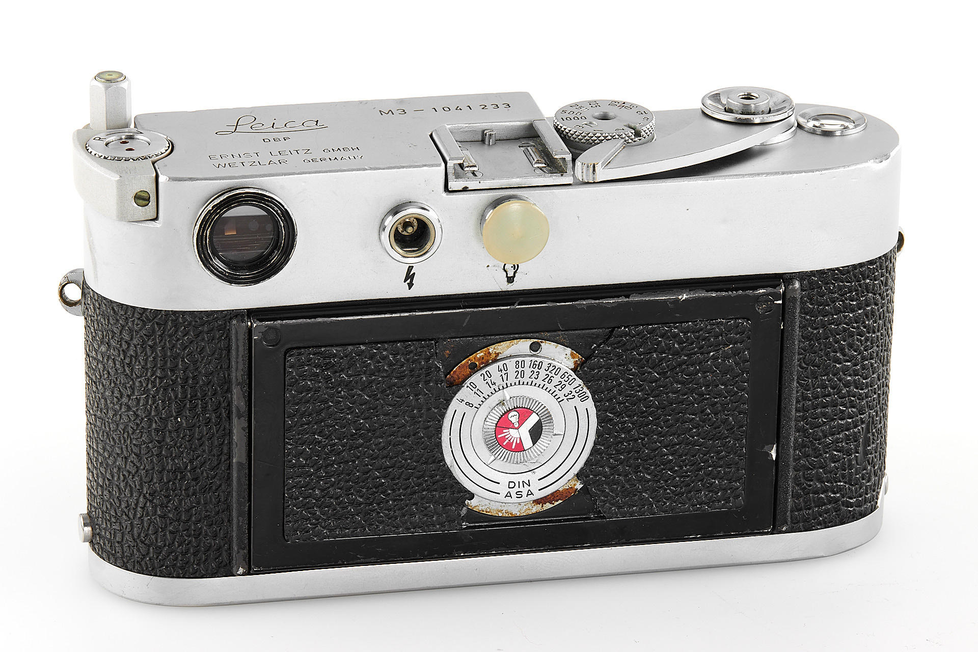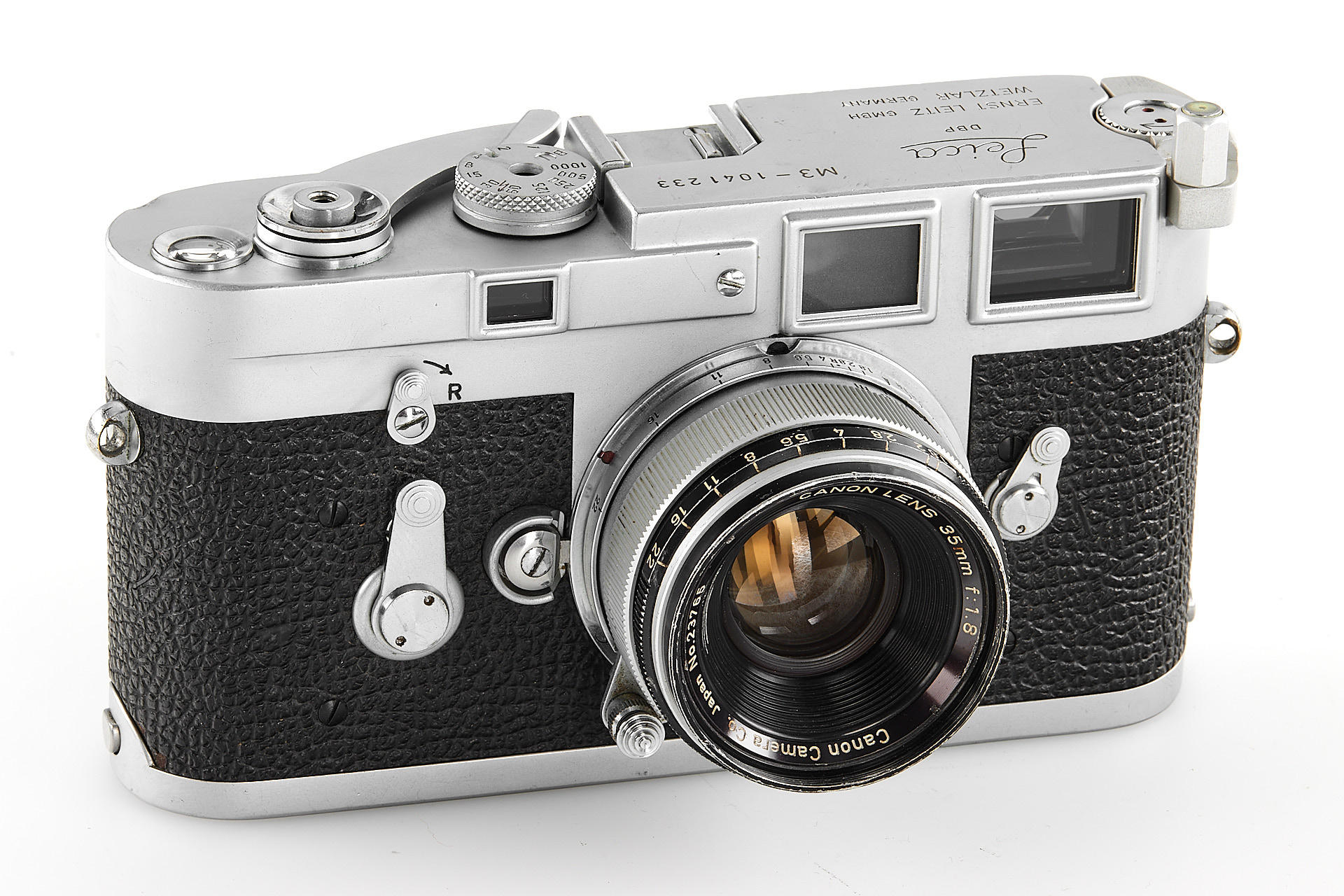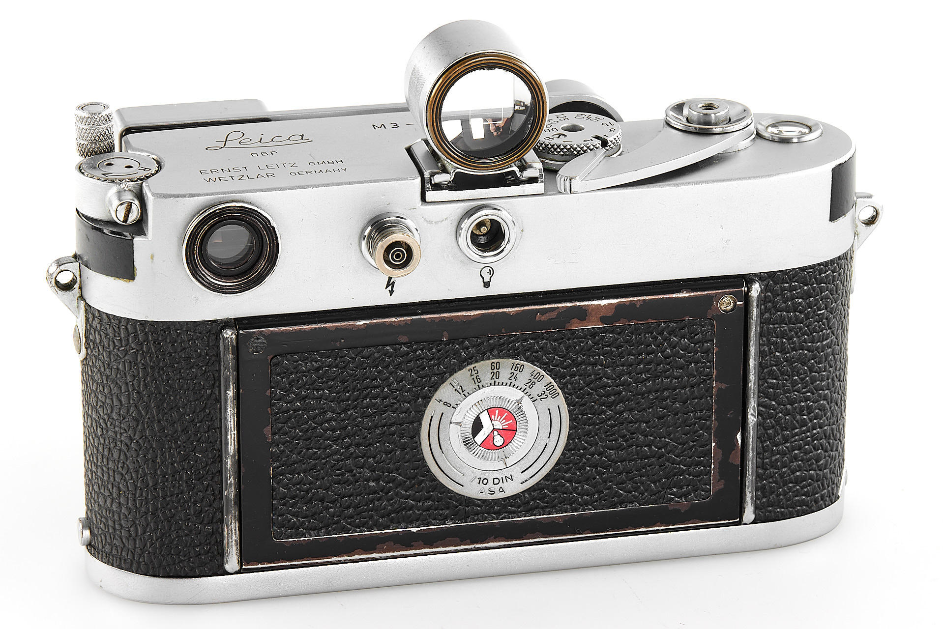 outfit used by the famous Italian photographer Felice Quinto (1929-2010), composed of the Leica M3 chrome double stroke no.915268, Leica M3 chrome single stroke no.1041233, (both with rapid rewind adapter), Summicron dual-range 2/50mm no.1449339 with SDPOO close-focus adapter, IROOA hood, front cap and plastic keeper, SBOOI 5cm finder, Canon f. Leica M39 1.8/35mm no.23765 with Leica M adapter, Tiffen adapter and filter, rear lens cap and maker's box (not matching), 2x leather straps, US made leather outfit case. Considered as the first ‚Paparazzo‘, Felice Quinto inspired his friend Federico Fellini for a character in the film ‘La Dolce Vita’. He moved to the USA in the sixties where he worked for the AP (Associated Press) and took some compromising pictures of stars becoming the ‘King of Paparazzi’, he also covered JFK funeral and marches in the Civil Rights Movement. F. Quinto met and photographed the New York jet-set at the famous Studio 54 such as Mick Jagger, Liza Minelli, Sylvester Stallone, Salvador Dali and Andy Warhol who wrote in 1984: ‘Quinto is a serious photographer. His work is great.’. included in the lot is also AP (Associated Press) film process envelope marked 'ONU meeting' (United Nation meeting), large outfit case.