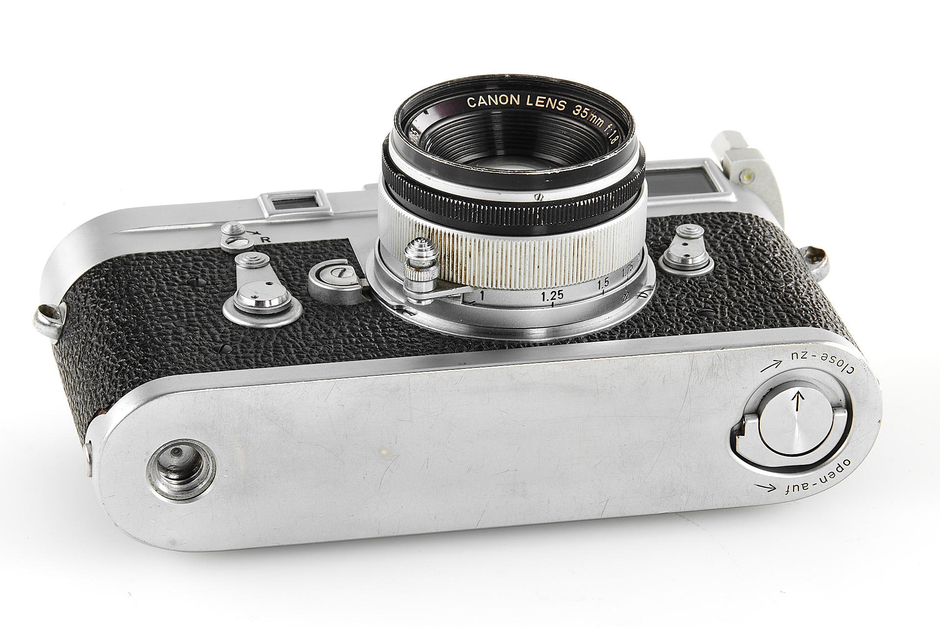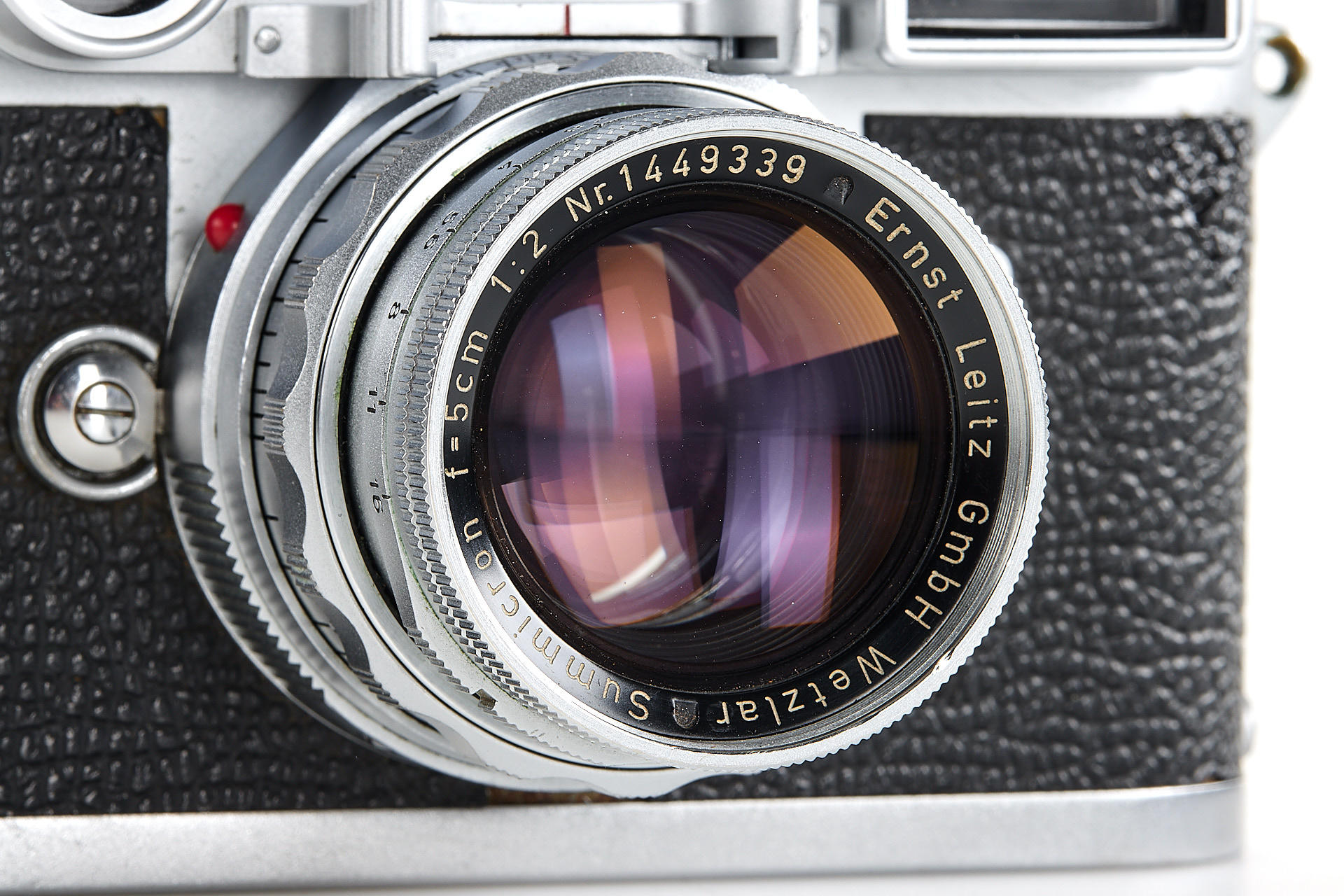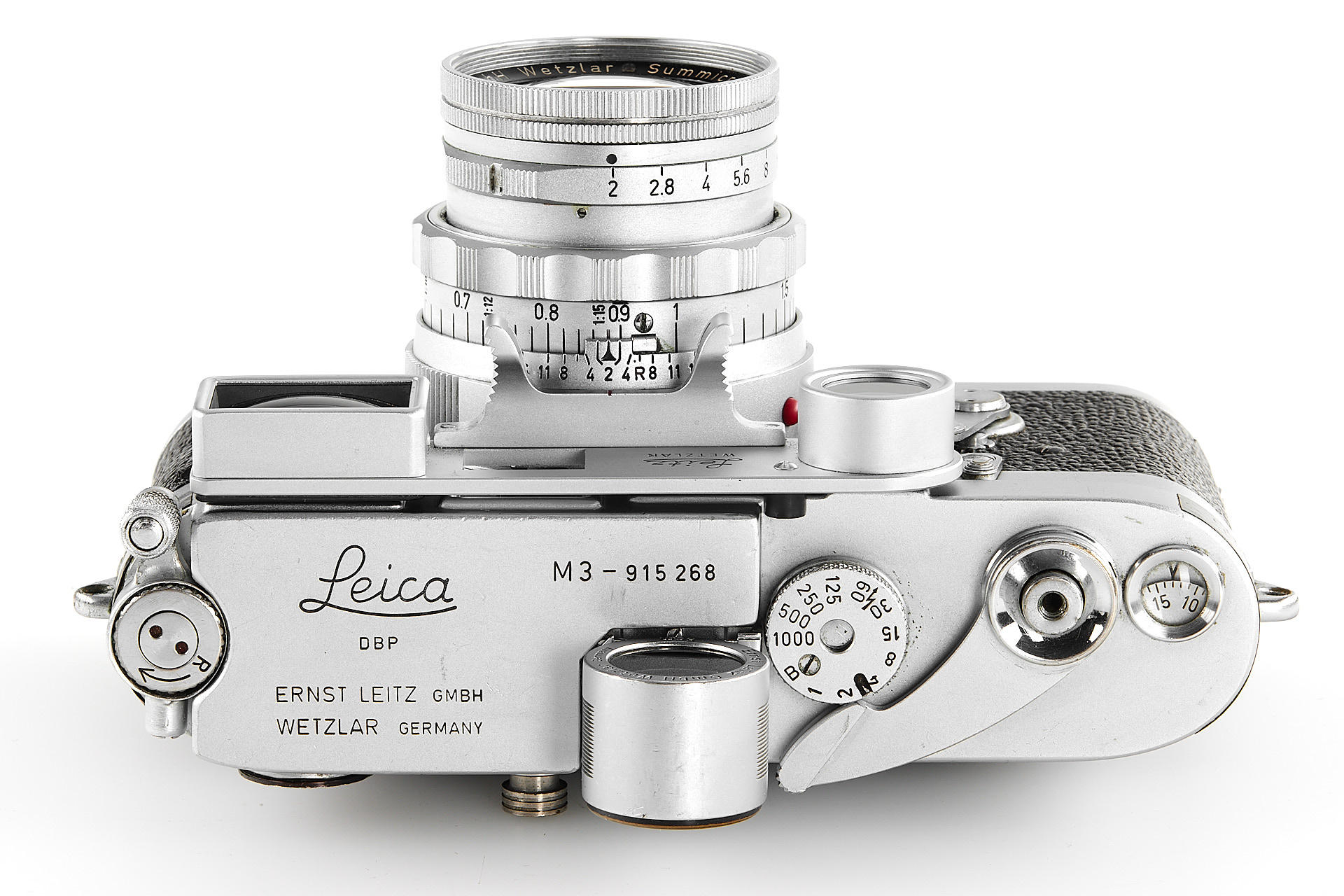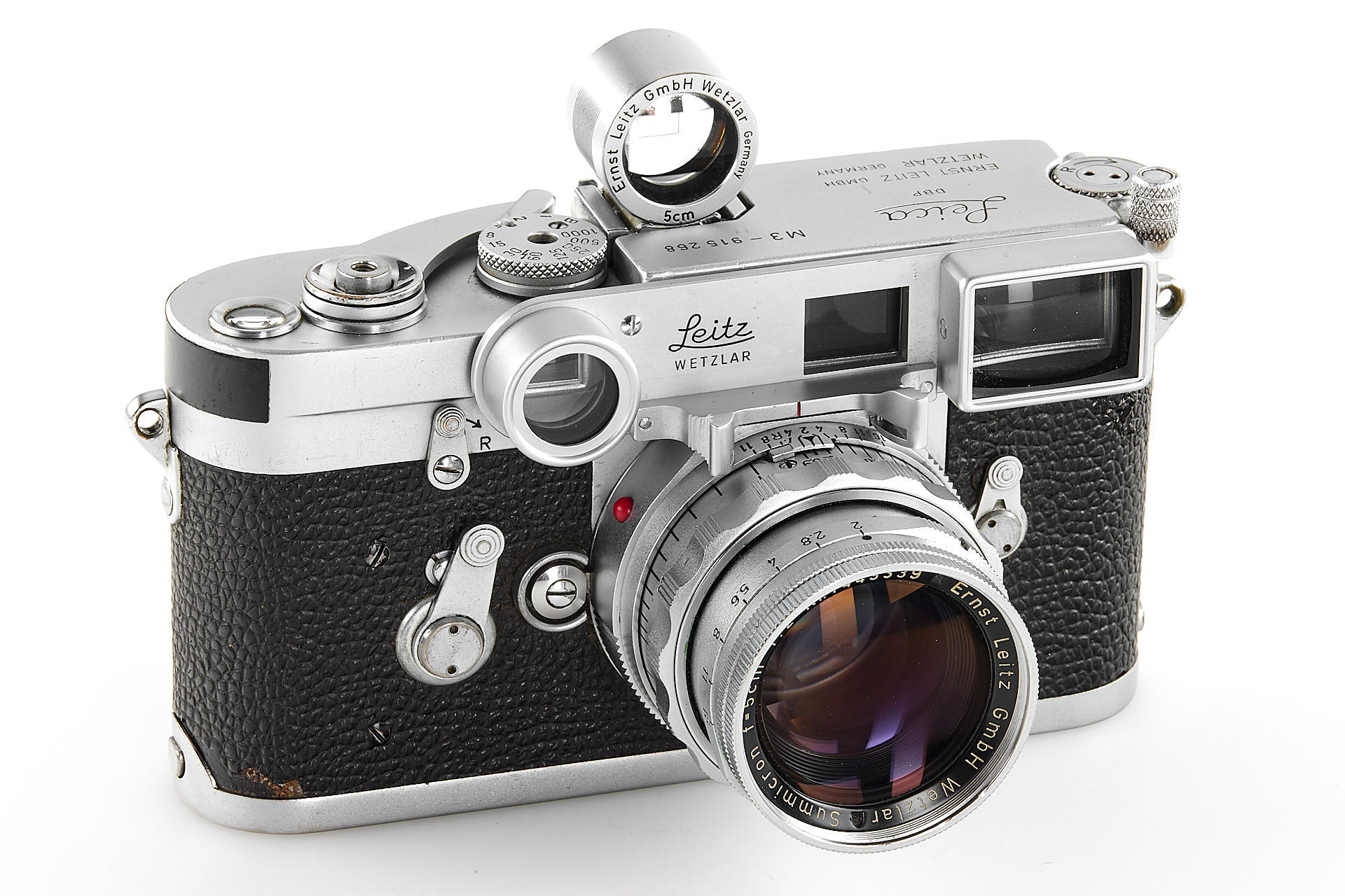 outfit used by the famous Italian photographer Felice Quinto (1929-2010), composed of the Leica M3 chrome double stroke no.915268, Leica M3 chrome single stroke no.1041233, (both with rapid rewind adapter), Summicron dual-range 2/50mm no.1449339 with SDPOO close-focus adapter, IROOA hood, front cap and plastic keeper, SBOOI 5cm finder, Canon f. Leica M39 1.8/35mm no.23765 with Leica M adapter, Tiffen adapter and filter, rear lens cap and maker's box (not matching), 2x leather straps, US made leather outfit case. Considered as the first ‚Paparazzo‘, Felice Quinto inspired his friend Federico Fellini for a character in the film ‘La Dolce Vita’. He moved to the USA in the sixties where he worked for the AP (Associated Press) and took some compromising pictures of stars becoming the ‘King of Paparazzi’, he also covered JFK funeral and marches in the Civil Rights Movement. F. Quinto met and photographed the New York jet-set at the famous Studio 54 such as Mick Jagger, Liza Minelli, Sylvester Stallone, Salvador Dali and Andy Warhol who wrote in 1984: ‘Quinto is a serious photographer. His work is great.’. included in the lot is also AP (Associated Press) film process envelope marked 'ONU meeting' (United Nation meeting), large outfit case.