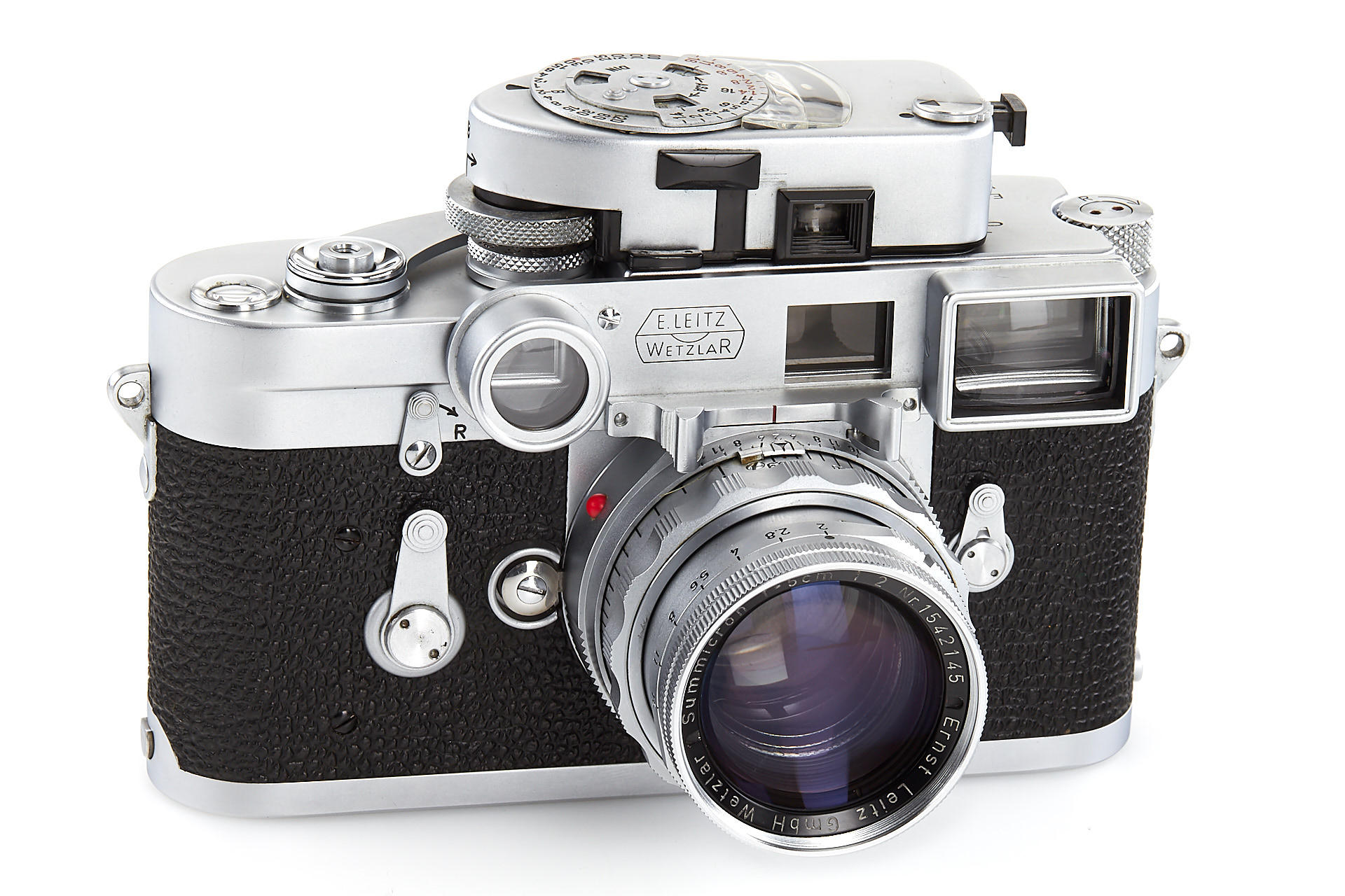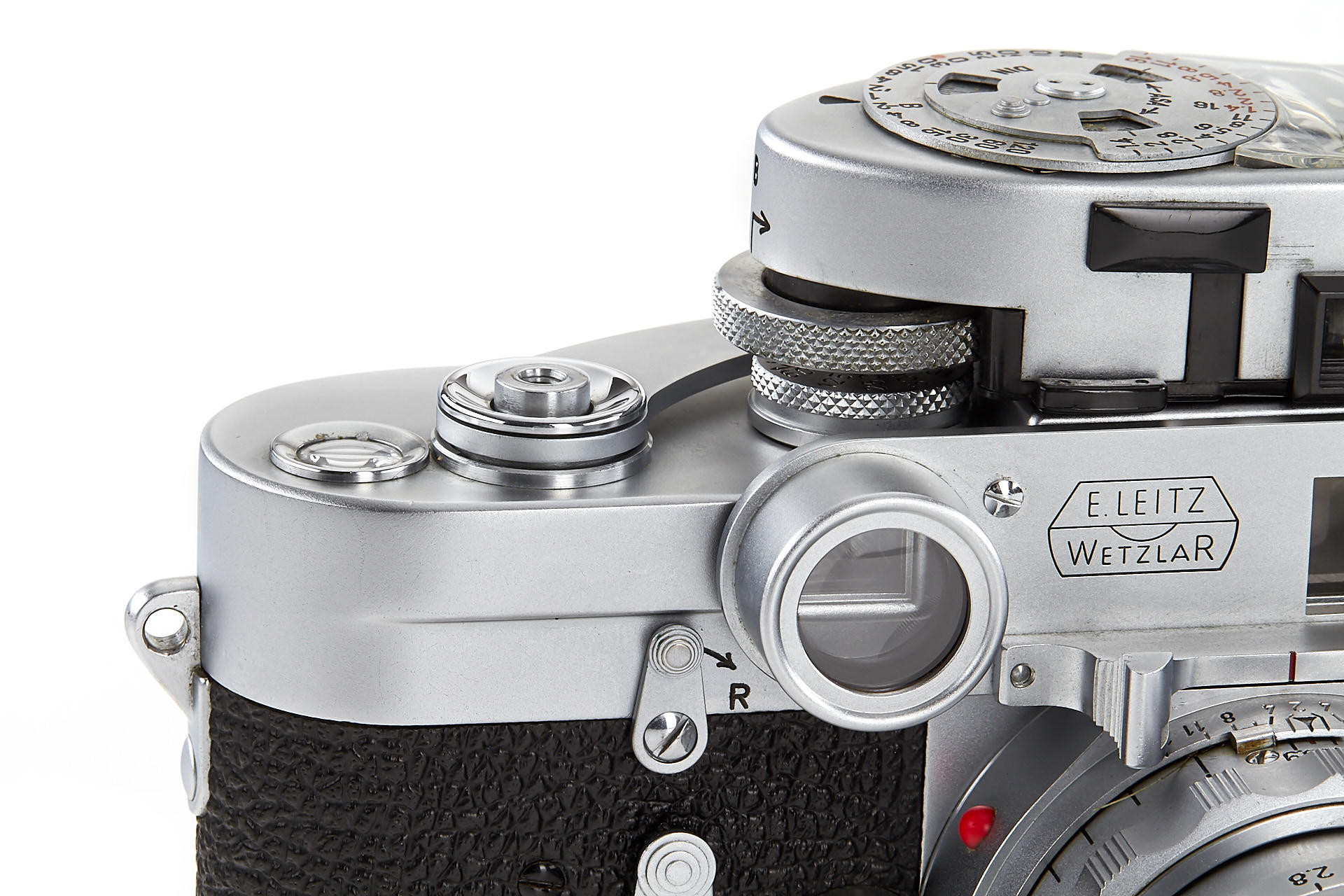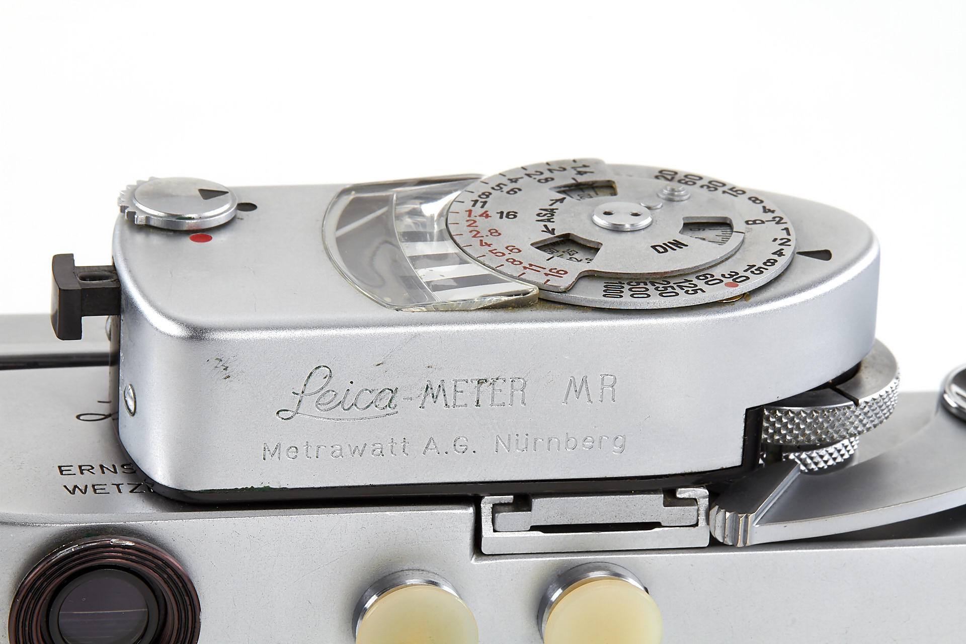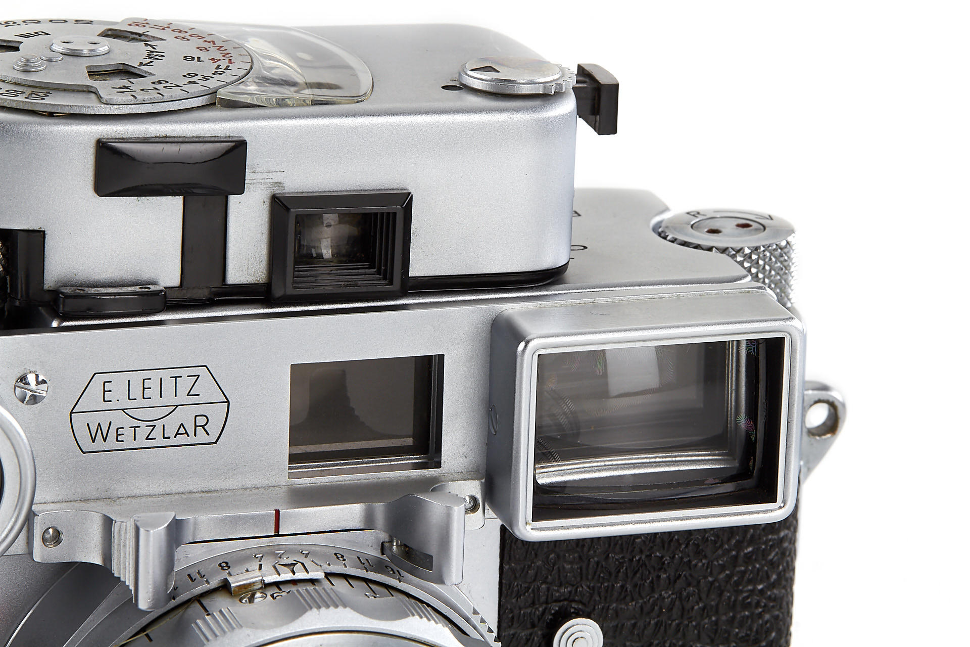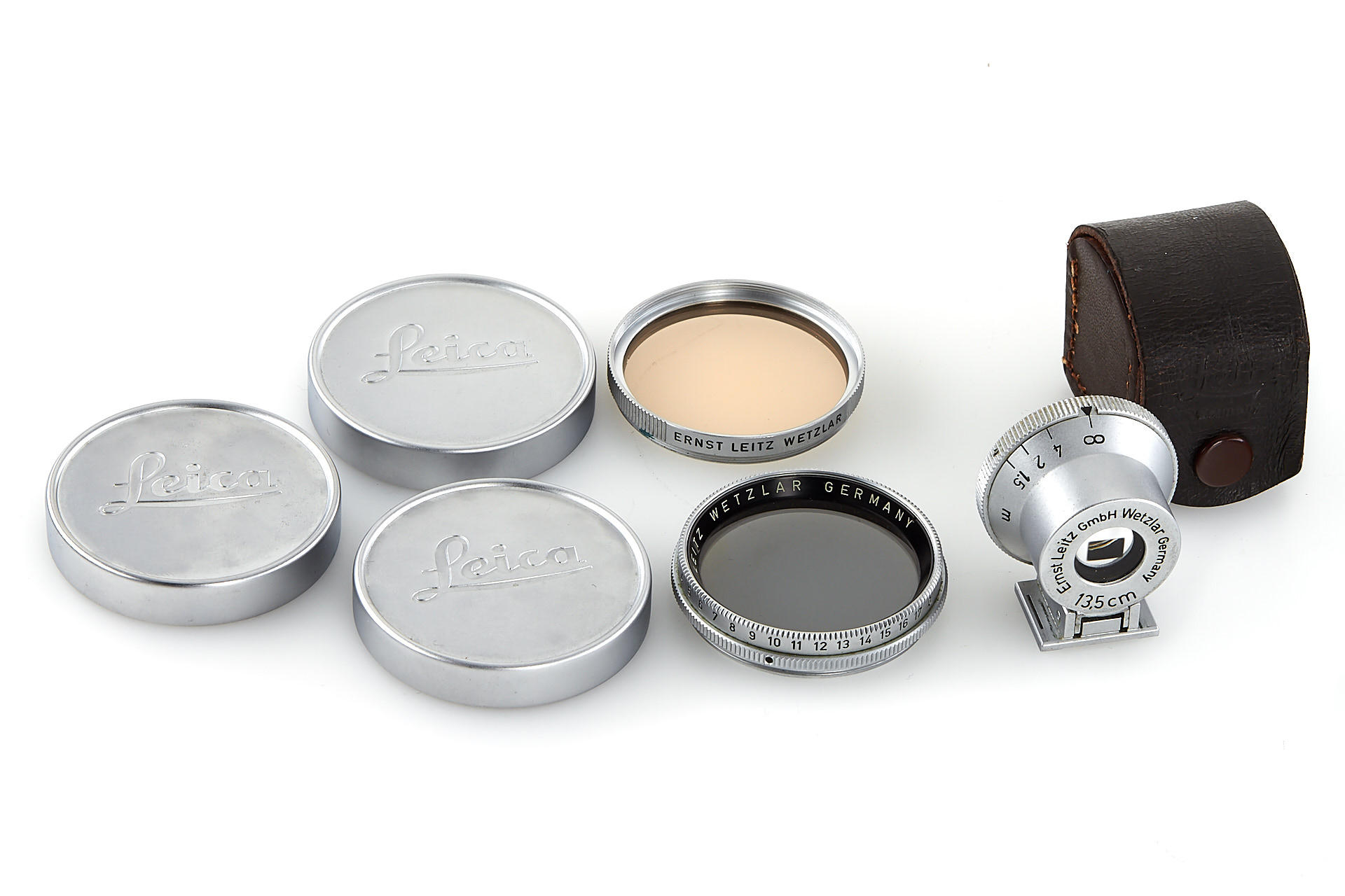 nice M3 outfit in working condition, bright rangefinder with depth of field indicator, including Dual-Range Summicron 2/50mm no.1542145 (with cap, UV filter, early type IROOA hood and SPDOO attachment), Summaron 3.5/3.5cm no.1554385 (hazy, with both caps and M/M39 adapter), Elmarit 2.8/90mm no.1658466 (hazy, aperture not fully opening, with front cap, UV filter, keeper and IUFOO hood), Elmar 4/135mm no. 1801467 (with keeper and SHOOC finder in leather case), Leicameter MR (in leather case, not tested), Leitz E39 CR1.5 filter and Leitz E39 Pol Filter