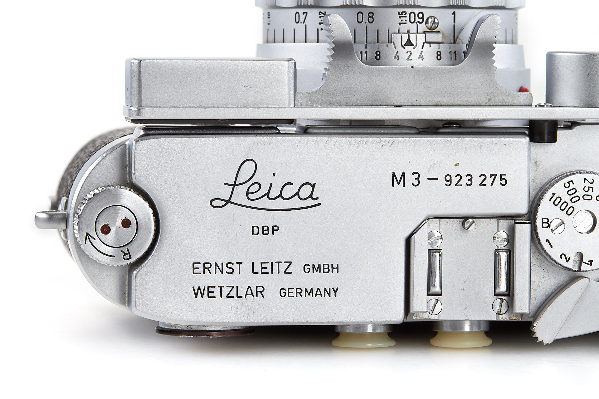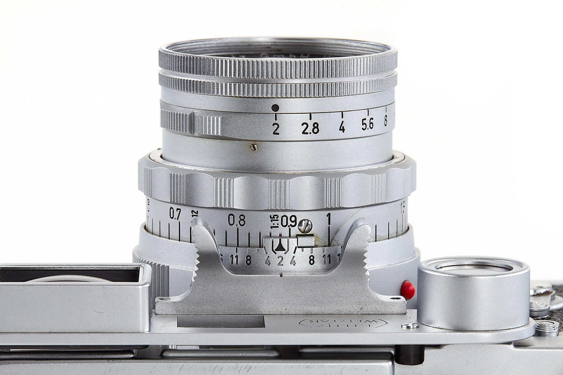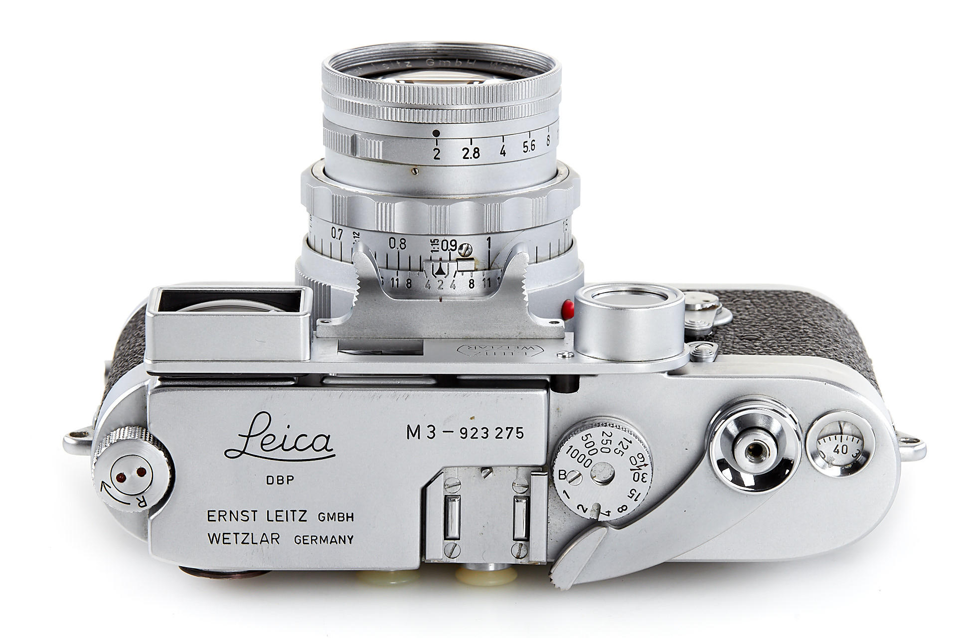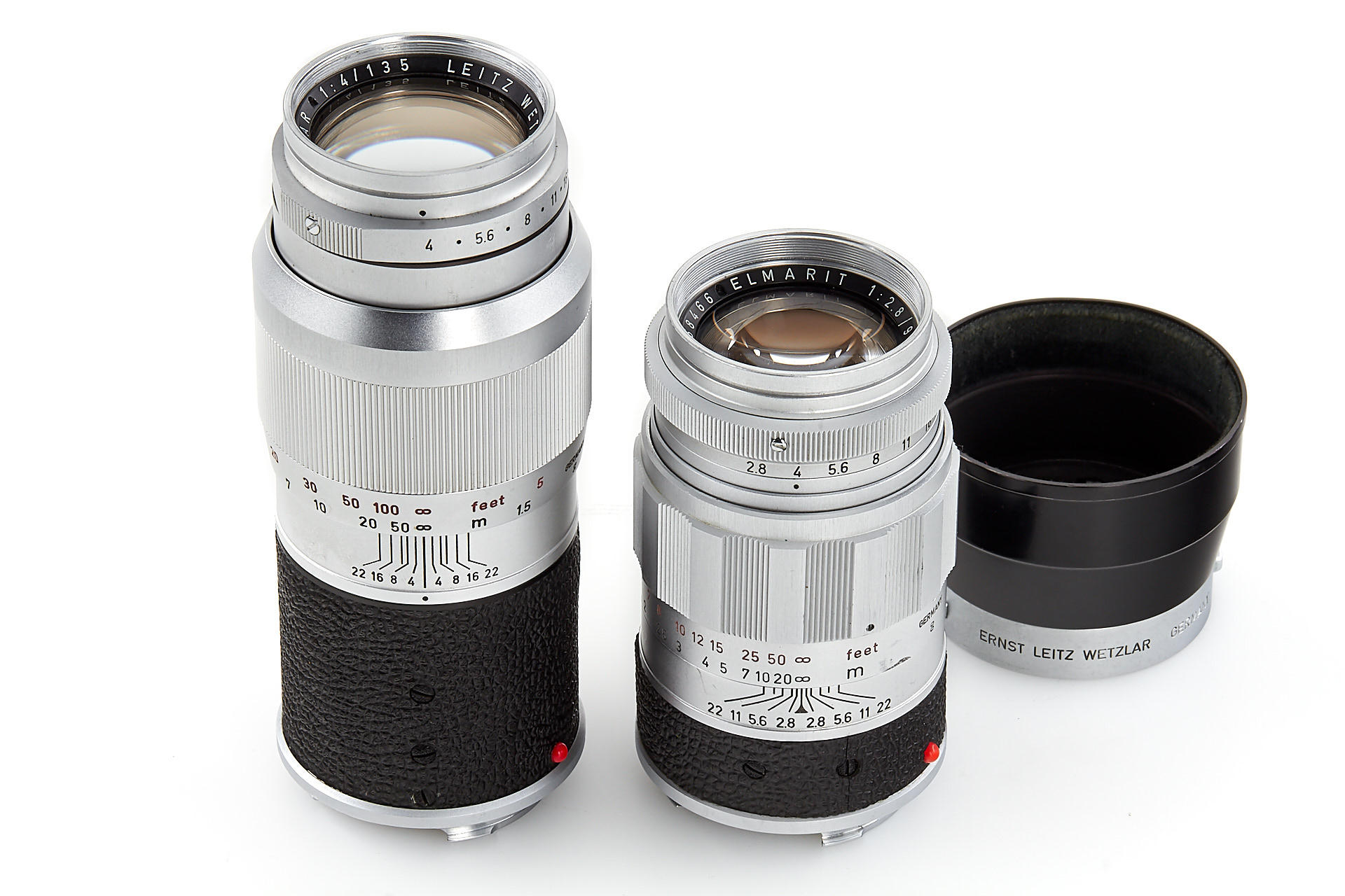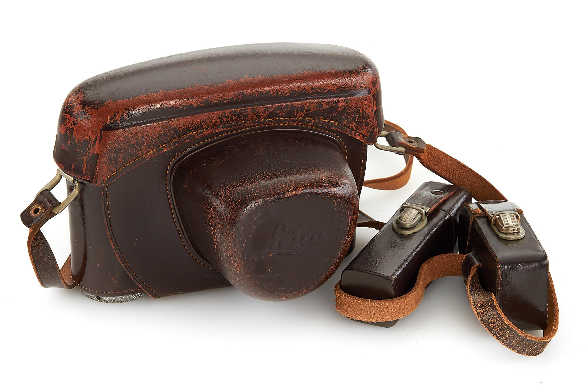 nice M3 outfit in working condition, bright rangefinder with depth of field indicator, including Dual-Range Summicron 2/50mm no.1542145 (with cap, UV filter, early type IROOA hood and SPDOO attachment), Summaron 3.5/3.5cm no.1554385 (hazy, with both caps and M/M39 adapter), Elmarit 2.8/90mm no.1658466 (hazy, aperture not fully opening, with front cap, UV filter, keeper and IUFOO hood), Elmar 4/135mm no. 1801467 (with keeper and SHOOC finder in leather case), Leicameter MR (in leather case, not tested), Leitz E39 CR1.5 filter and Leitz E39 Pol Filter