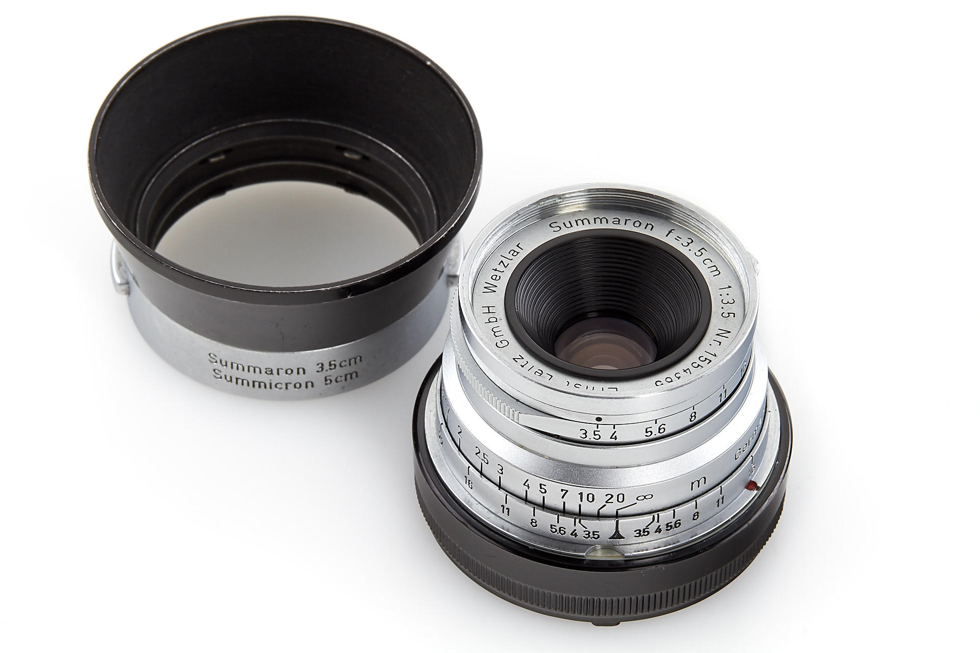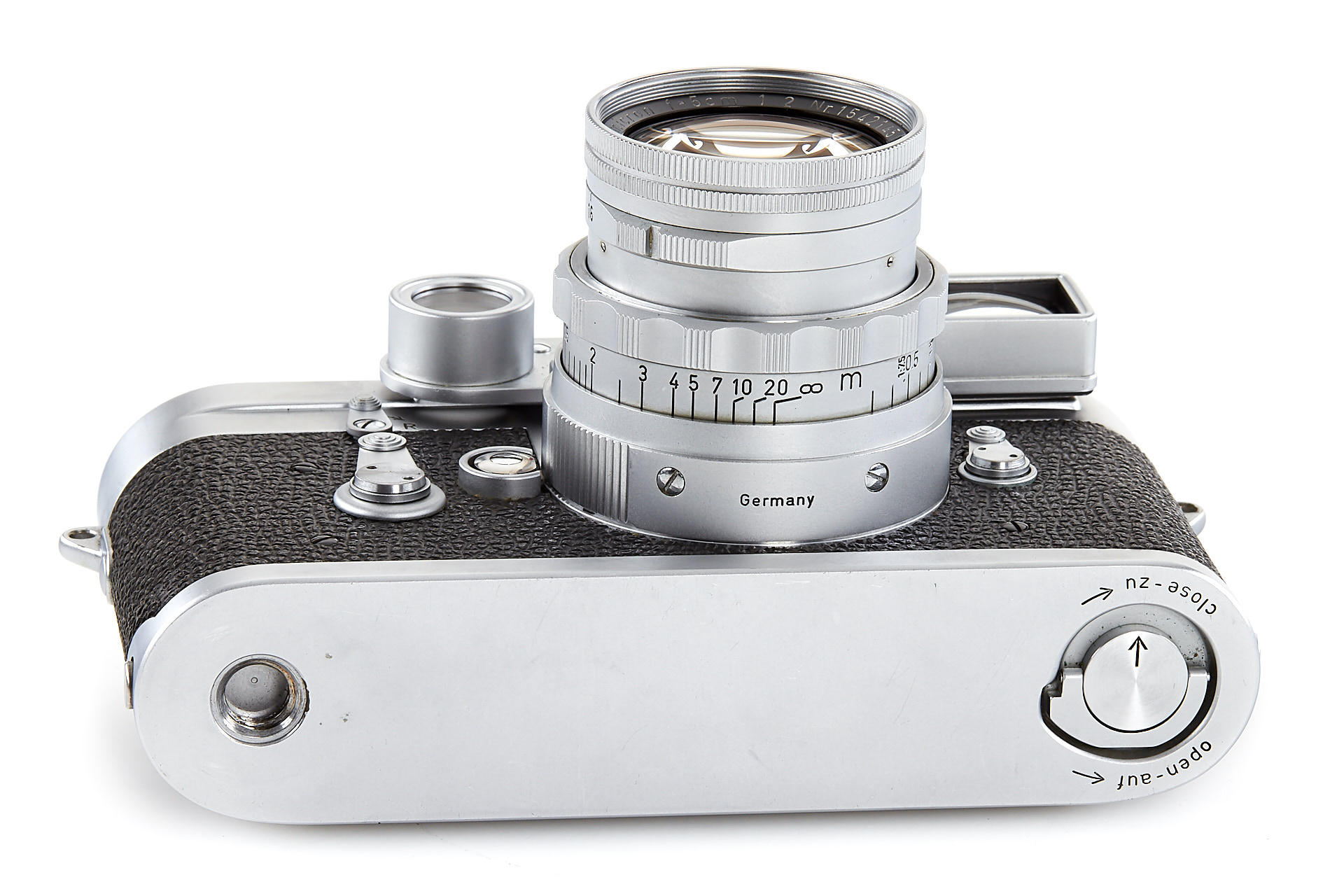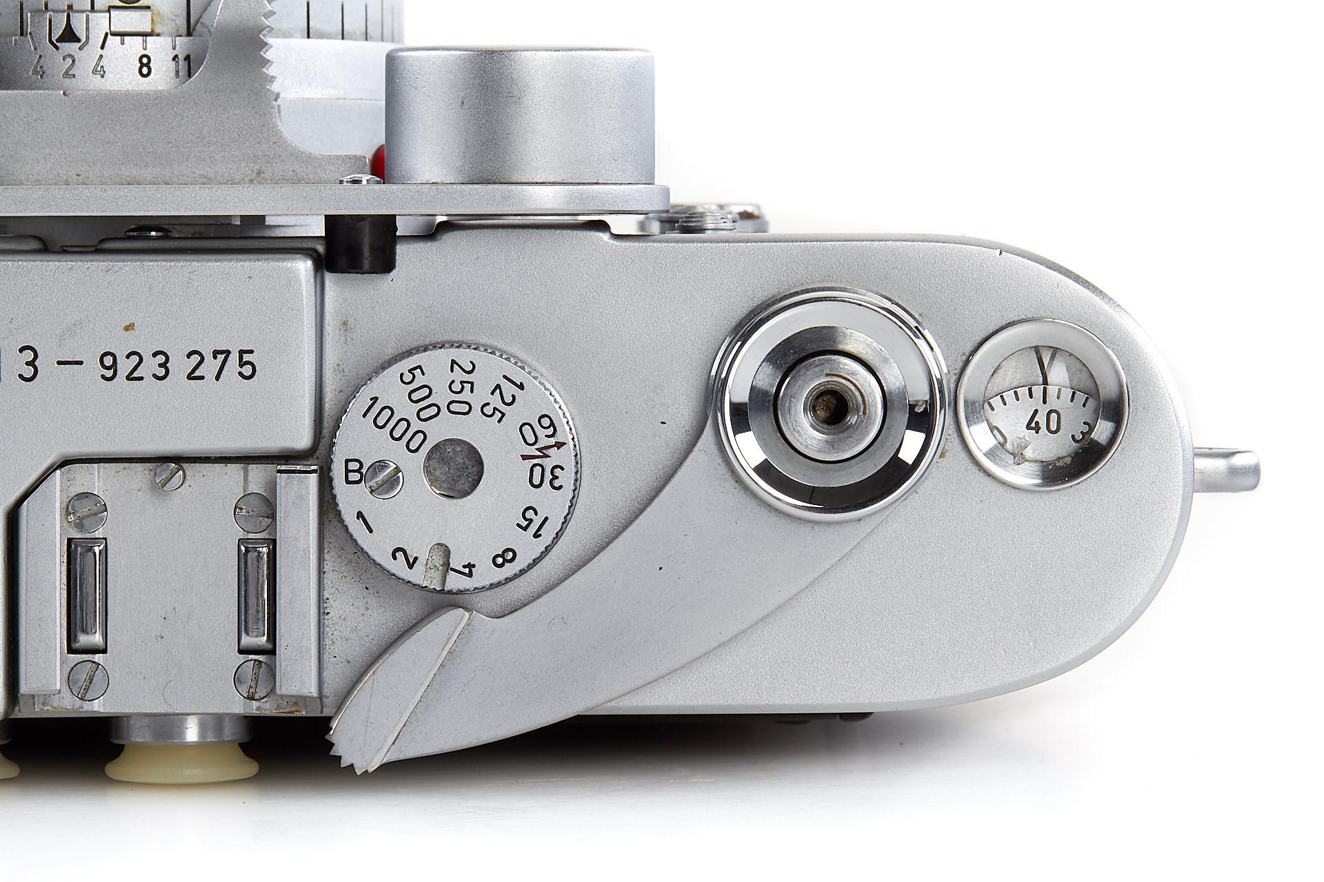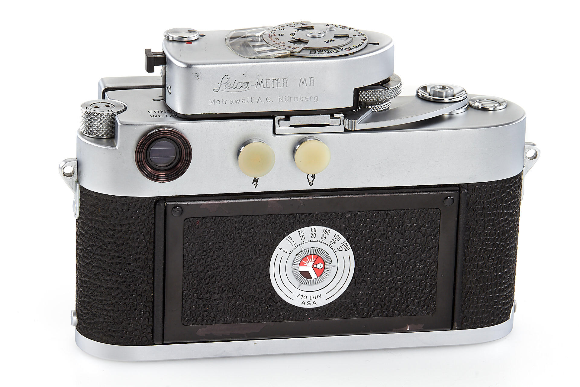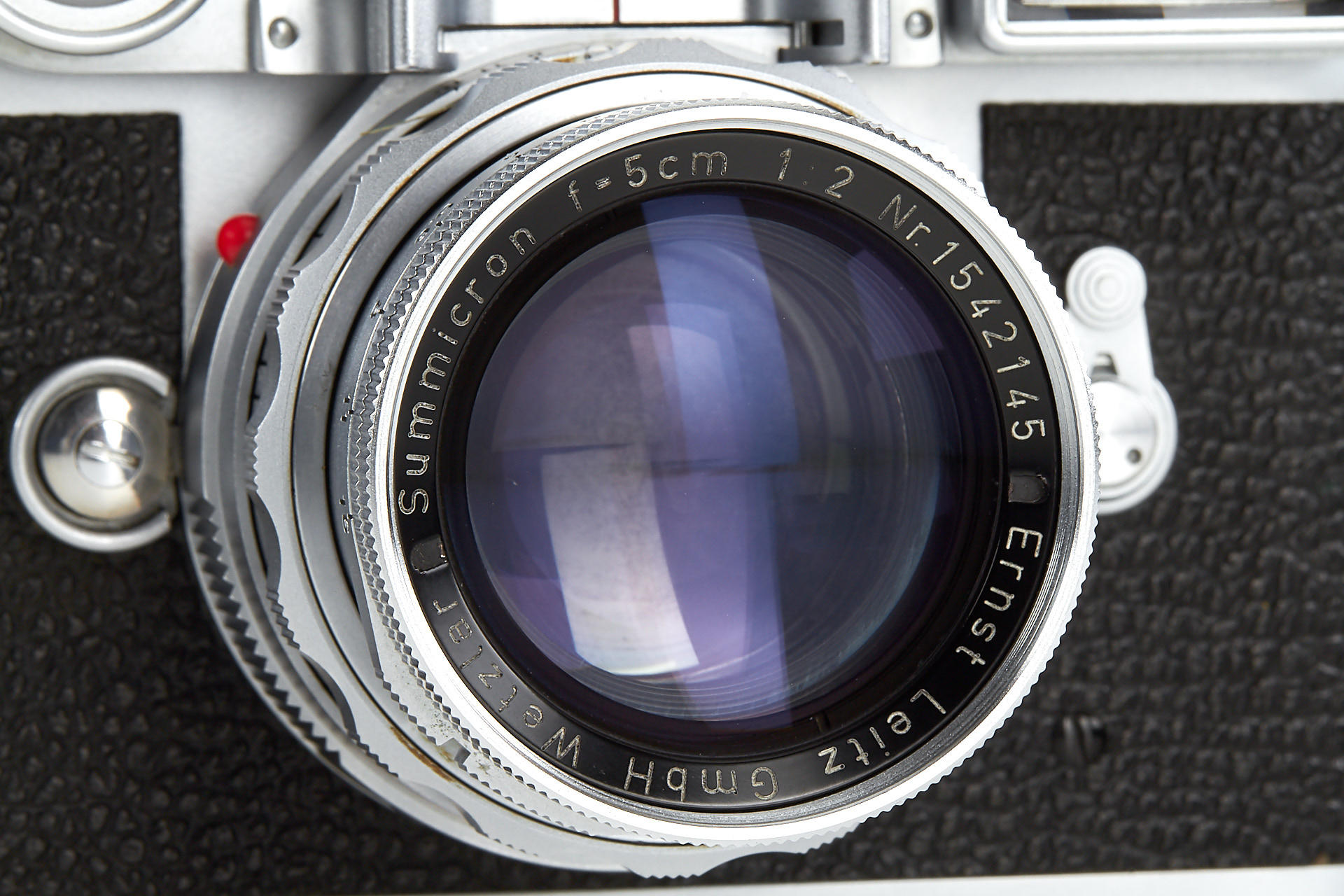nice M3 outfit in working condition, bright rangefinder with depth of field indicator, including Dual-Range Summicron 2/50mm no.1542145 (with cap, UV filter, early type IROOA hood and SPDOO attachment), Summaron 3.5/3.5cm no.1554385 (hazy, with both caps and M/M39 adapter), Elmarit 2.8/90mm no.1658466 (hazy, aperture not fully opening, with front cap, UV filter, keeper and IUFOO hood), Elmar 4/135mm no. 1801467 (with keeper and SHOOC finder in leather case), Leicameter MR (in leather case, not tested), Leitz E39 CR1.5 filter and Leitz E39 Pol Filter