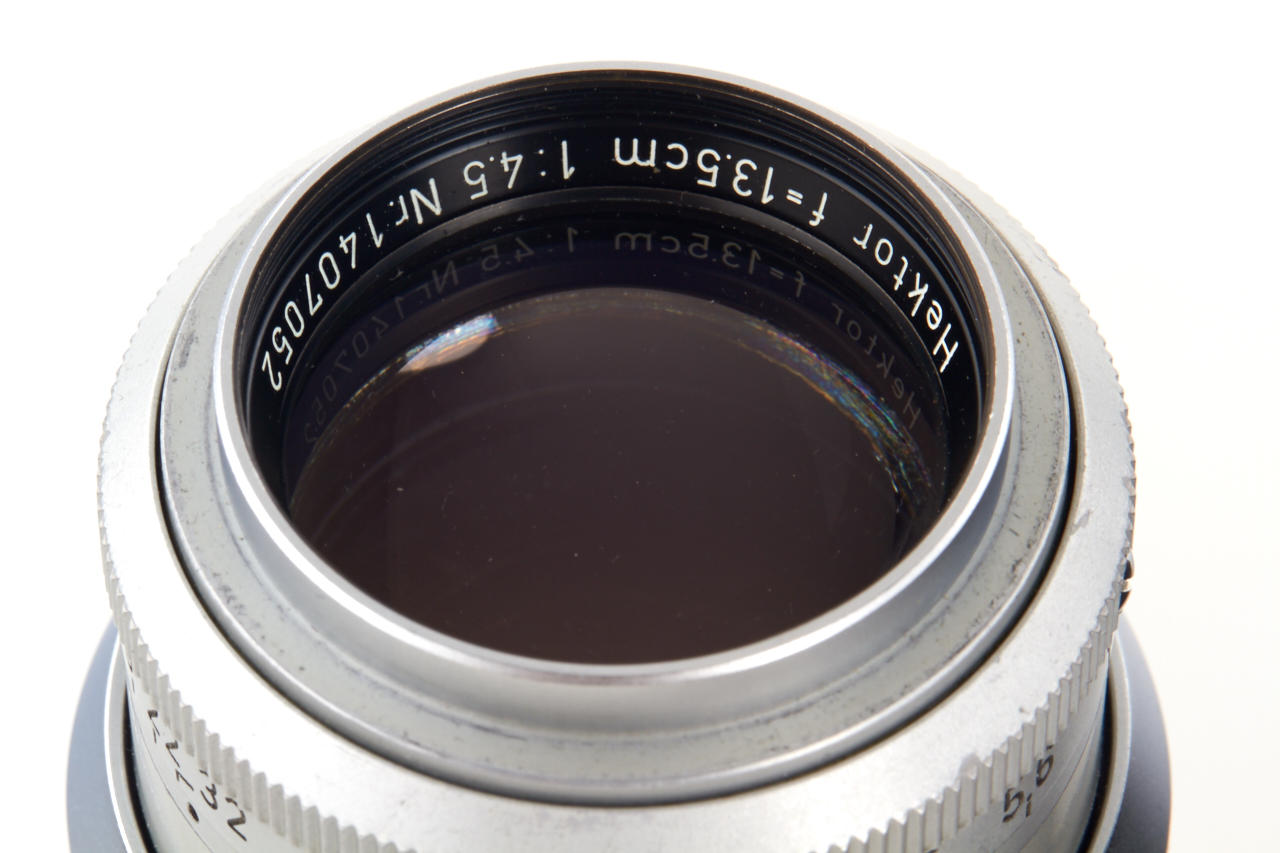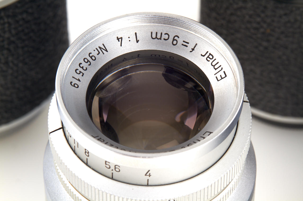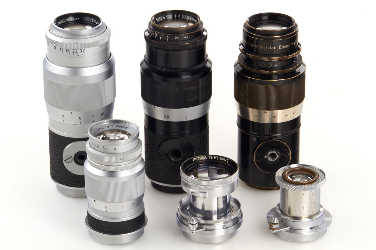 lot of 6 Leica lenses: uncommon chrome Hektor 2,5/5cm no.151893 (cleaning marks and minimal separation), near mint Summitar 2/5cm no.658307, rare uncoupled, black/nickel Elmar 4.5/13.5cm (unnumbered, optics coated after the war), together with black/chrome Hektor 4.5/13.5cm no.699886, chrome Hektor 4.5/13.5cm no.1407052 and chrome Elmar 4/9cm no.963519