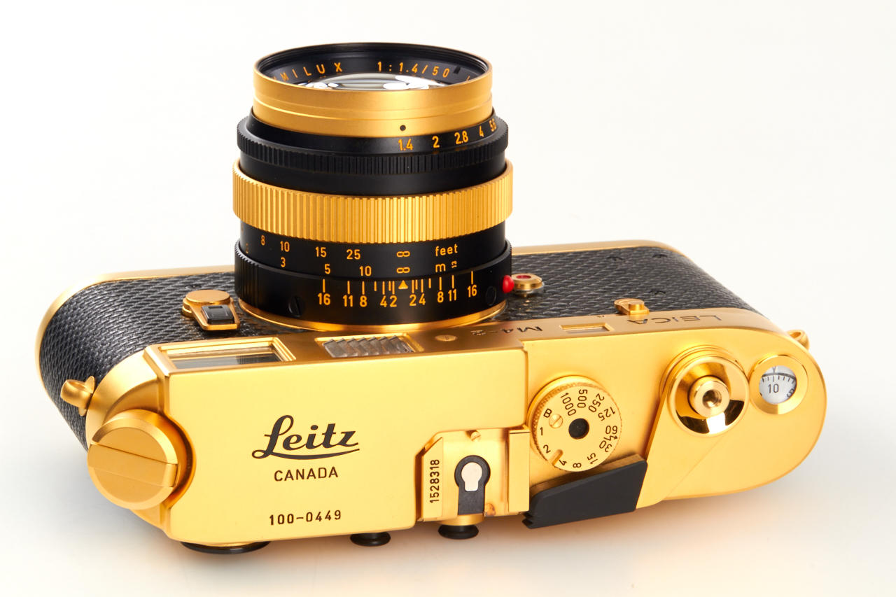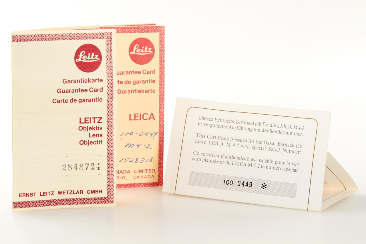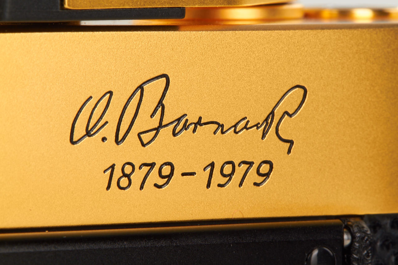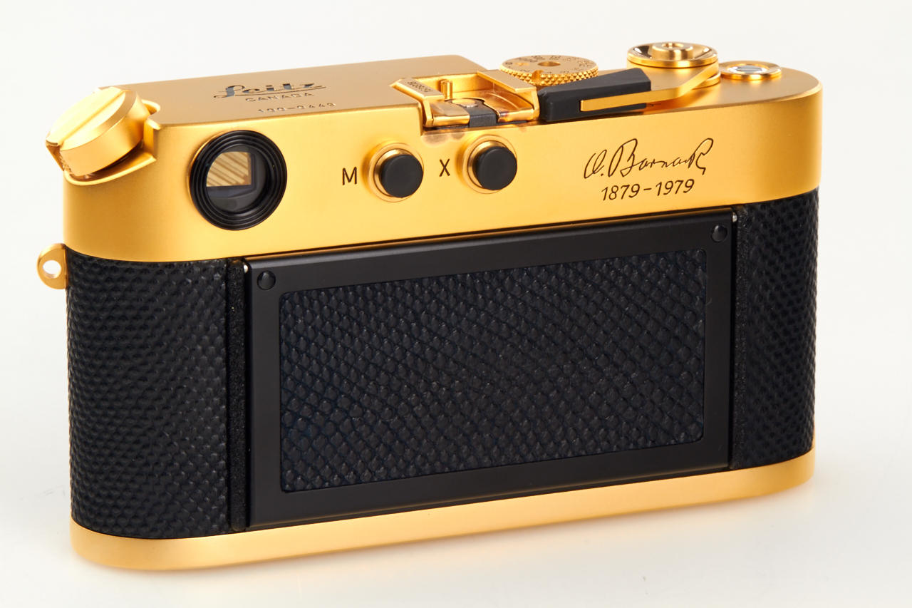 limited gold plated edition for the 100th anniversary of the birth of the Oskar Barnack, special edition number 100-0449, in mint condition, with gold plated Summilux 1.4/50mm no.2848724, caps, hood, wooden presentation box, warranty cards, certificate, and maker's box for the lens