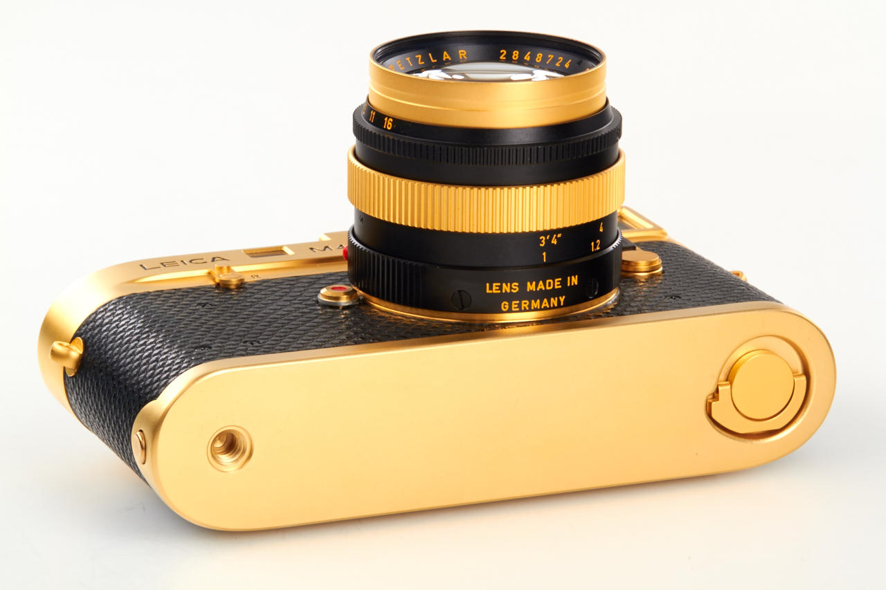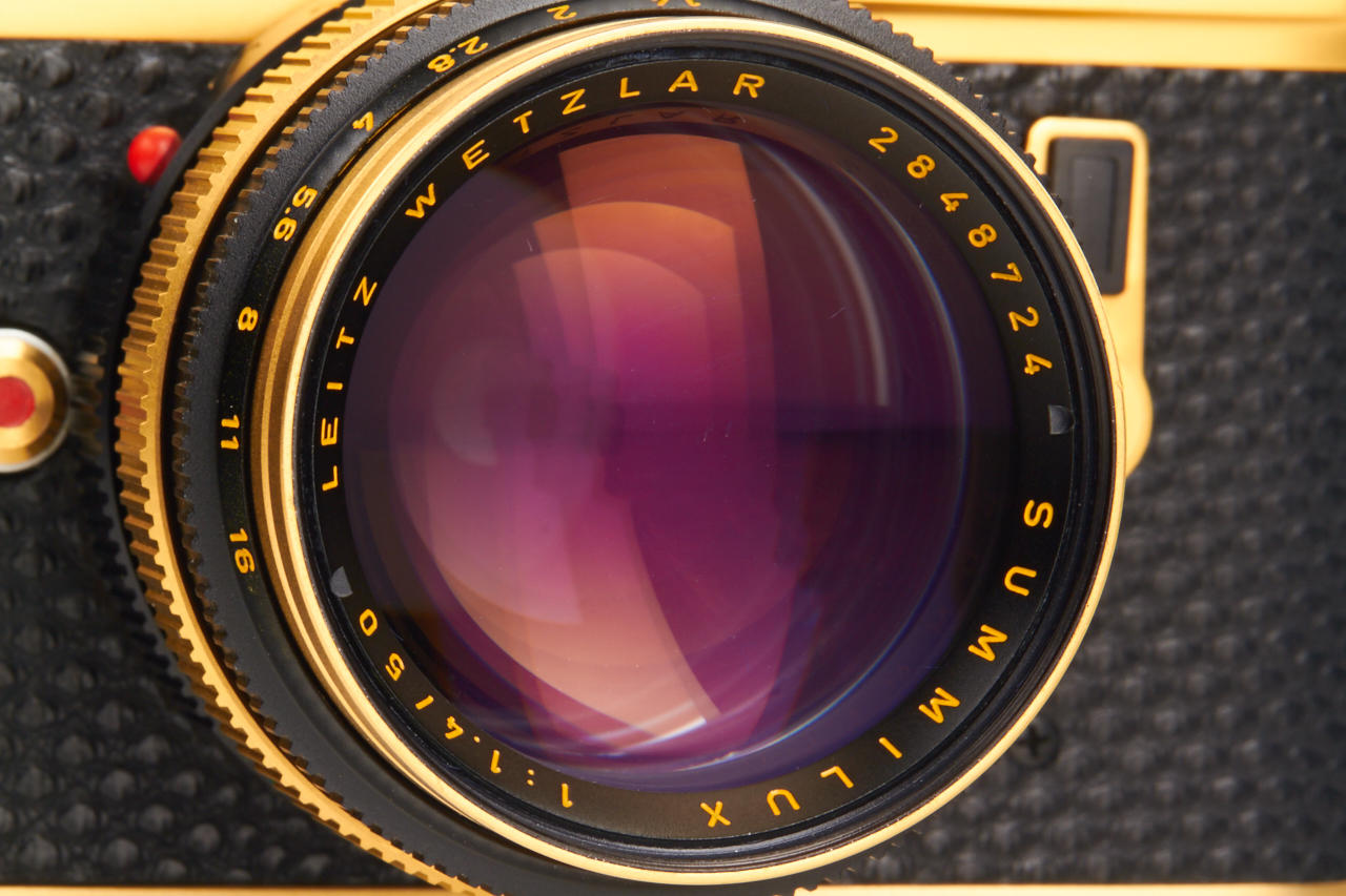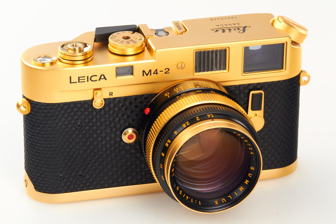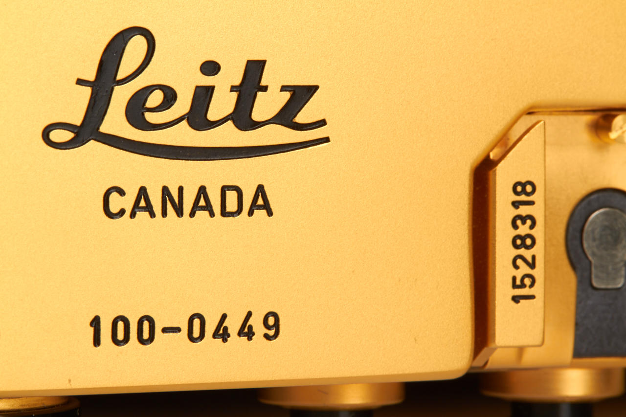 limited gold plated edition for the 100th anniversary of the birth of the Oskar Barnack, special edition number 100-0449, in mint condition, with gold plated Summilux 1.4/50mm no.2848724, caps, hood, wooden presentation box, warranty cards, certificate, and maker's box for the lens