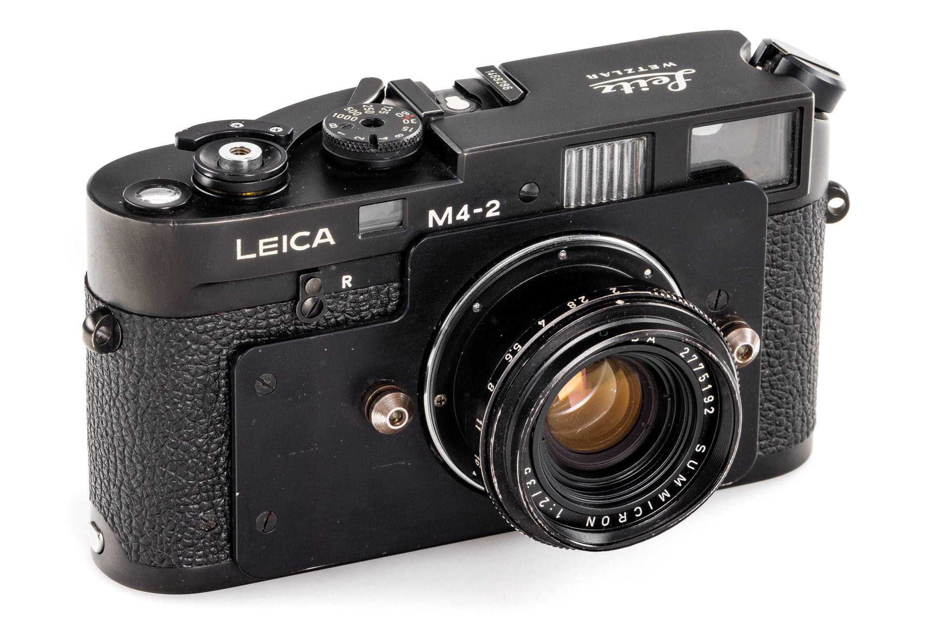 the rarest version of all Leica post cameras, a specially modified M4-2 with special 6-element Summicron 2/35mm no.2775192, made for the Dutch post offices, including the original complete flash unit and large carrying case