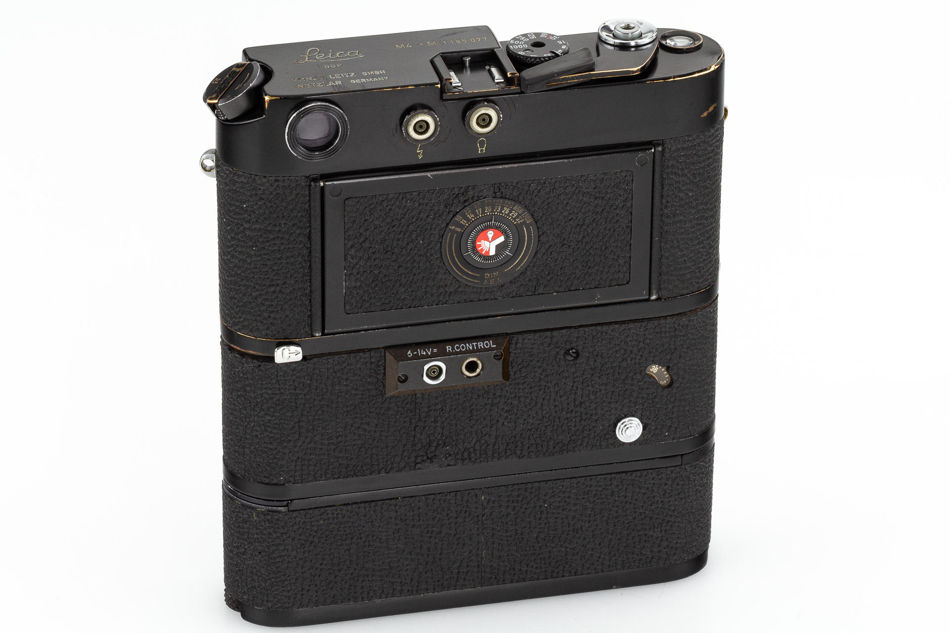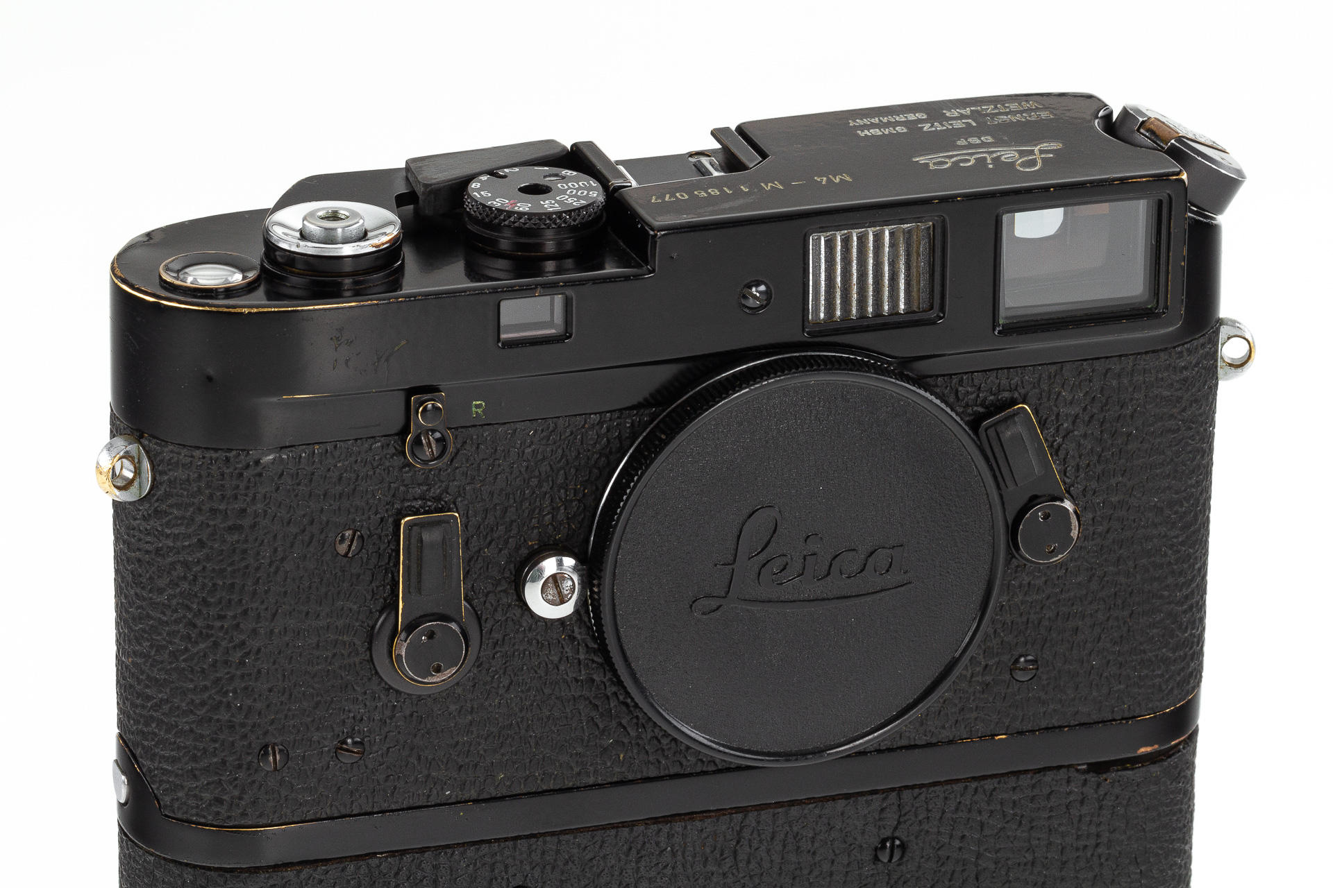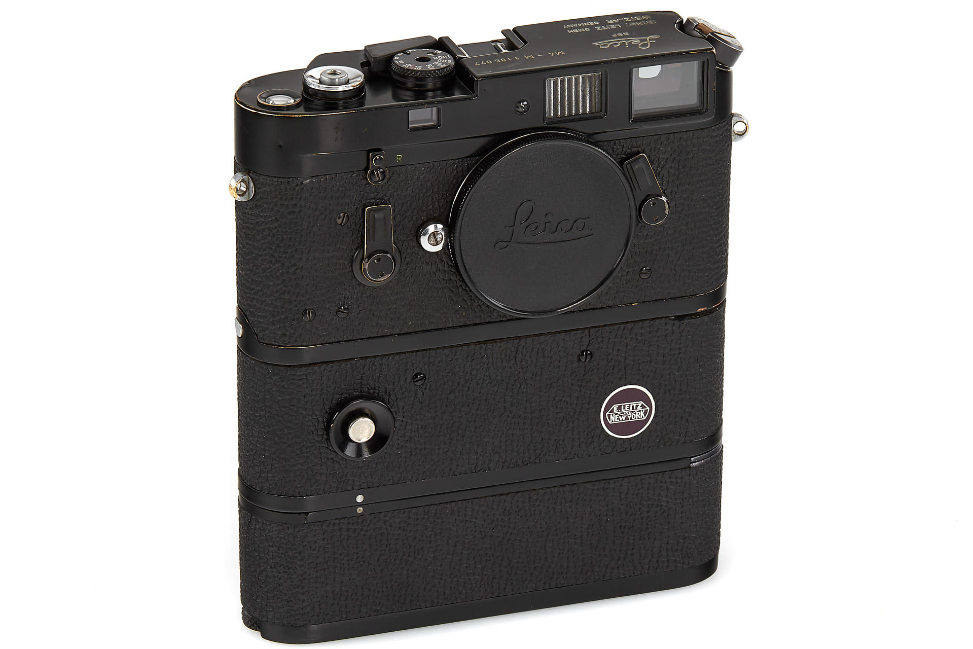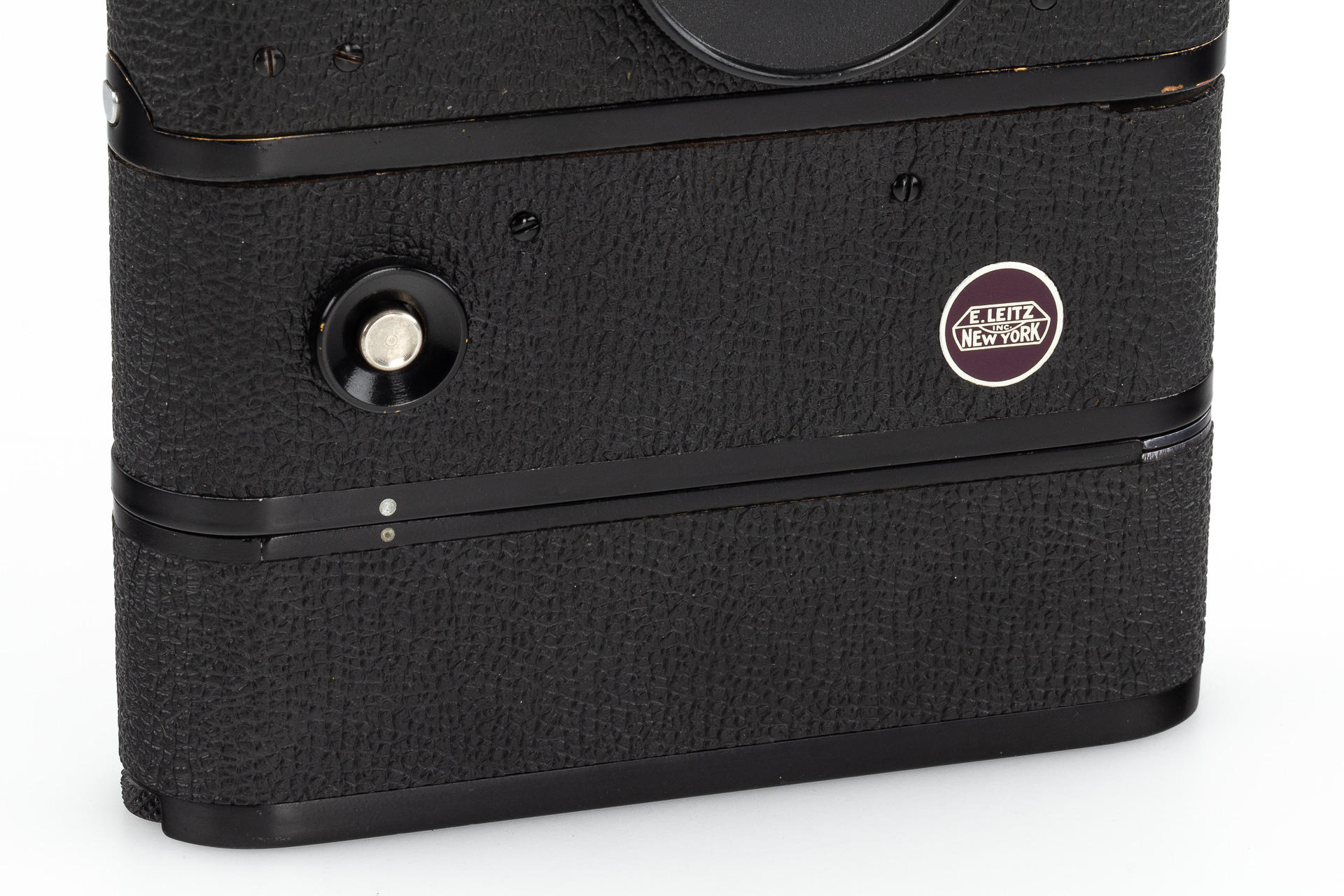 original M4 MOT black paint from the first batch of 150 cameras in good working condition, with matching E.Leitz New York Motor Drive 14000 no.2883 with "AA" battery pack, regular base plate