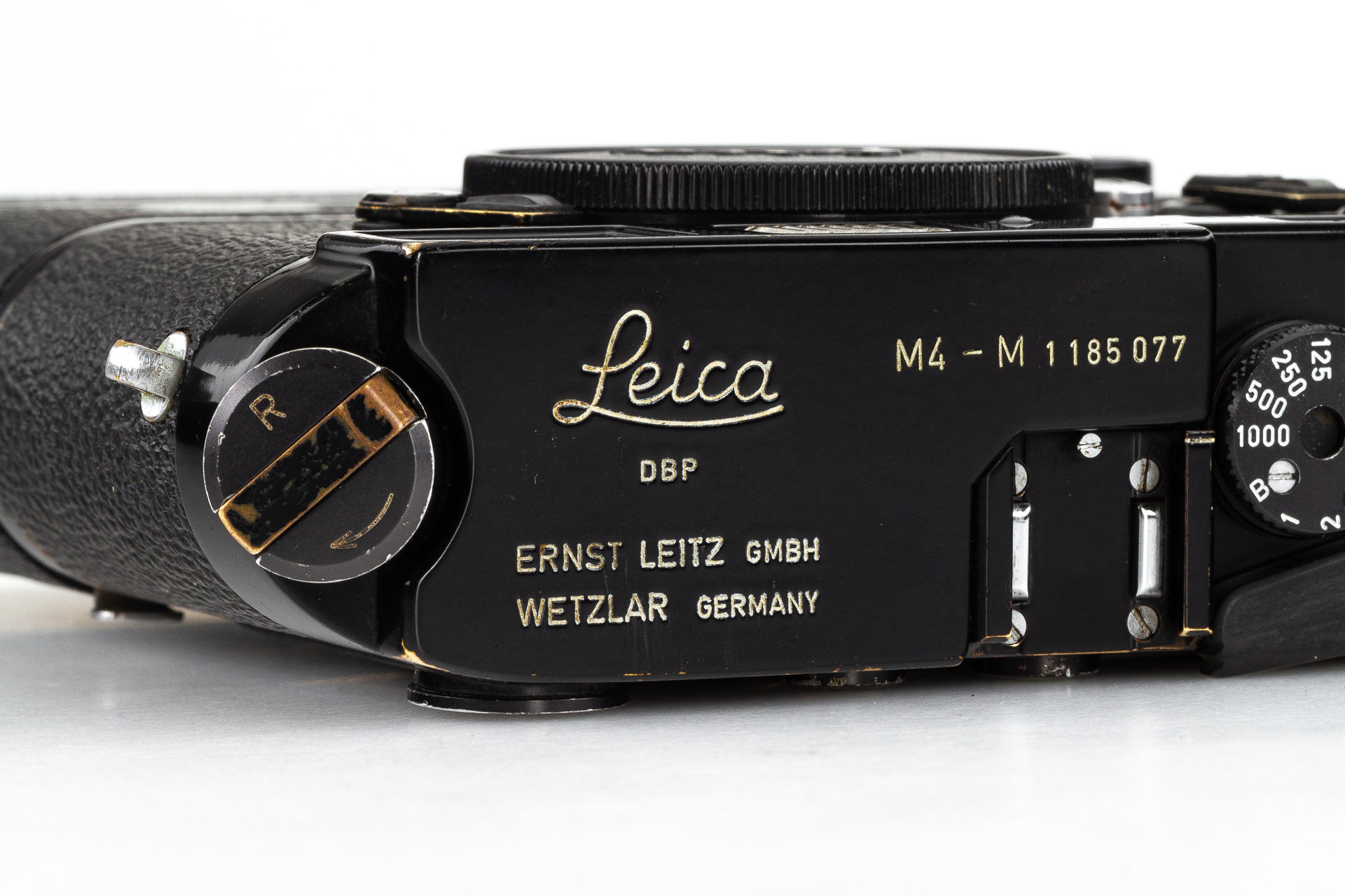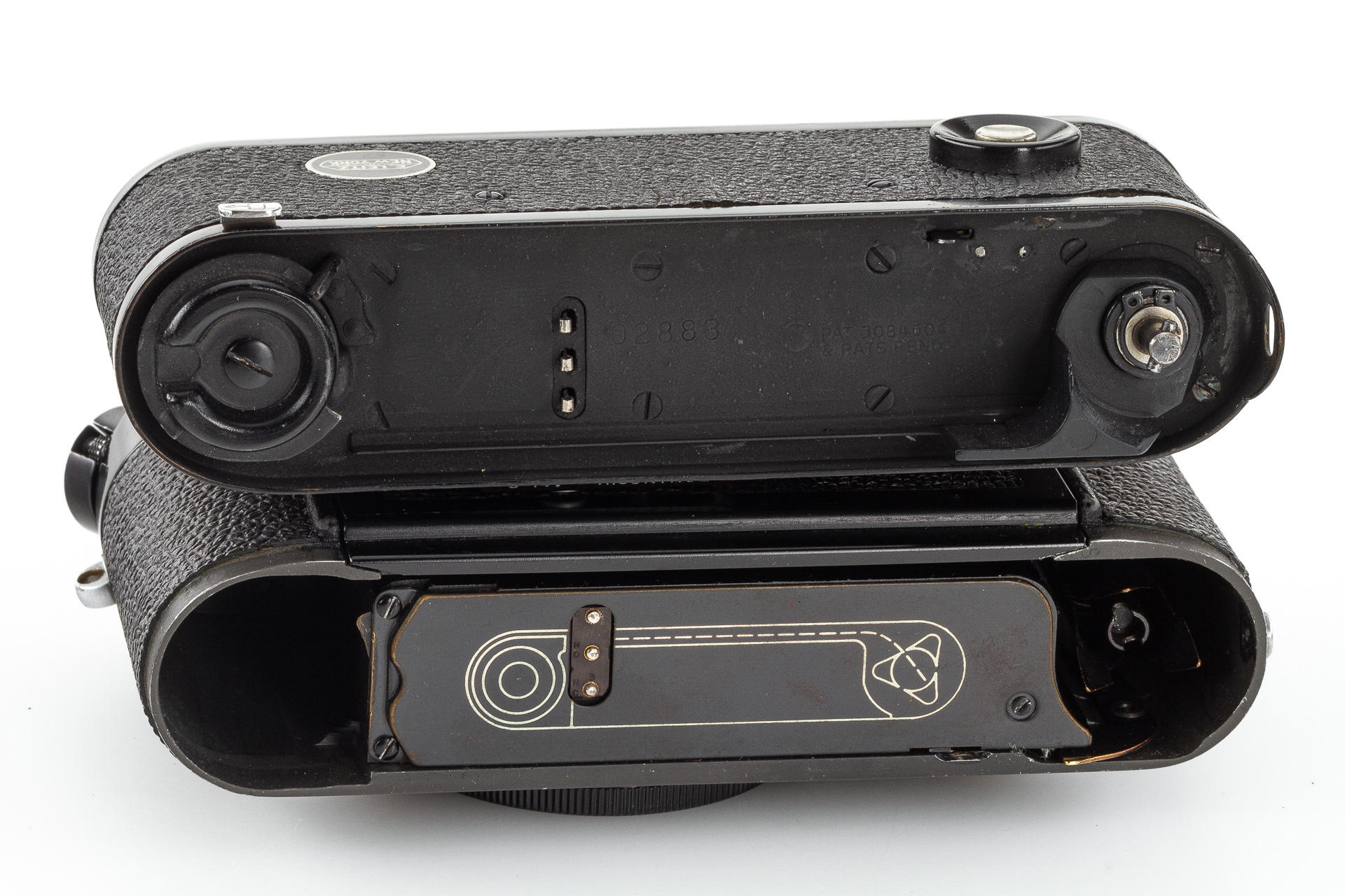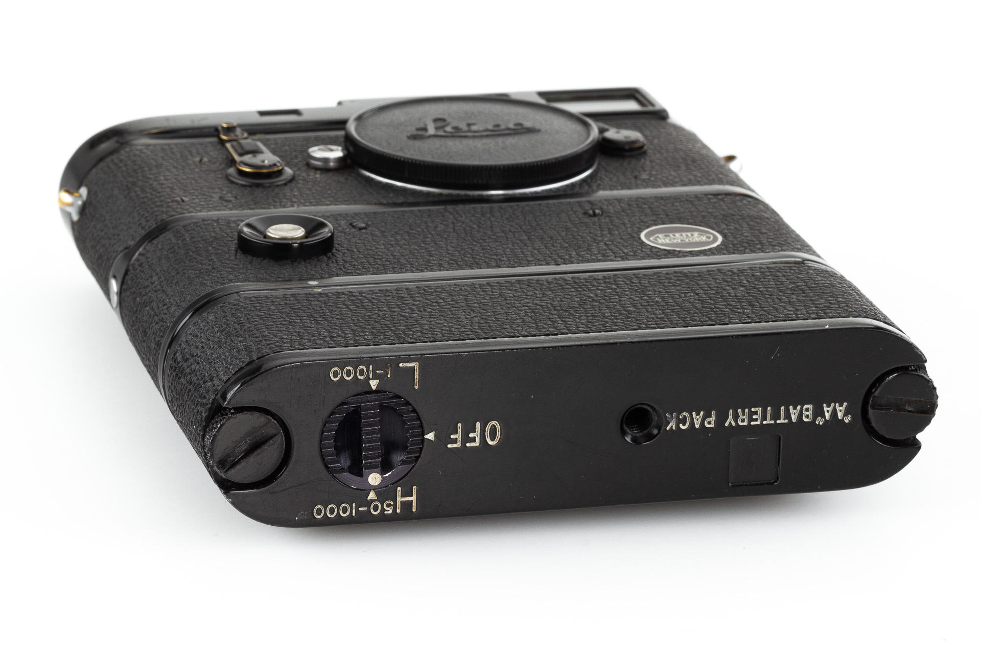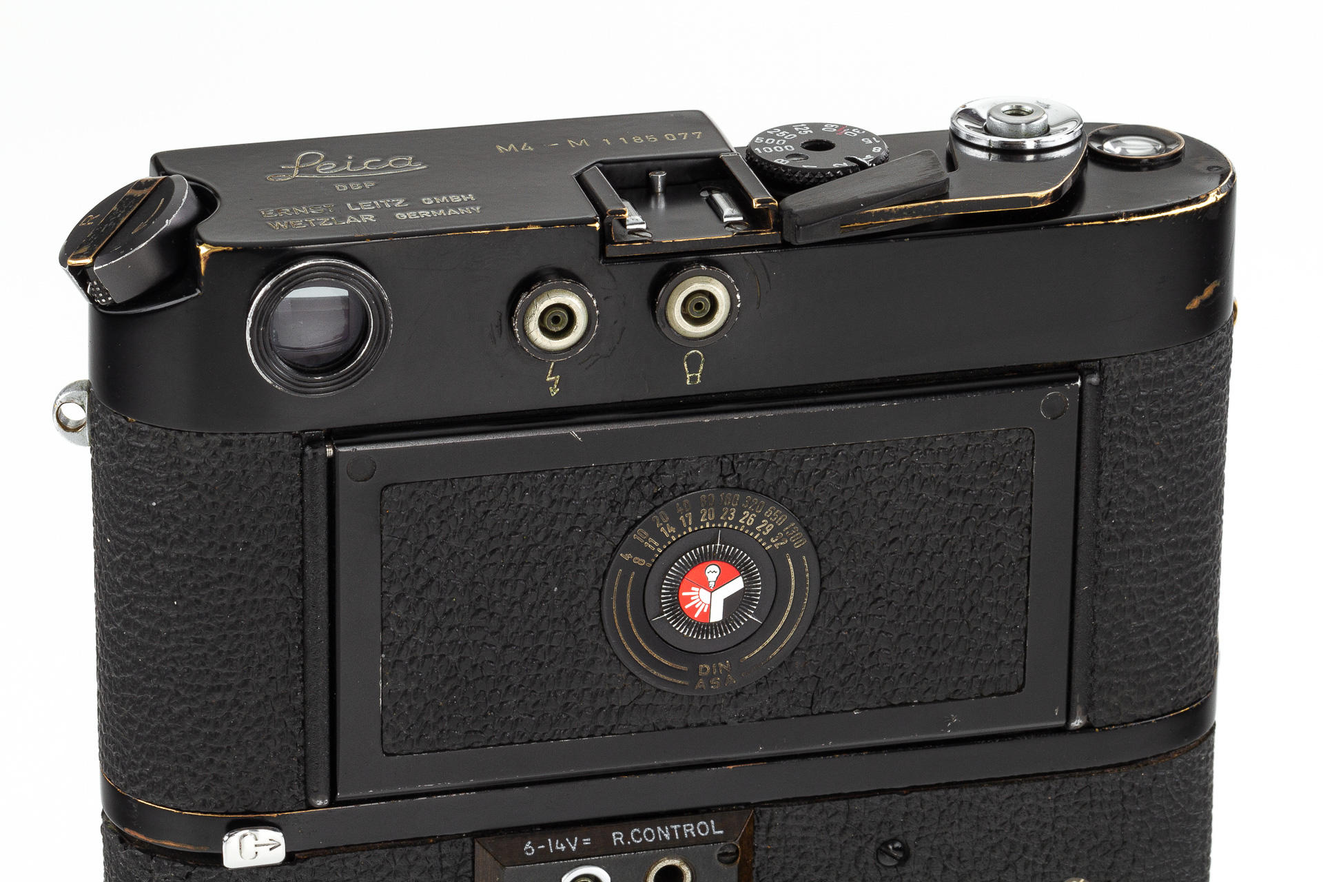 original M4 MOT black paint from the first batch of 150 cameras in good working condition, with matching E.Leitz New York Motor Drive 14000 no.2883 with "AA" battery pack, regular base plate