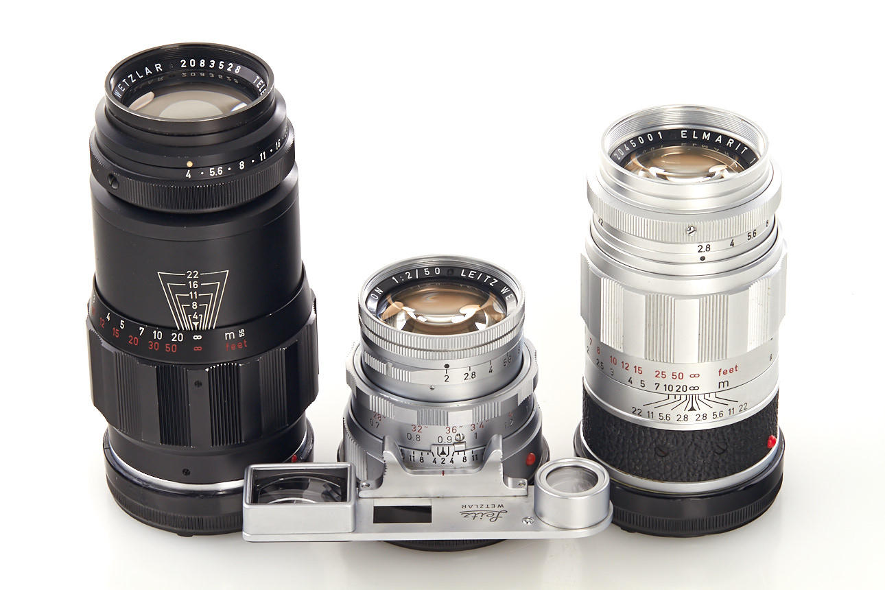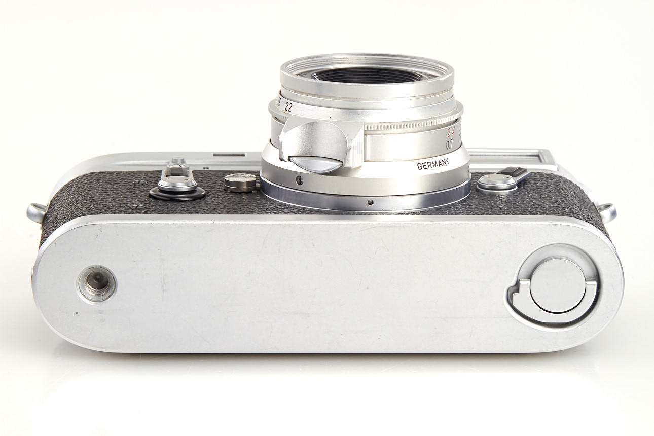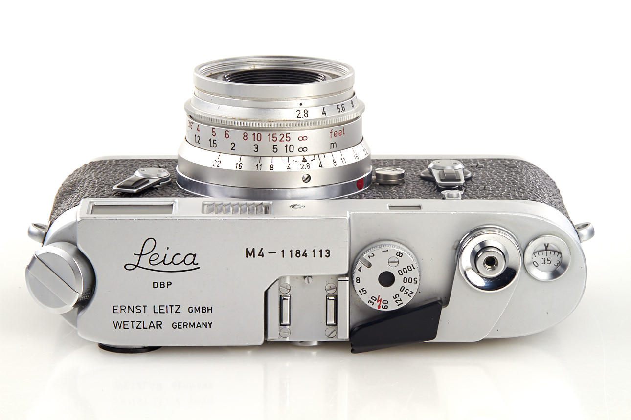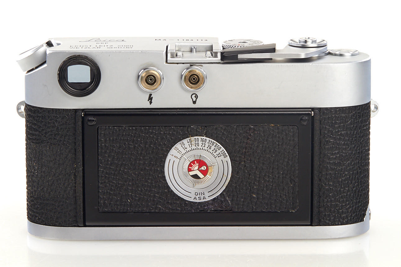 very rare Leitz dealer's M4 presentation case, complete set with perfect working M4 body no.1184113 (cond. B+, body cap), Summaron 2.8/35mm no.1931844 (cond. B/A, clean optics, both caps), close-focus Summicron 2/50mm no.1944303 (cond. B/A, clean optics, caps, SDPOO attachment, 12585 hood), Elmarit 2.8/90mm no.2045001 (A/B, caps), Tele-Elmar 4/135mm no.2083528 (B/A, clean optics, caps, 12575 hood with cap), leather strap and keys for the case