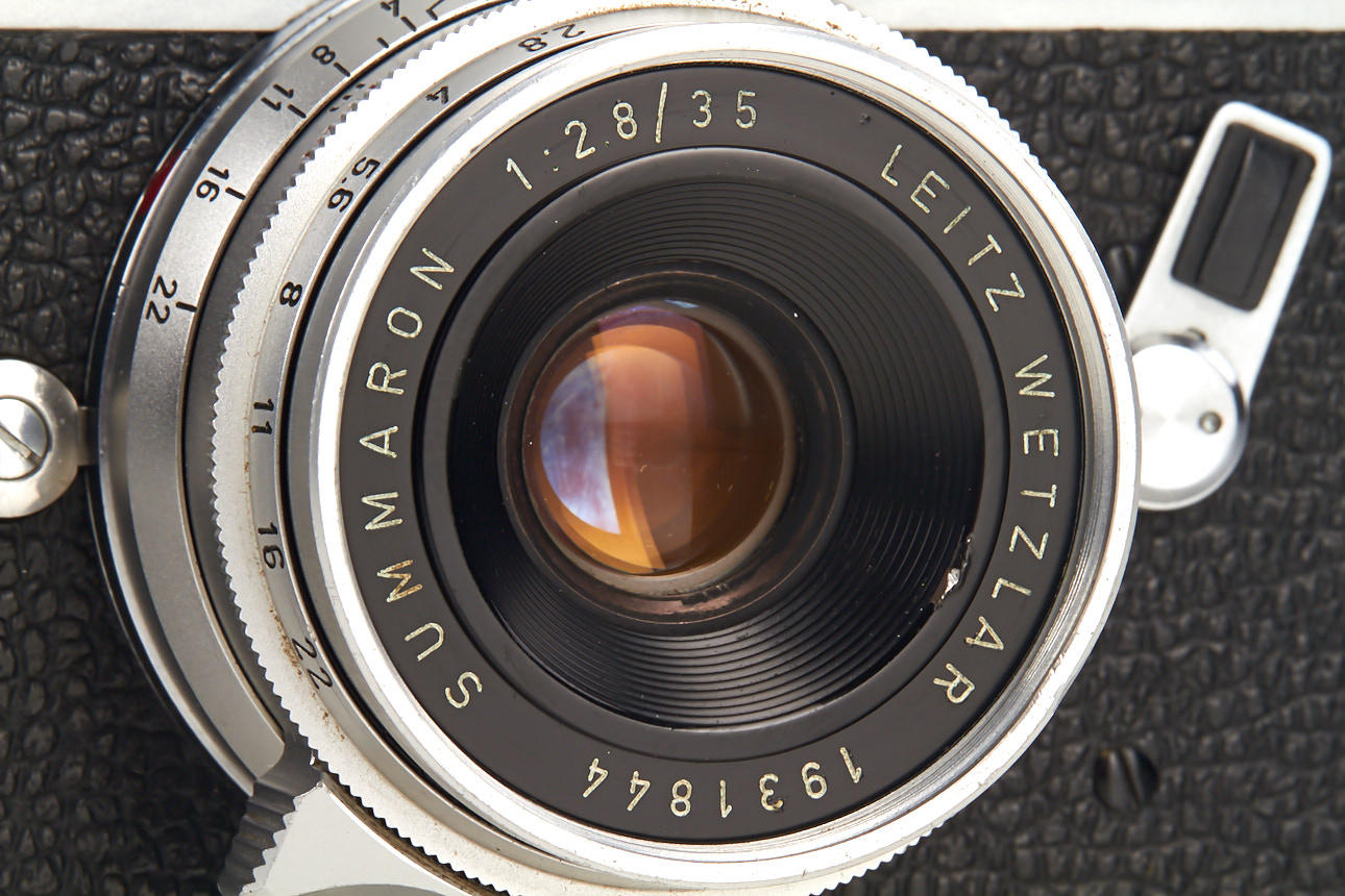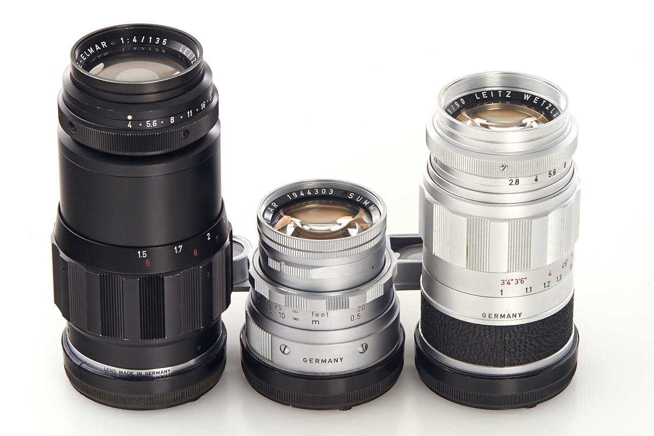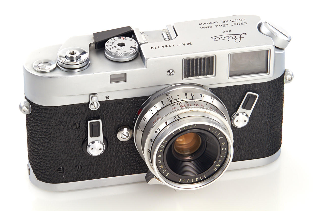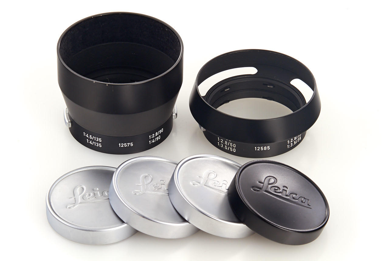 very rare Leitz dealer's M4 presentation case, complete set with perfect working M4 body no.1184113 (cond. B+, body cap), Summaron 2.8/35mm no.1931844 (cond. B/A, clean optics, both caps), close-focus Summicron 2/50mm no.1944303 (cond. B/A, clean optics, caps, SDPOO attachment, 12585 hood), Elmarit 2.8/90mm no.2045001 (A/B, caps), Tele-Elmar 4/135mm no.2083528 (B/A, clean optics, caps, 12575 hood with cap), leather strap and keys for the case