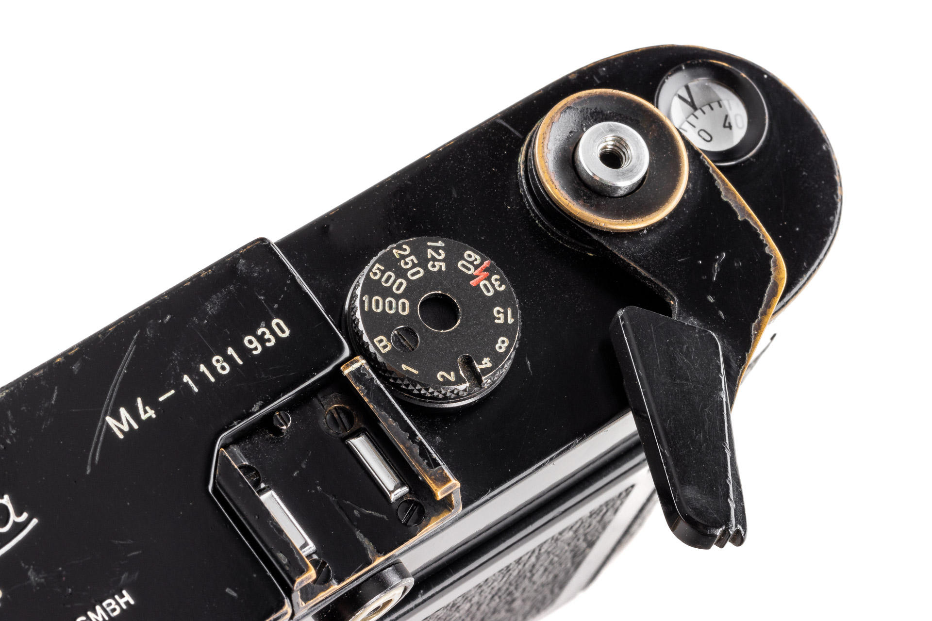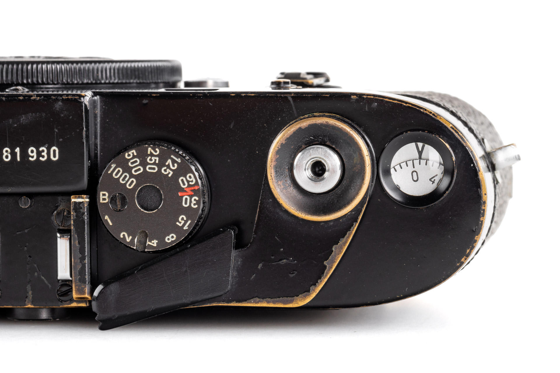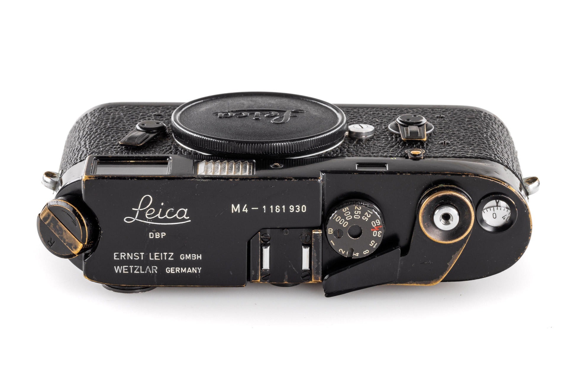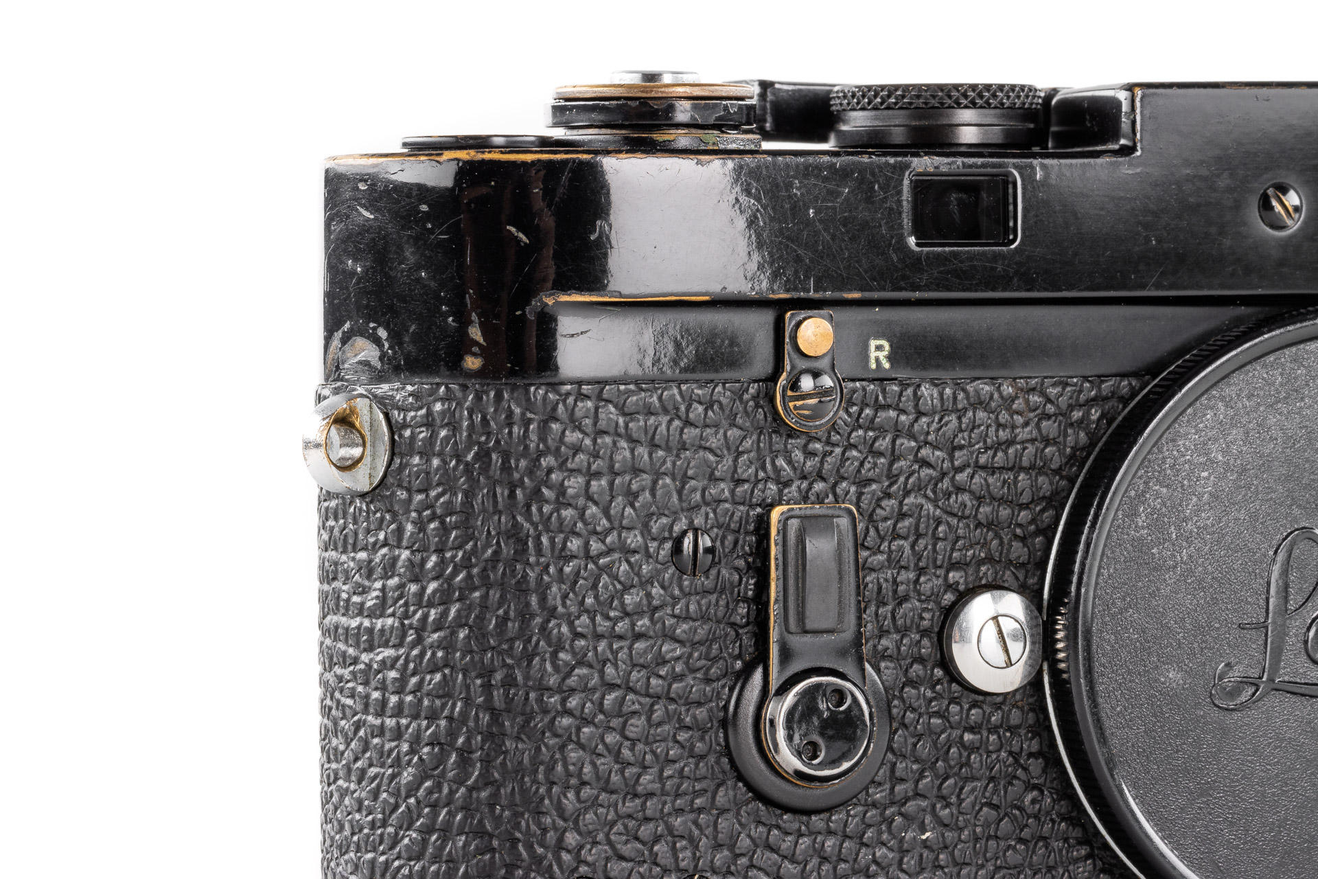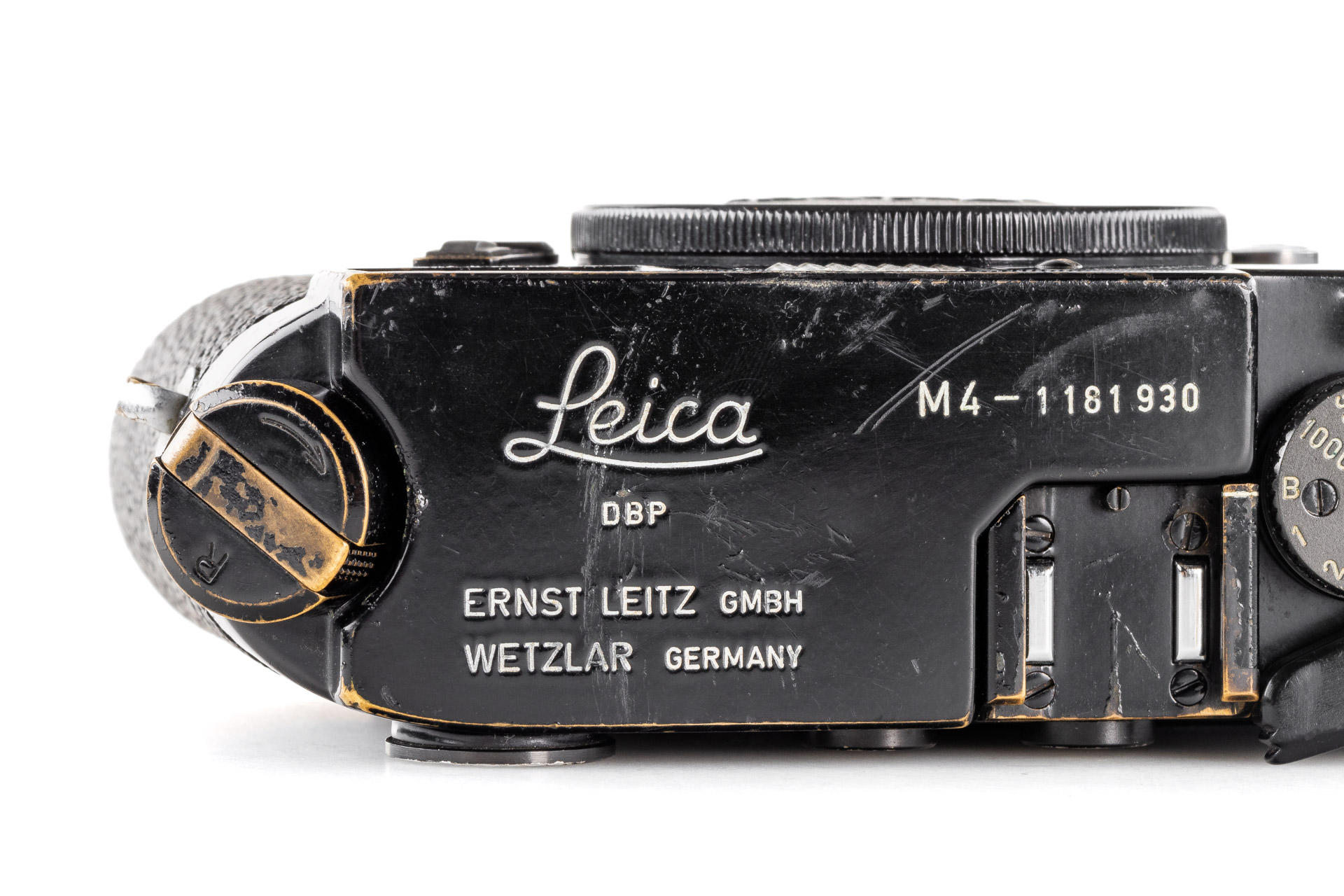 rare black paint M4 from the first production batch, in very good cosmetic condition, only slight brassing around the edges, top plate replaced by Leitz around 1970, correct brass rewind knob and levers on the front, in perfect working order, including a black ever ready case