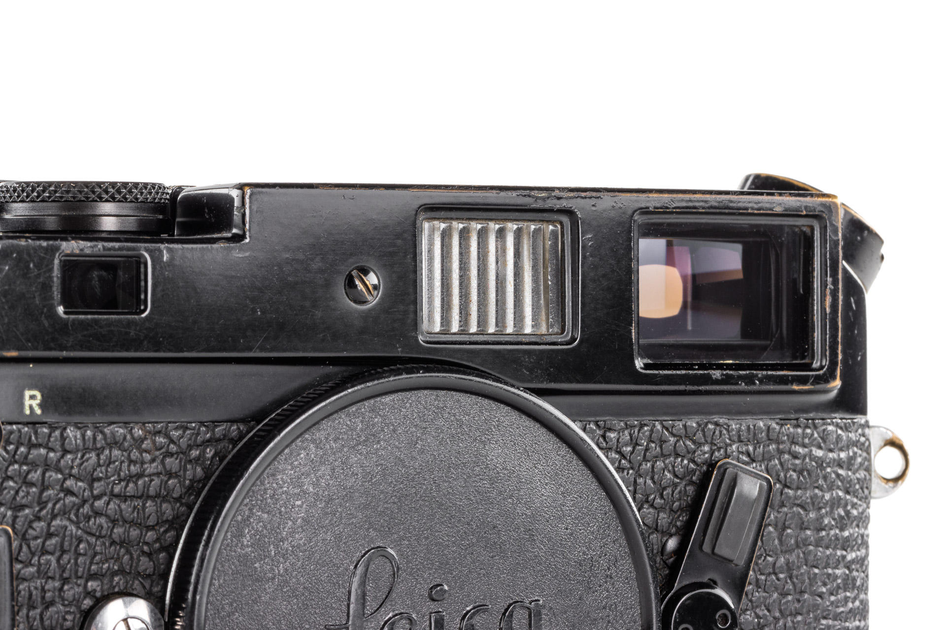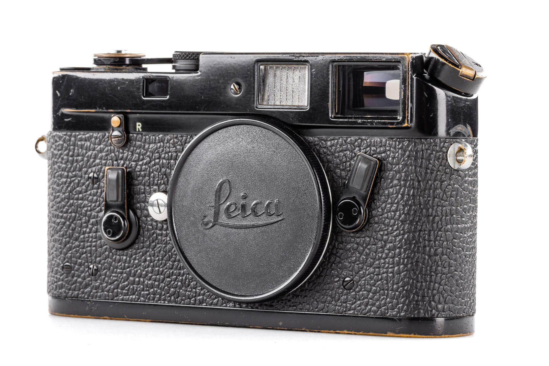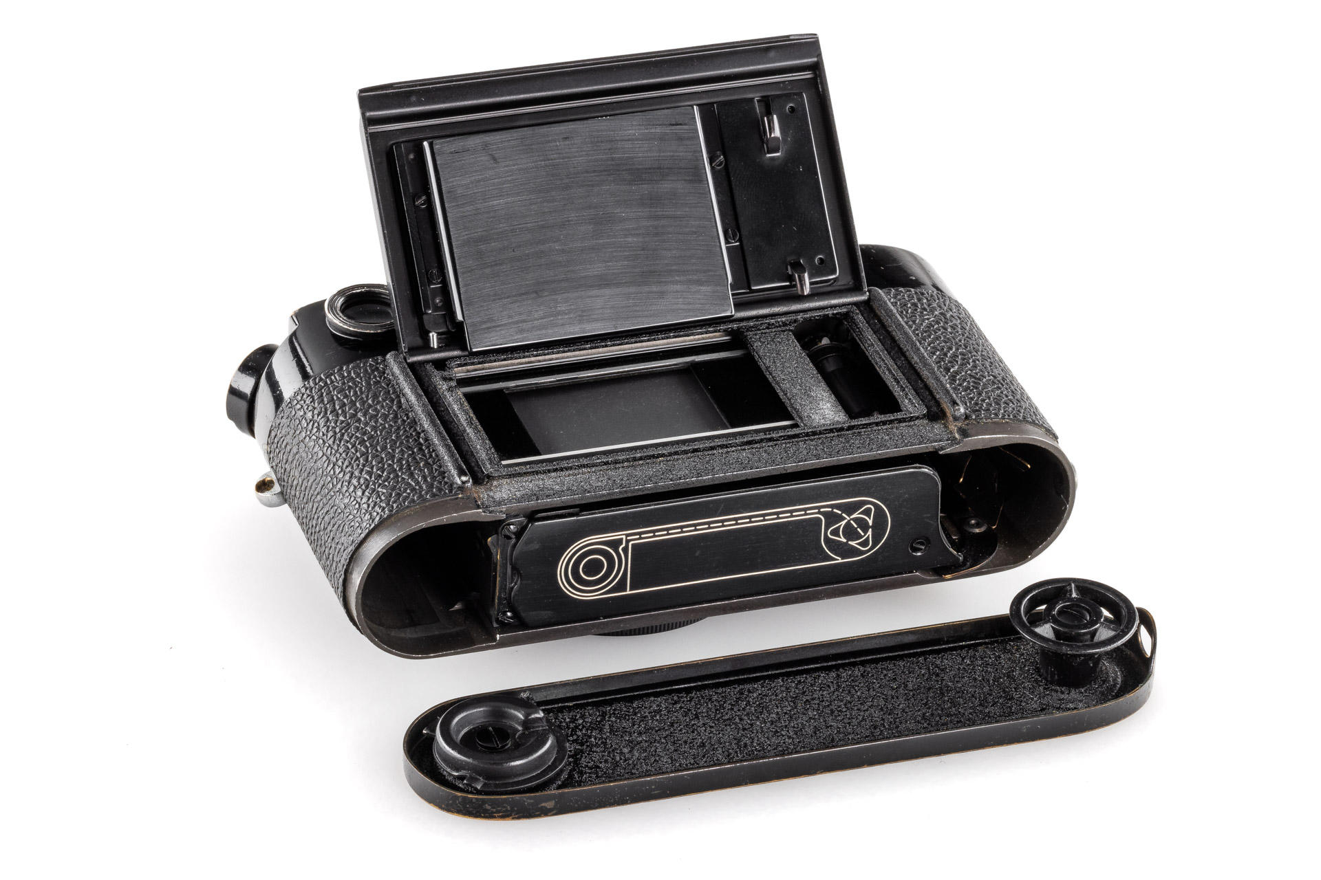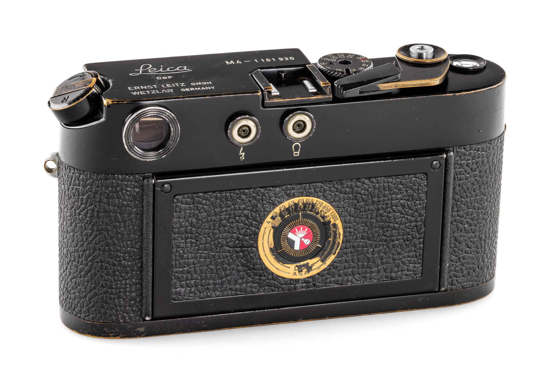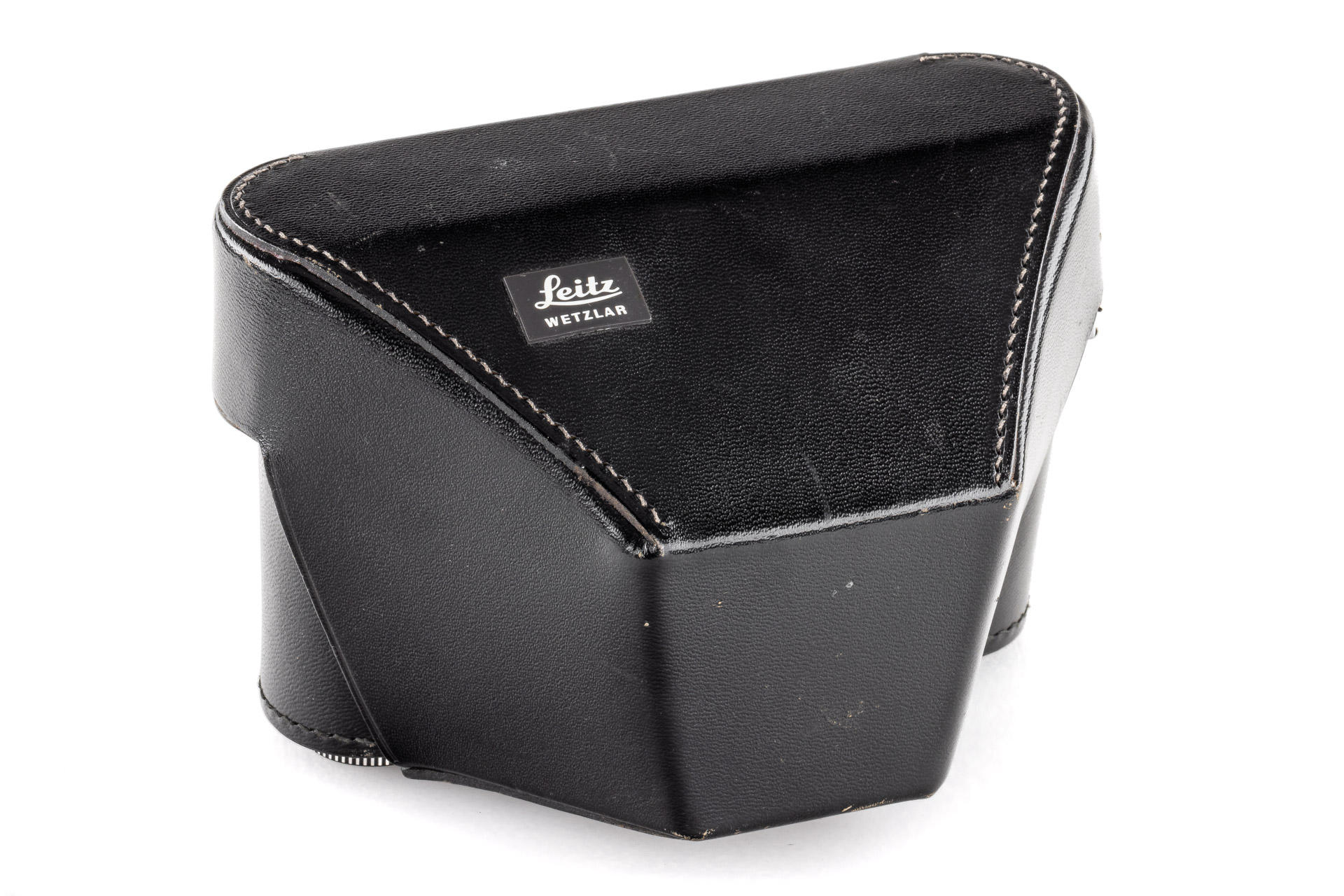 rare black paint M4 from the first production batch, in very good cosmetic condition, only slight brassing around the edges, top plate replaced by Leitz around 1970, correct brass rewind knob and levers on the front, in perfect working order, including a black ever ready case