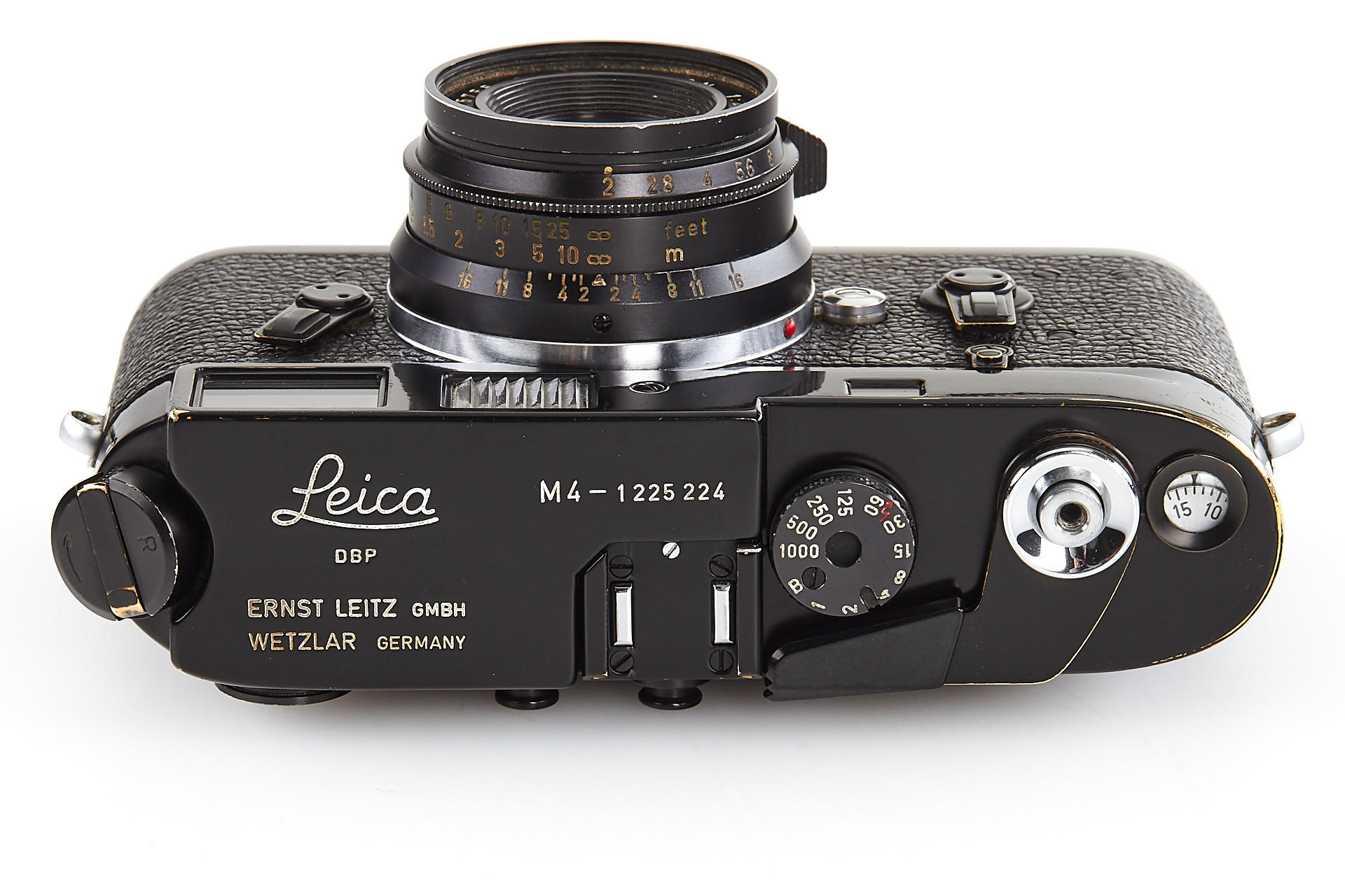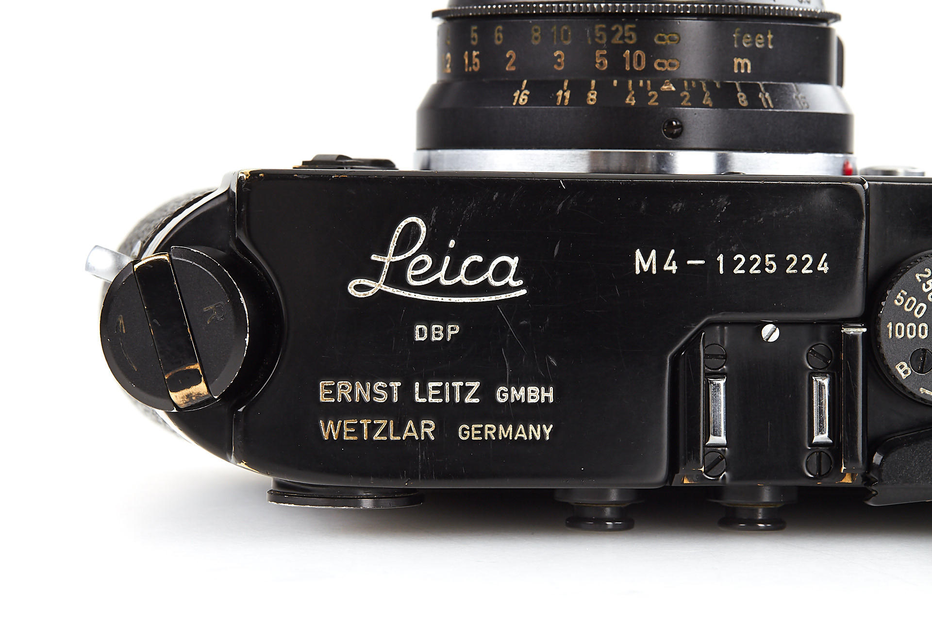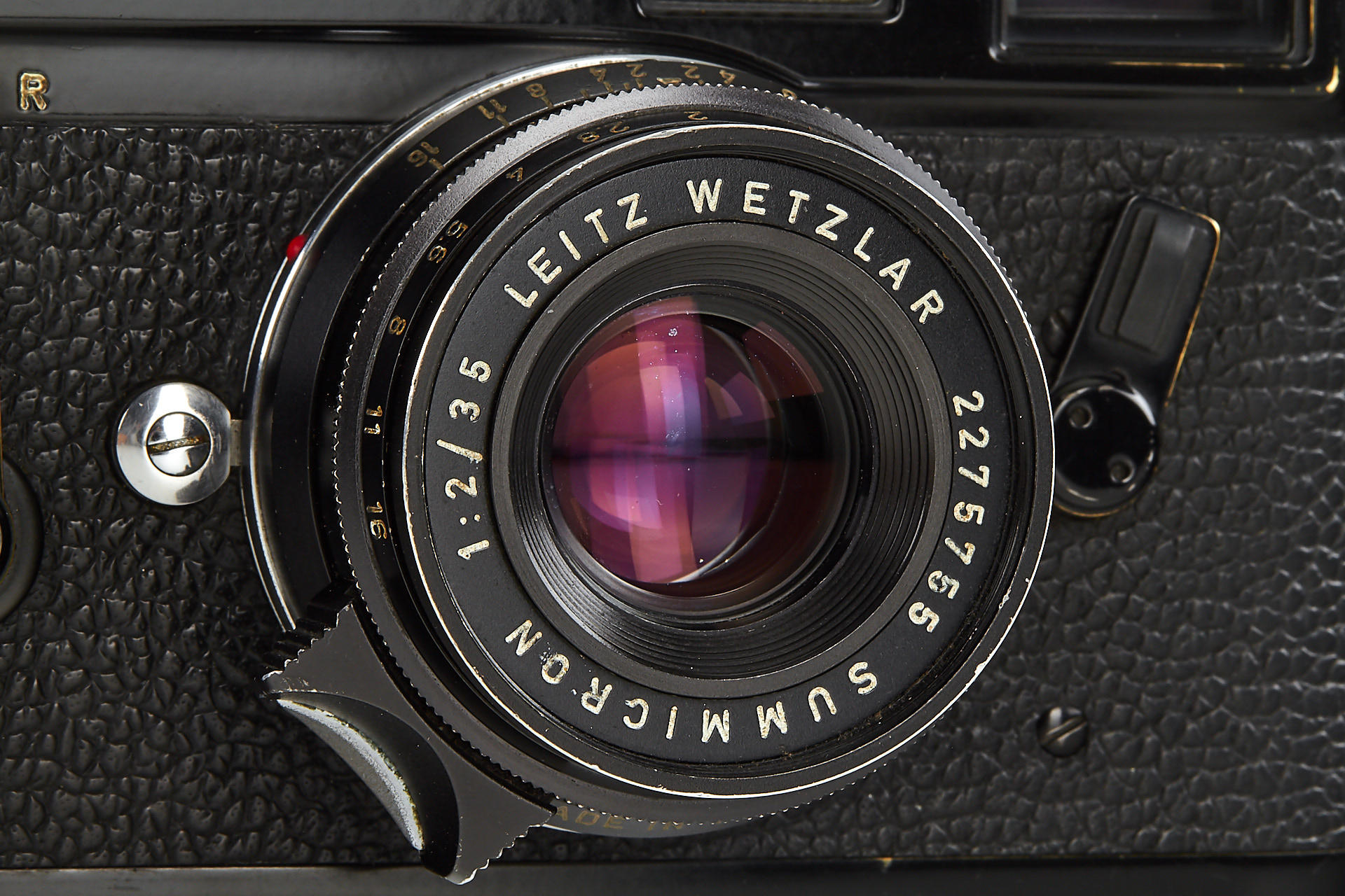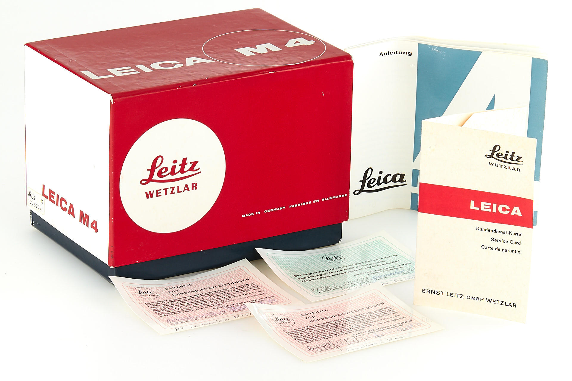 original black paint M4 in good condition (slight patina on the edges) and in working order, with rare black chrome 8-element Summicron 2/35mm no.2275755 (very good optics, with only a few hairline marks, 12585H hood, front cap), maker's box with matching camera number, M4 instructions, warranty card with matching lens and camera numbers