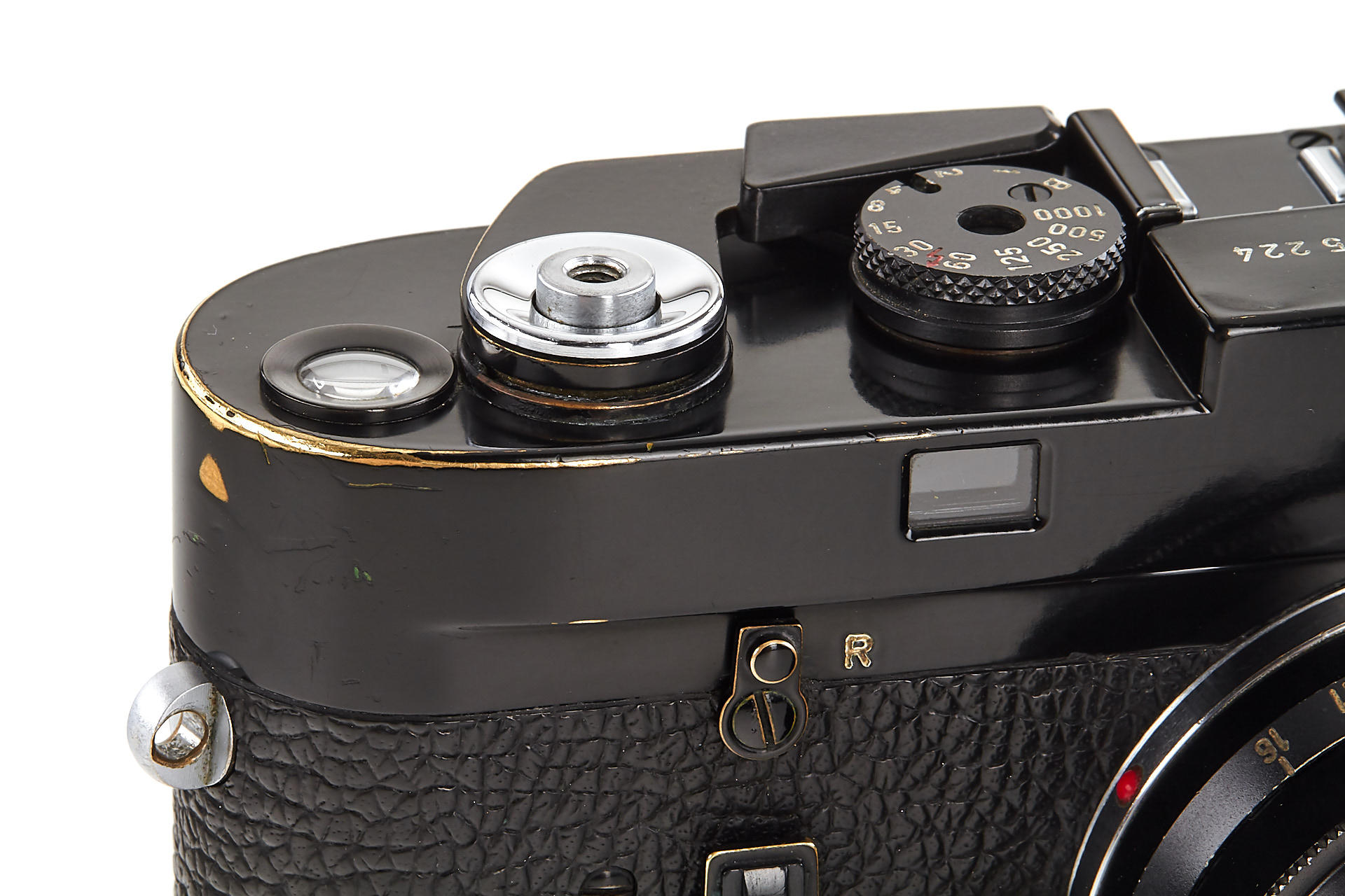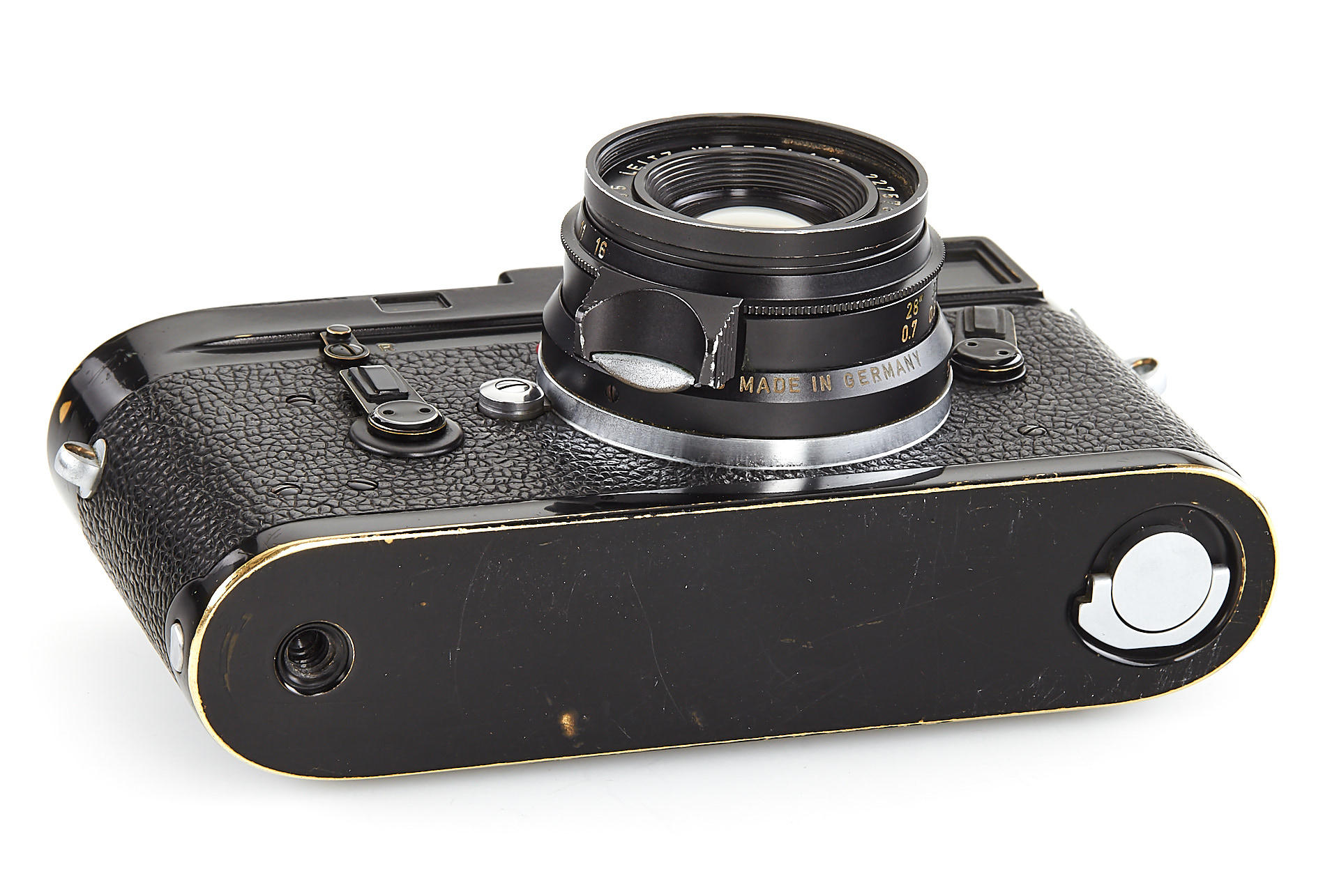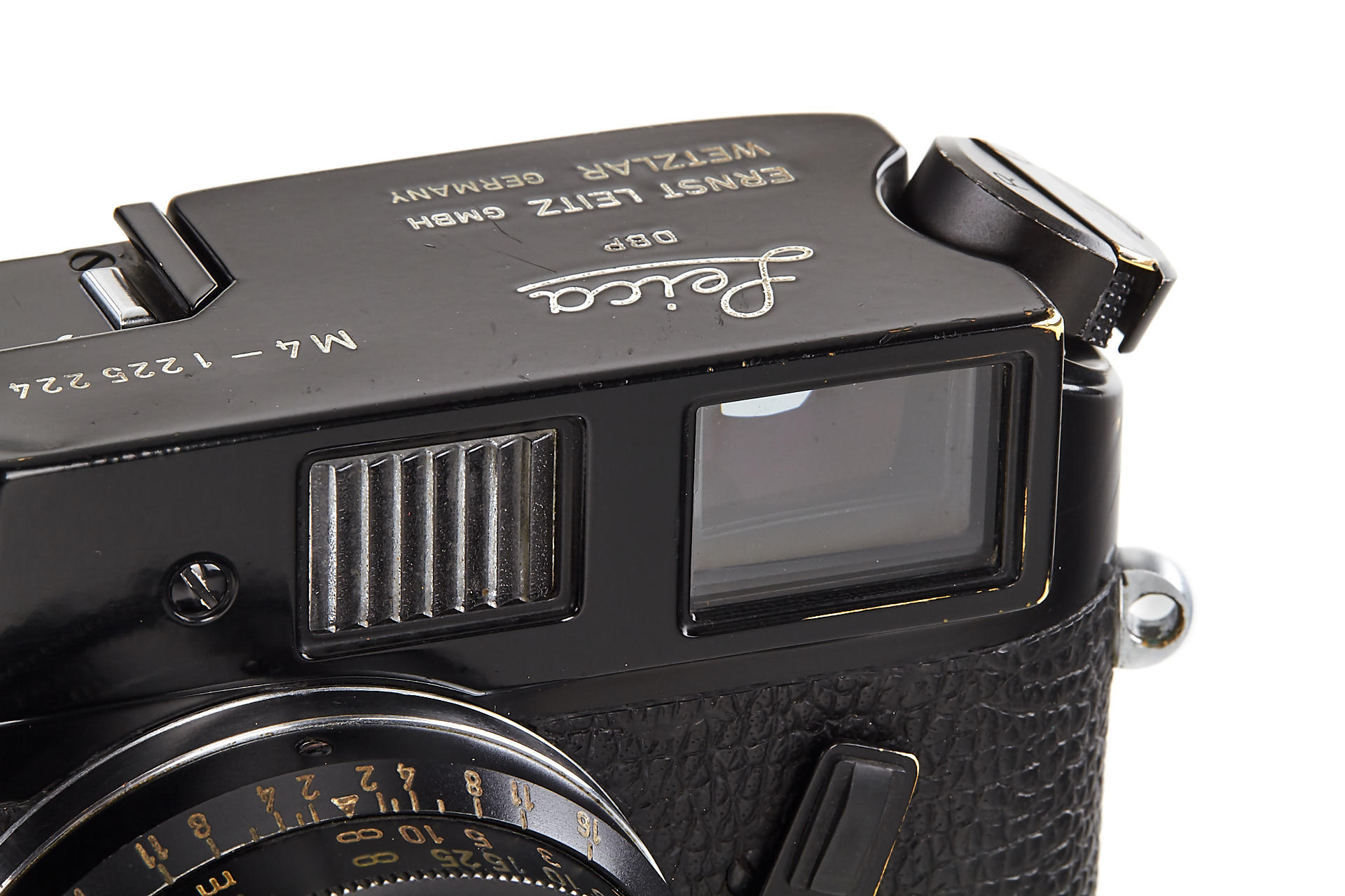 original black paint M4 in good condition (slight patina on the edges) and in working order, with rare black chrome 8-element Summicron 2/35mm no.2275755 (very good optics, with only a few hairline marks, 12585H hood, front cap), maker's box with matching camera number, M4 instructions, warranty card with matching lens and camera numbers