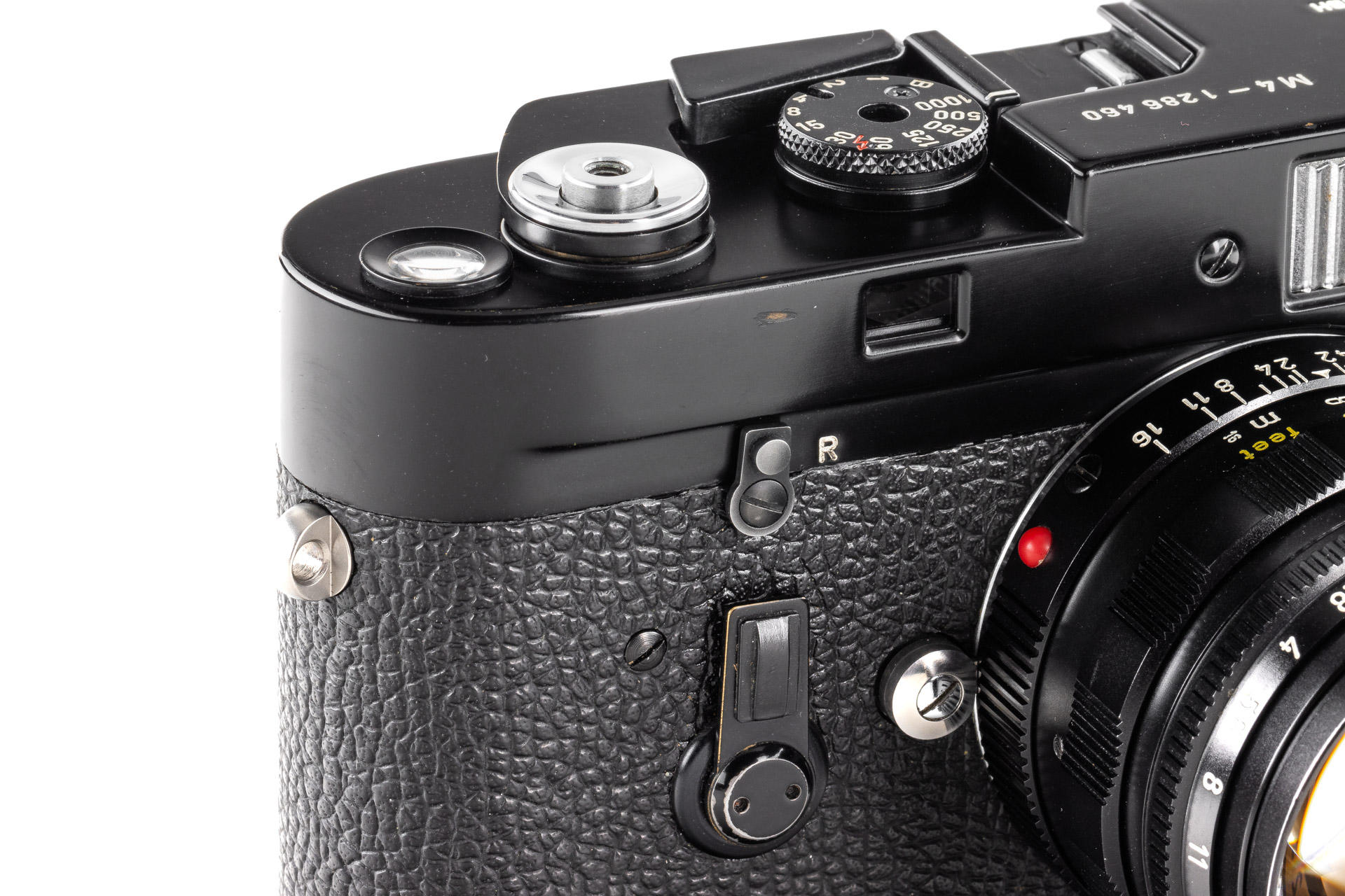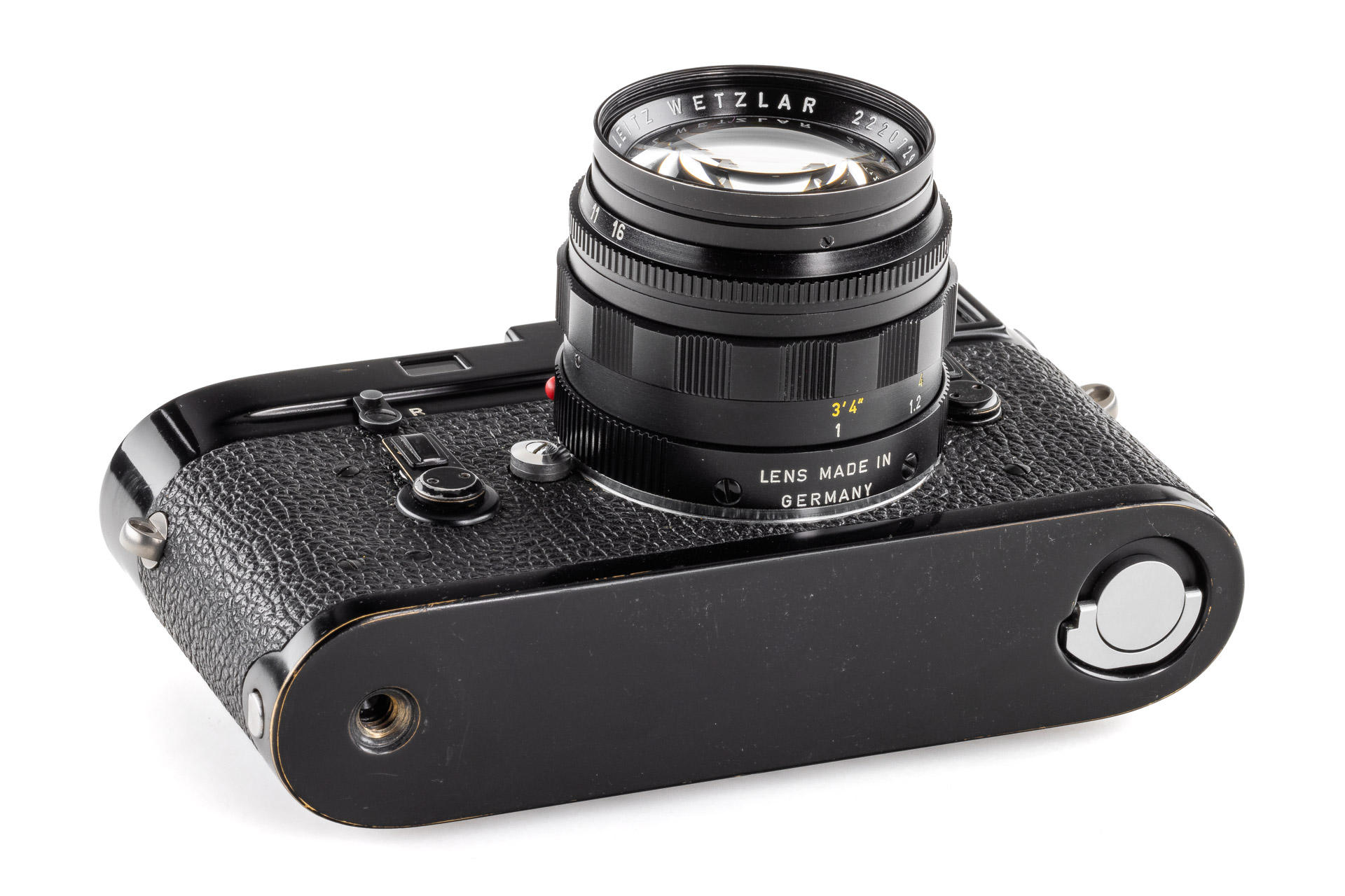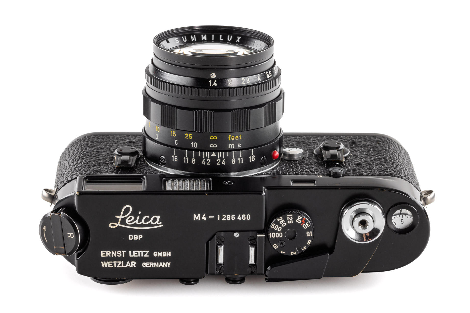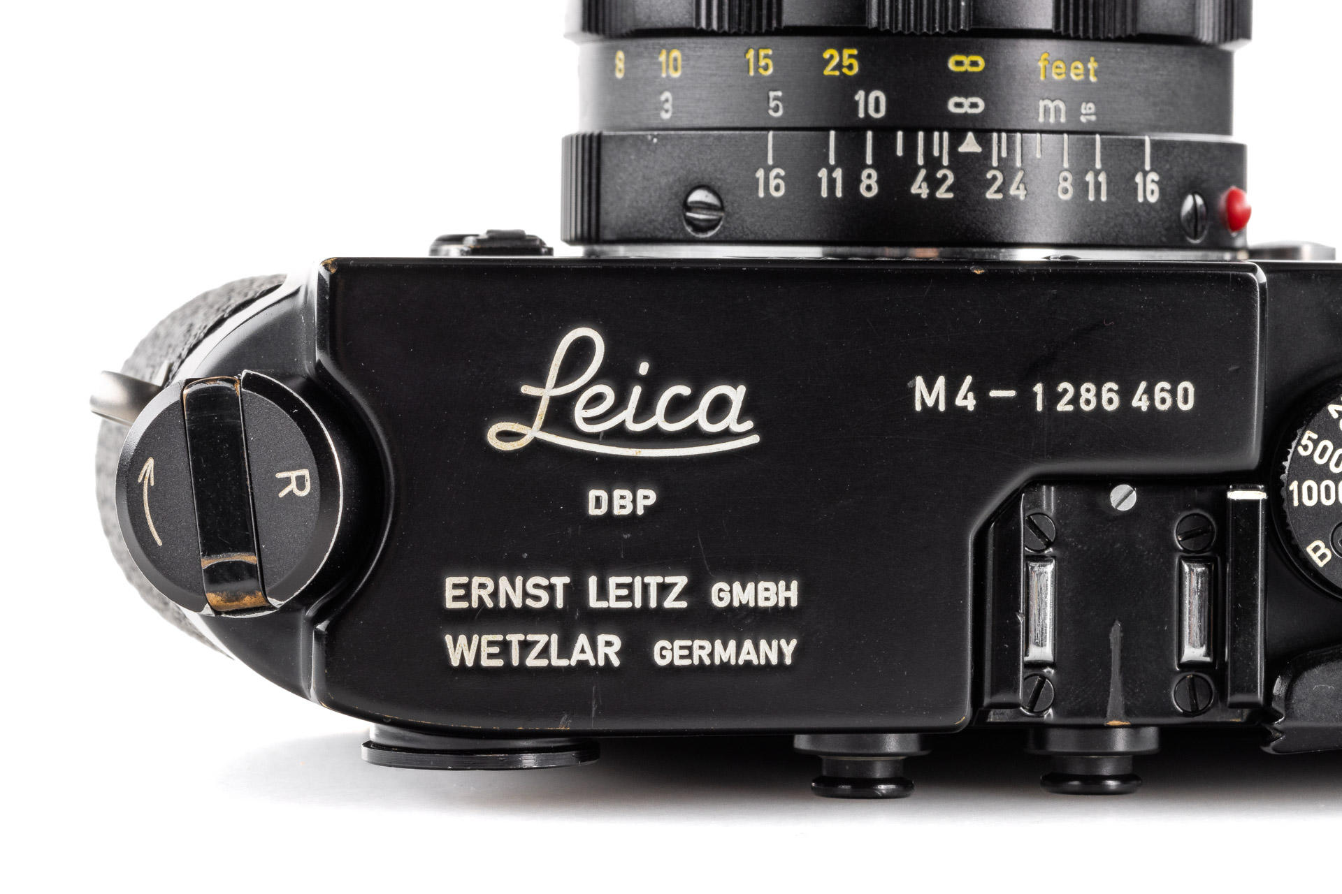 a beautiful, last batch Leica M4 black paint, with only minimal signs of use around the edges and in perfect working order, paired with very rare transitional version of the black Summilux 1.4/50mm no.2220729 (black chrome finish with barrel style similar to the Noctilux 1.2, black painted screws, excellent optics), with 12521 hood, cap, maker's box with matching serial number