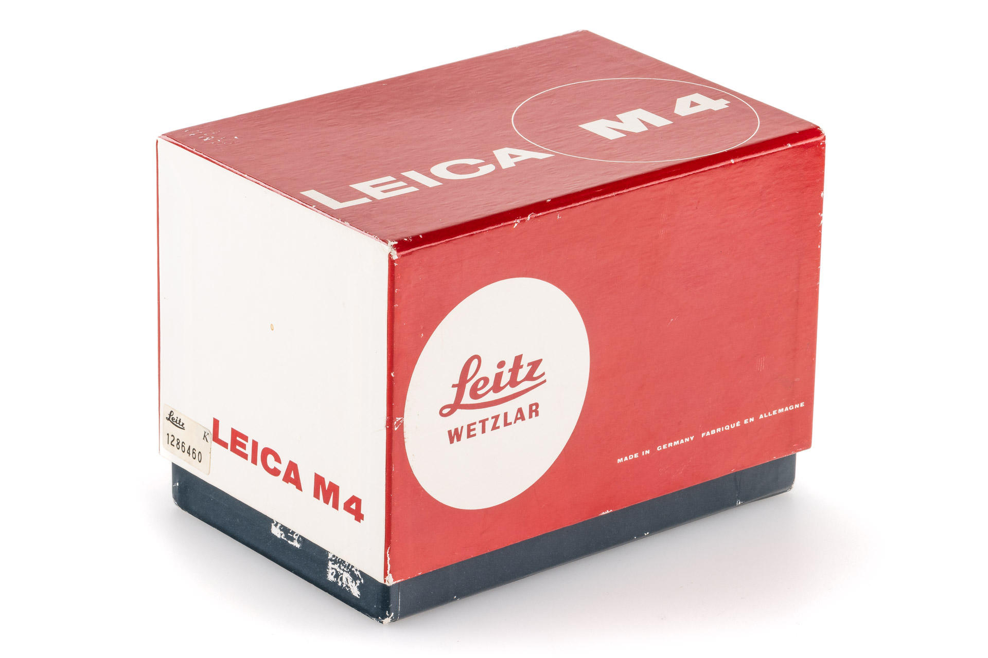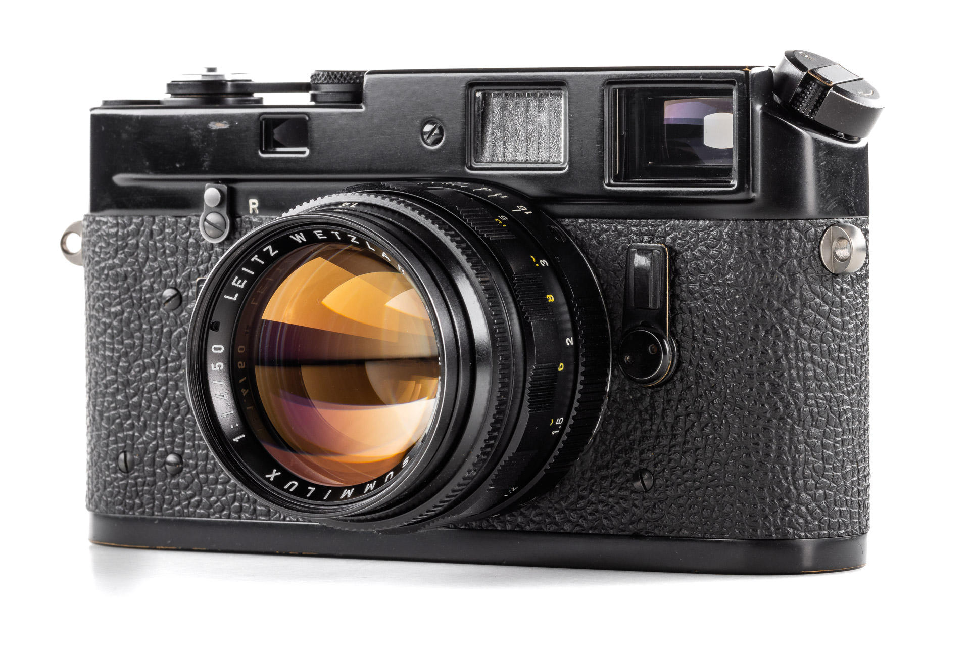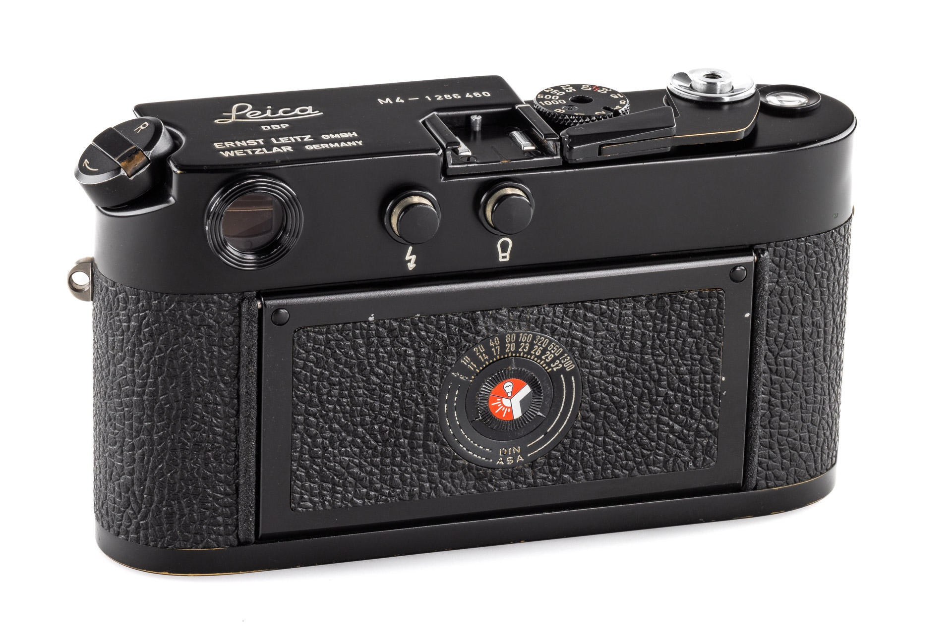 a beautiful, last batch Leica M4 black paint, with only minimal signs of use around the edges and in perfect working order, paired with very rare transitional version of the black Summilux 1.4/50mm no.2220729 (black chrome finish with barrel style similar to the Noctilux 1.2, black painted screws, excellent optics), with 12521 hood, cap, maker's box with matching serial number