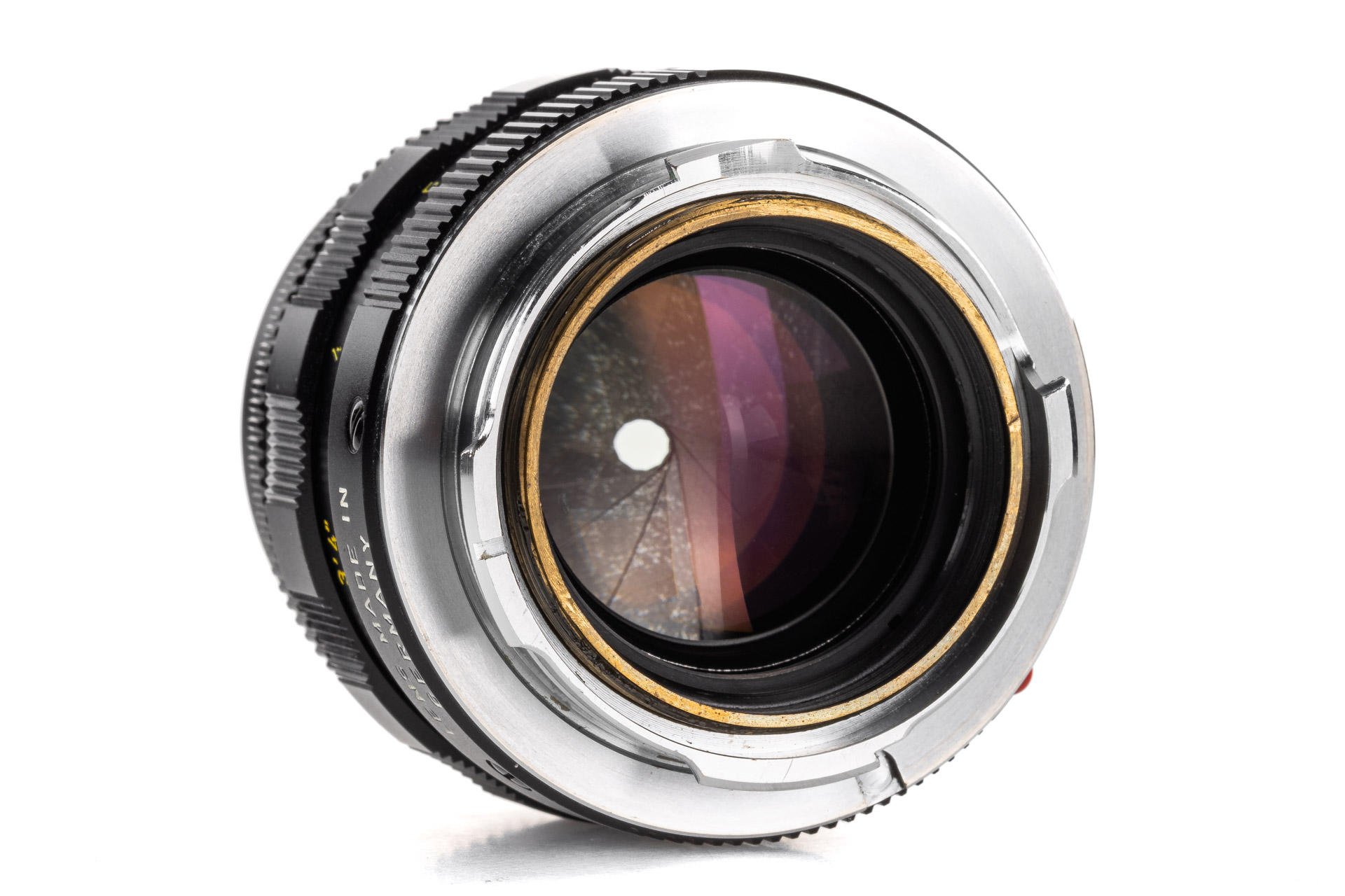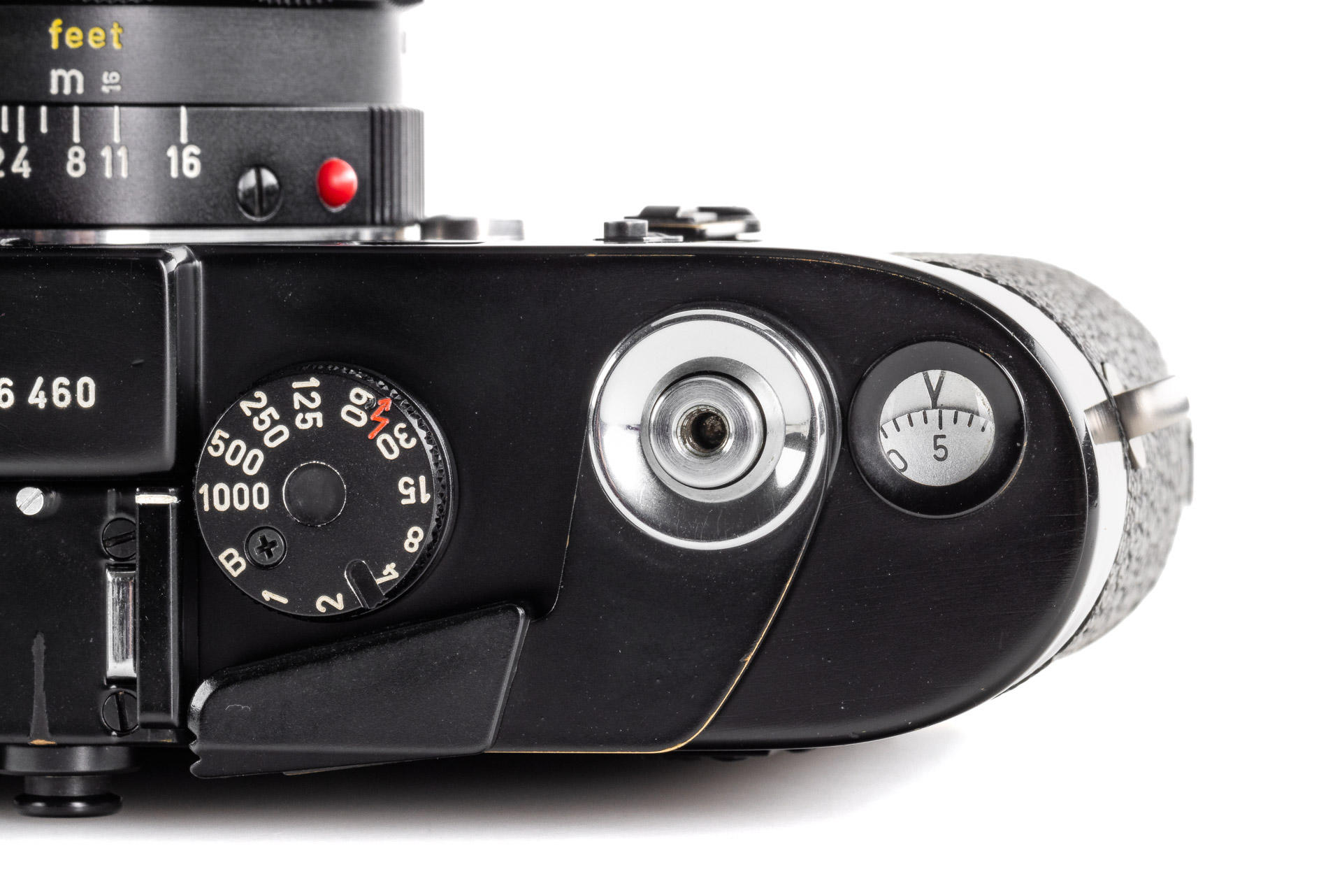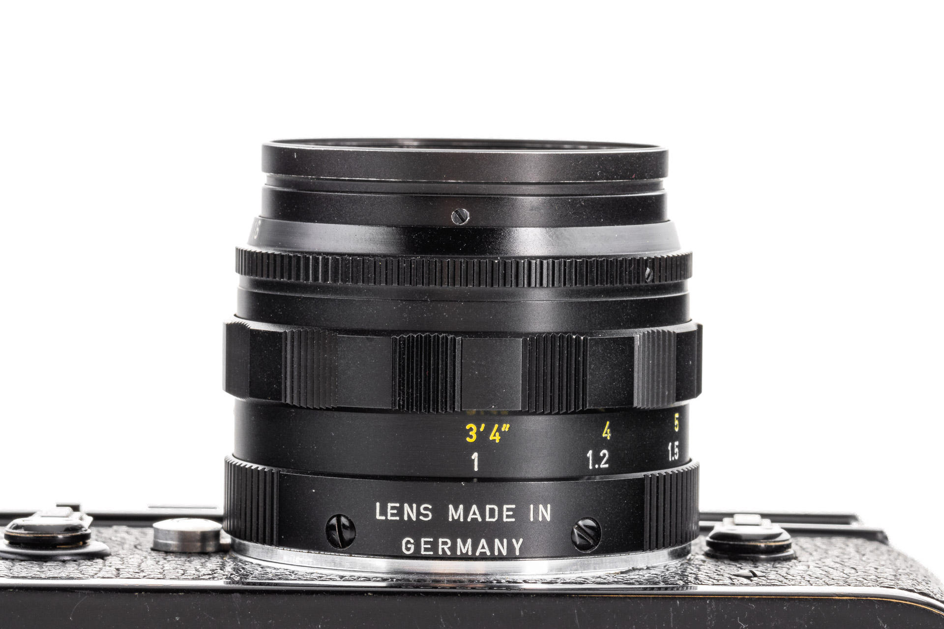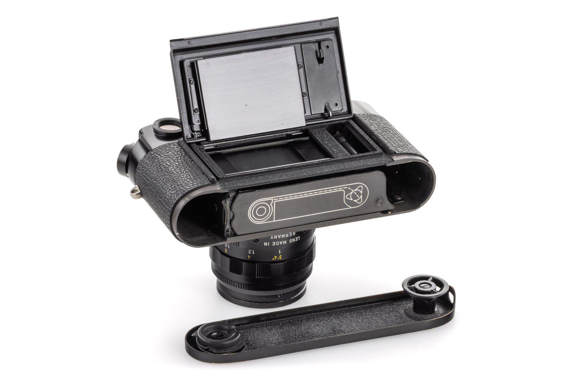 a beautiful, last batch Leica M4 black paint, with only minimal signs of use around the edges and in perfect working order, paired with very rare transitional version of the black Summilux 1.4/50mm no.2220729 (black chrome finish with barrel style similar to the Noctilux 1.2, black painted screws, excellent optics), with 12521 hood, cap, maker's box with matching serial number