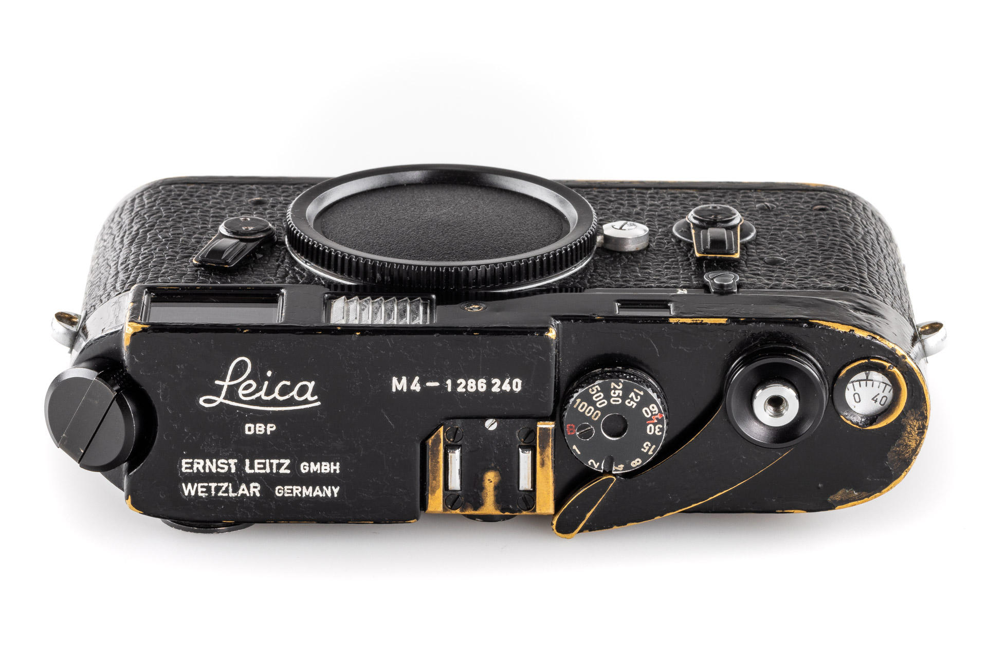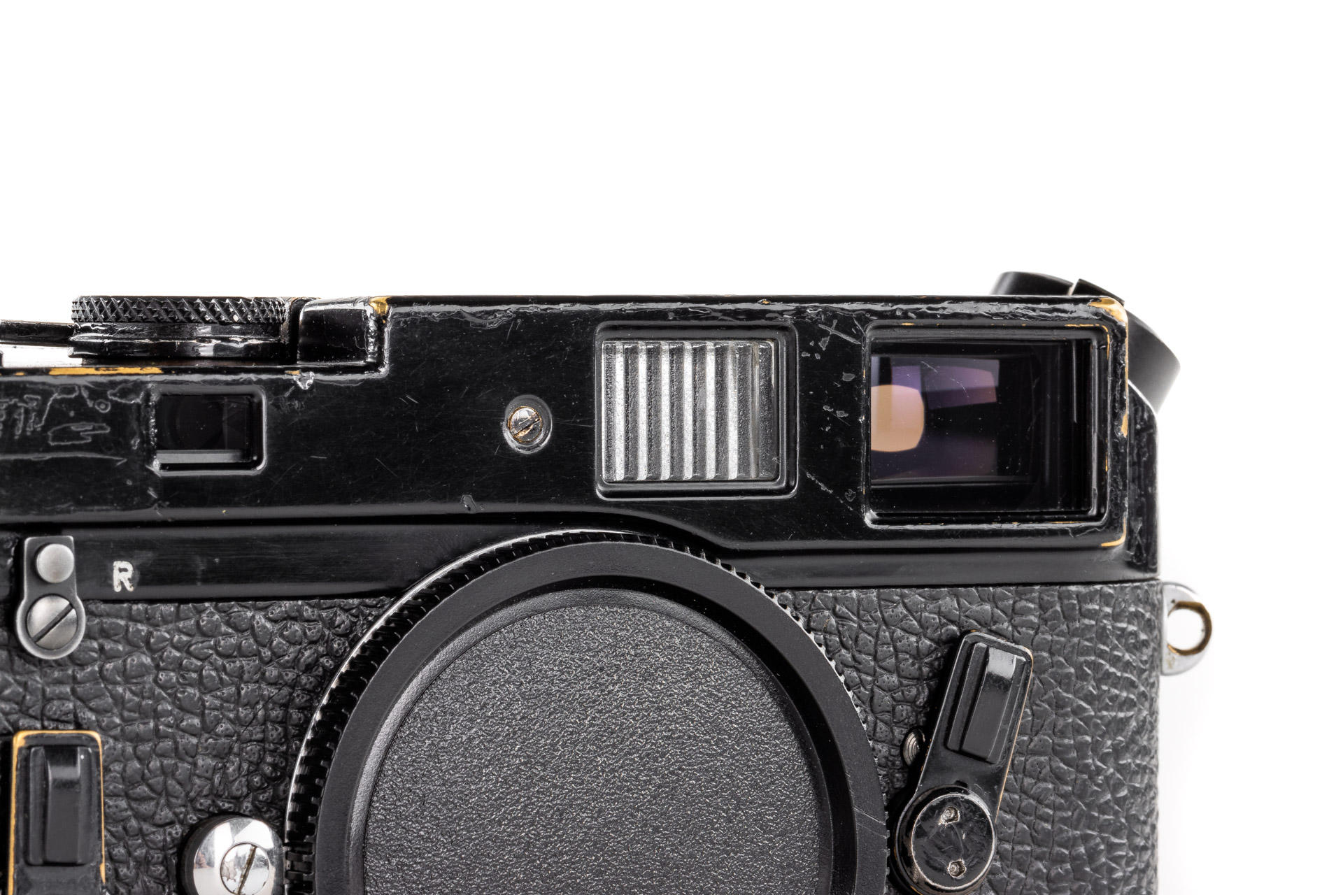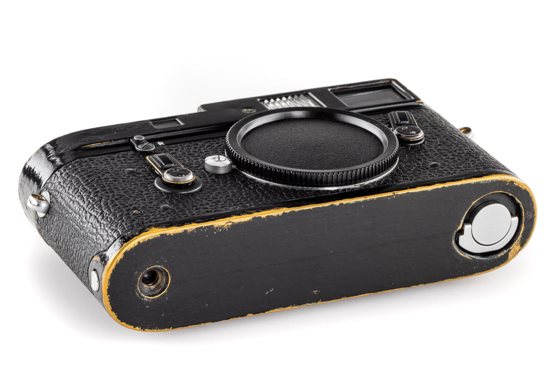 user black paint M4 in good working order, rangefinder patch showing some stain, but is still usable, some areas have been repainted such as the edges and the bottom plate, winding lever from an earlier black paint model, with body cap