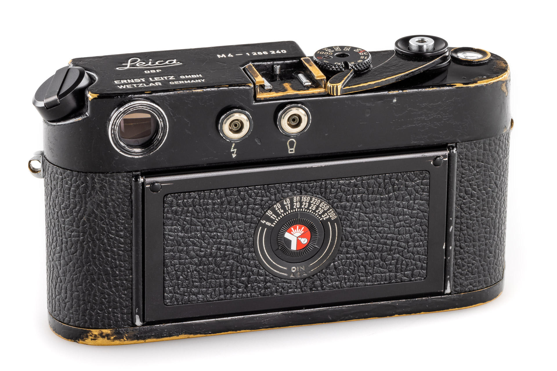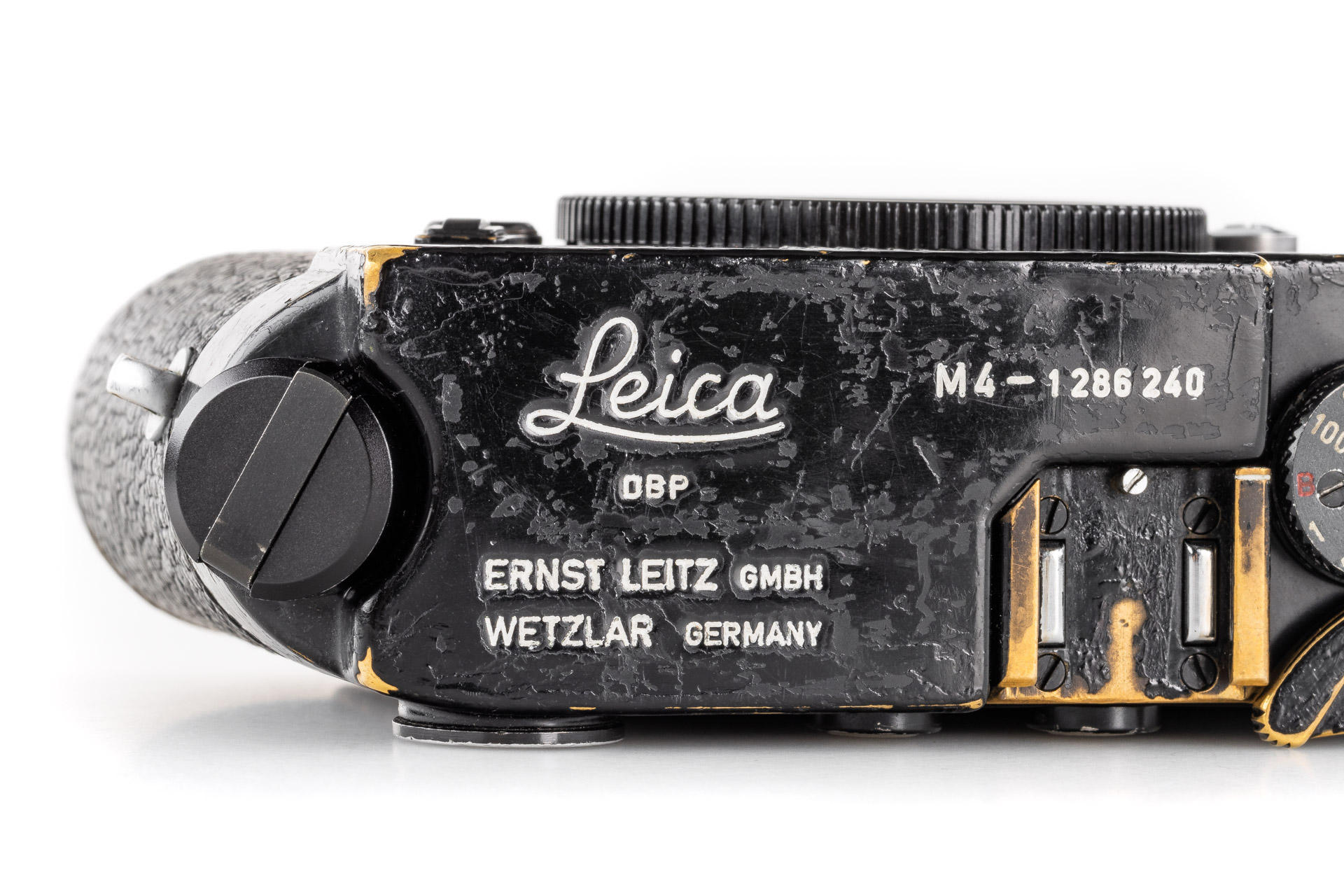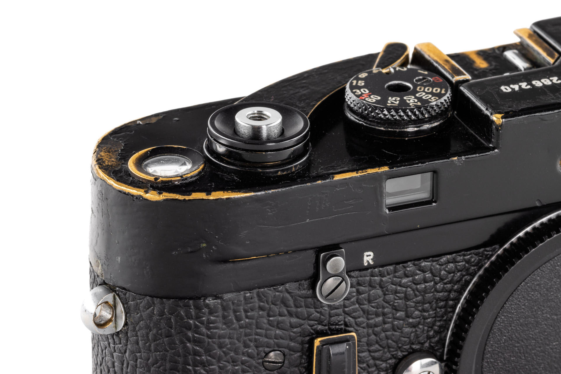 user black paint M4 in good working order, rangefinder patch showing some stain, but is still usable, some areas have been repainted such as the edges and the bottom plate, winding lever from an earlier black paint model, with body cap