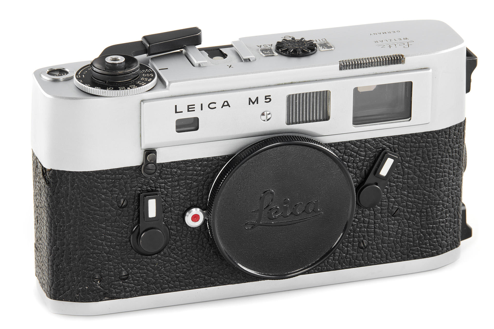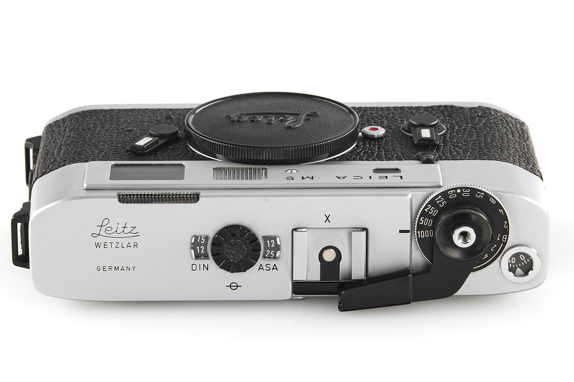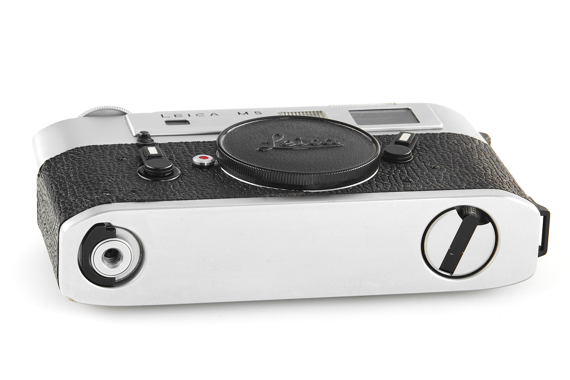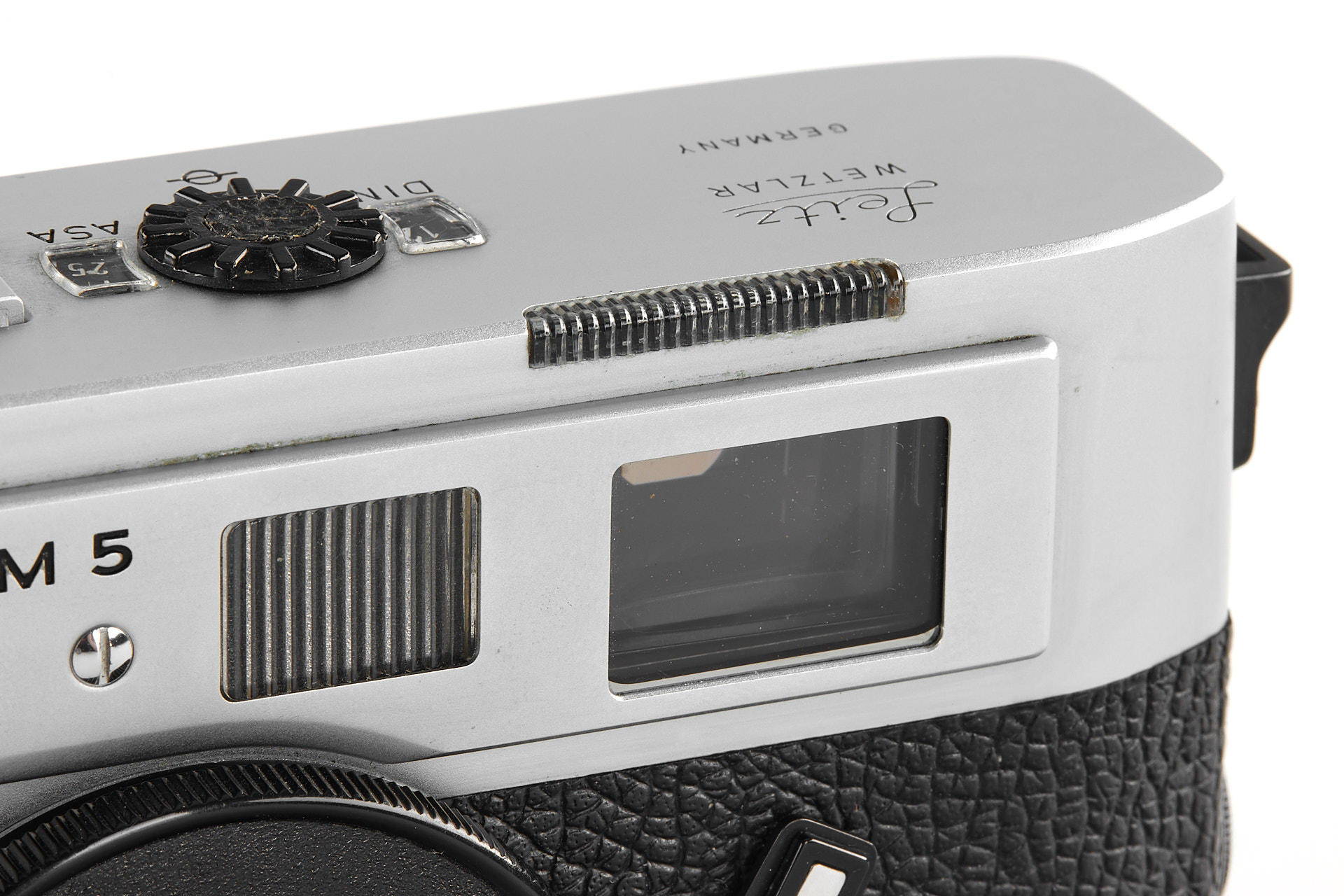 Very interesting Leica M5 chrome 2 lugs without serial number, in near mint condition (some vulcanite areas repaired and light dent on the bottom plate), unusual black anodized rewind, frame selector and self-timer levers