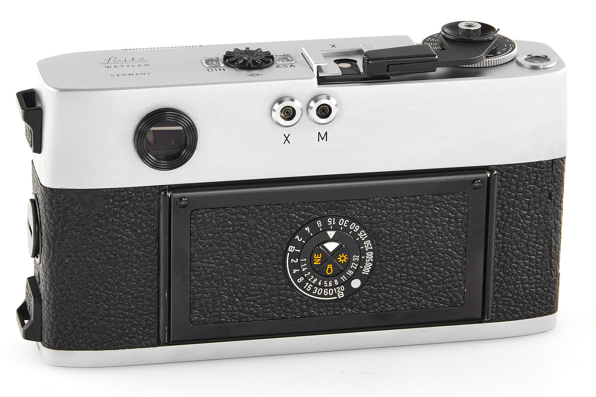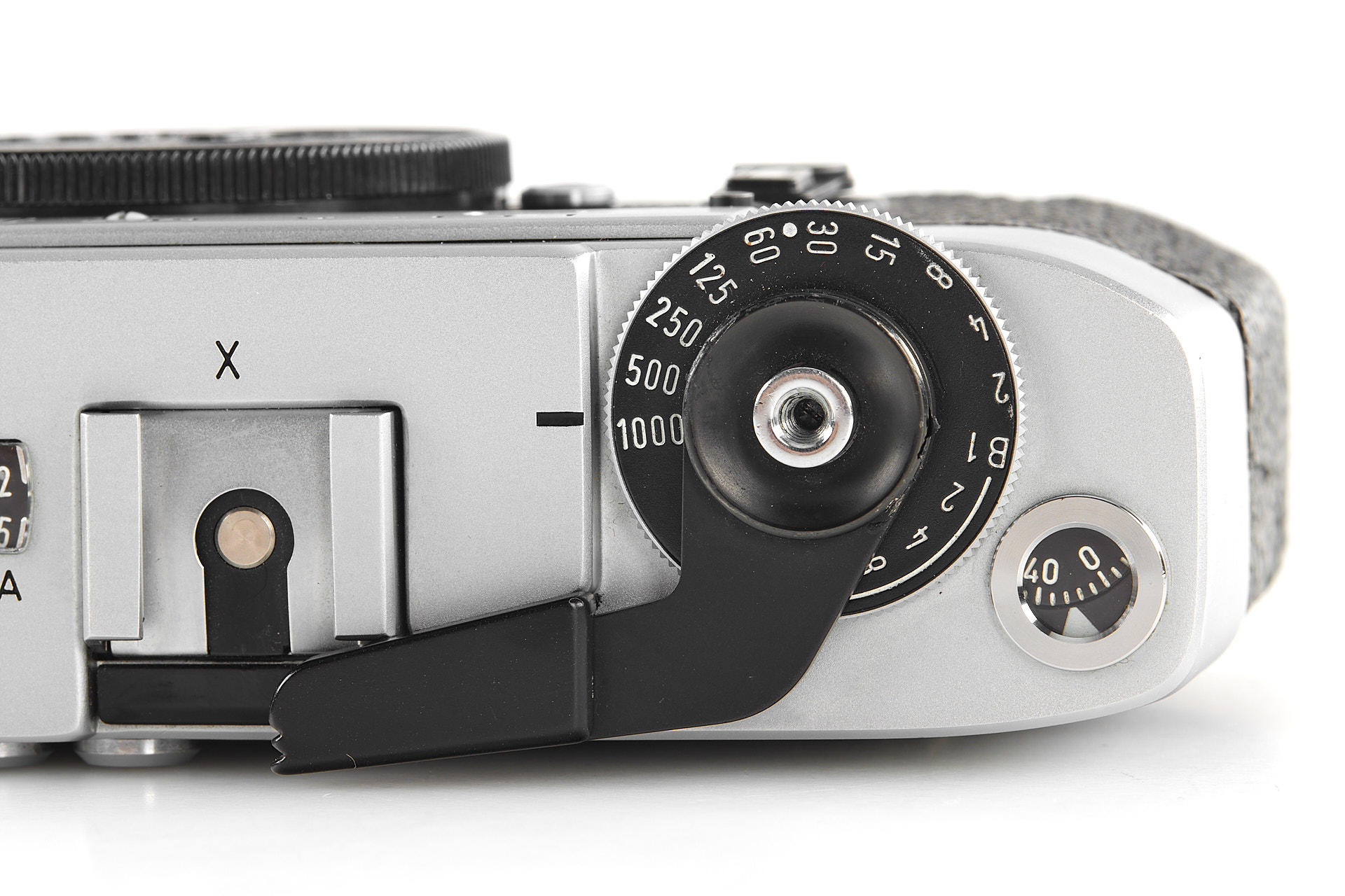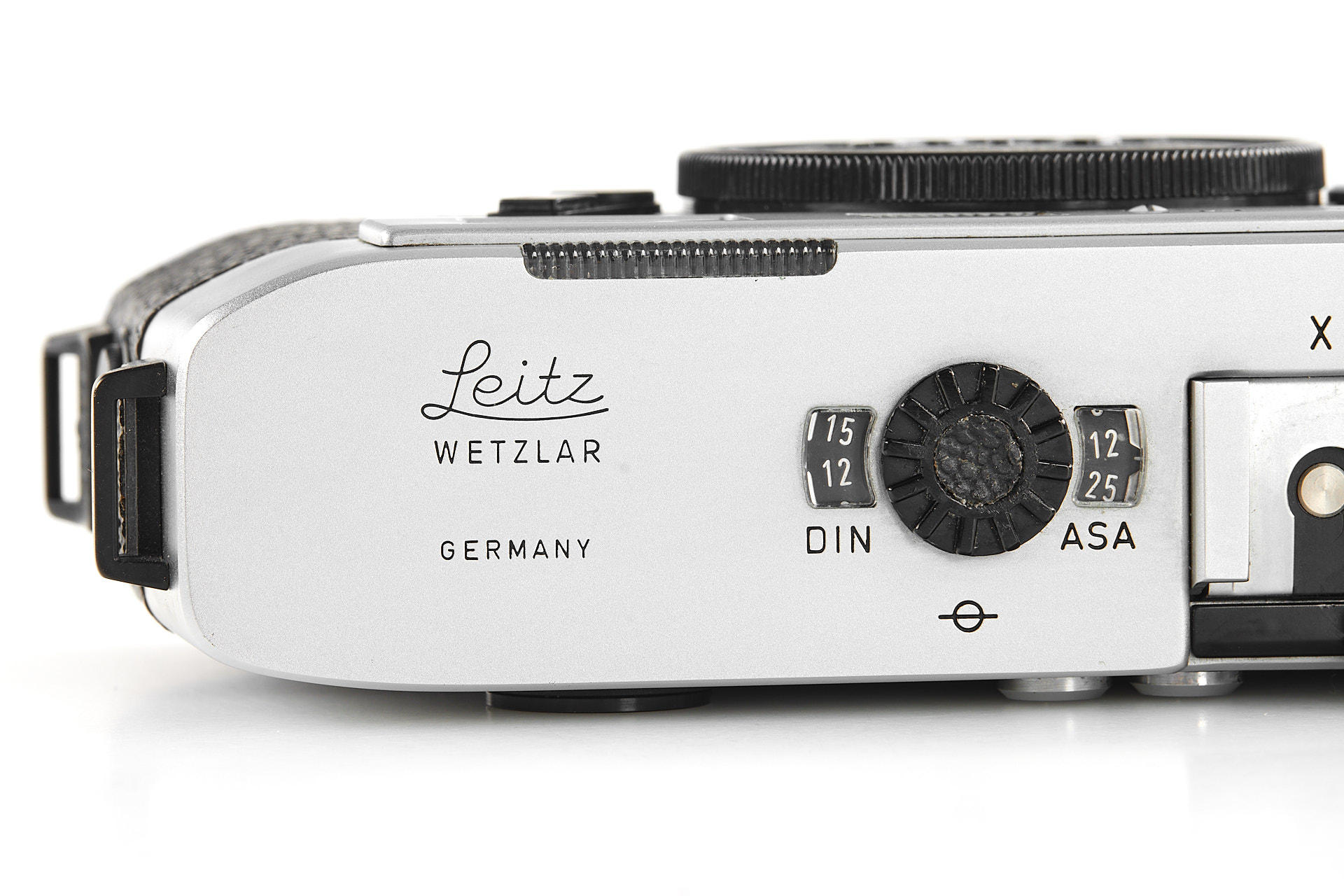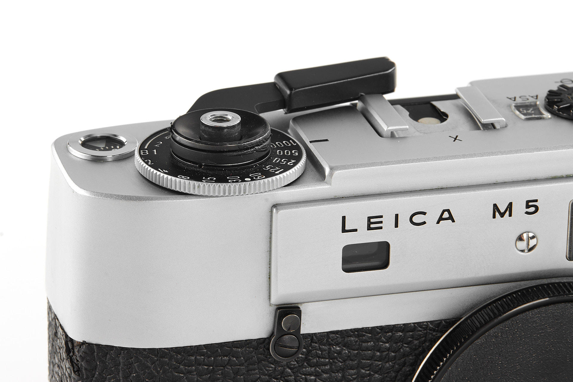 Very interesting Leica M5 chrome 2 lugs without serial number, in near mint condition (some vulcanite areas repaired and light dent on the bottom plate), unusual black anodized rewind, frame selector and self-timer levers