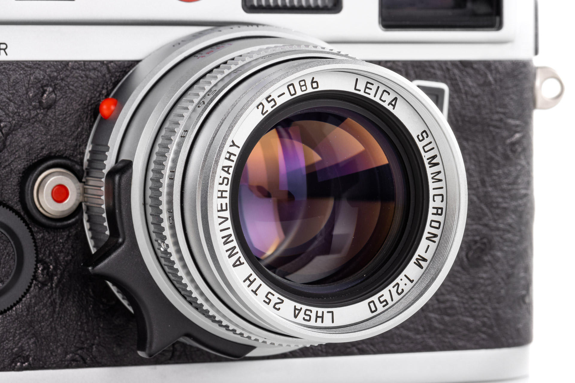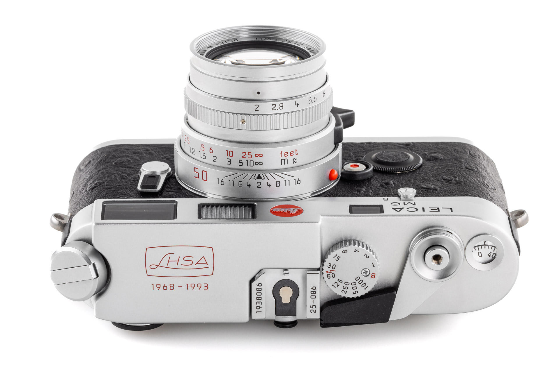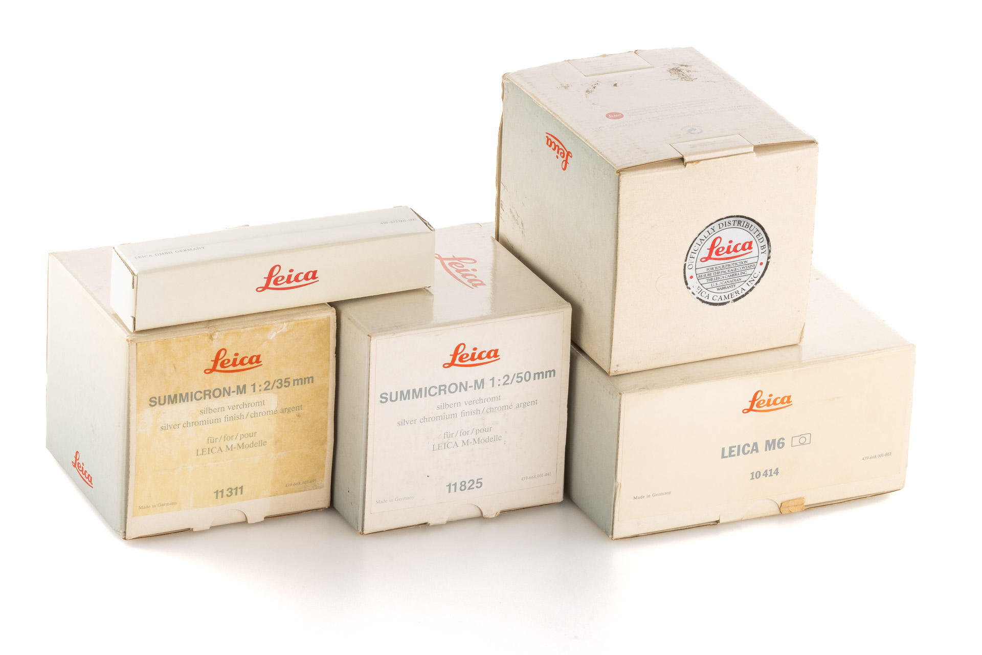 rare Leica M6 outfit, issued in 1996 to commemorate 25 years of the Leica Historical Society of America, in mint, unused condition, with body no.1938086 and a set of three matching lenses: Summicron-M 2/50mm, Summicron-M 2/35mm, Summicron-M 2/90mm, everything with matching boxes and papers, including wooden presentation box, only 151 of these special sets were made