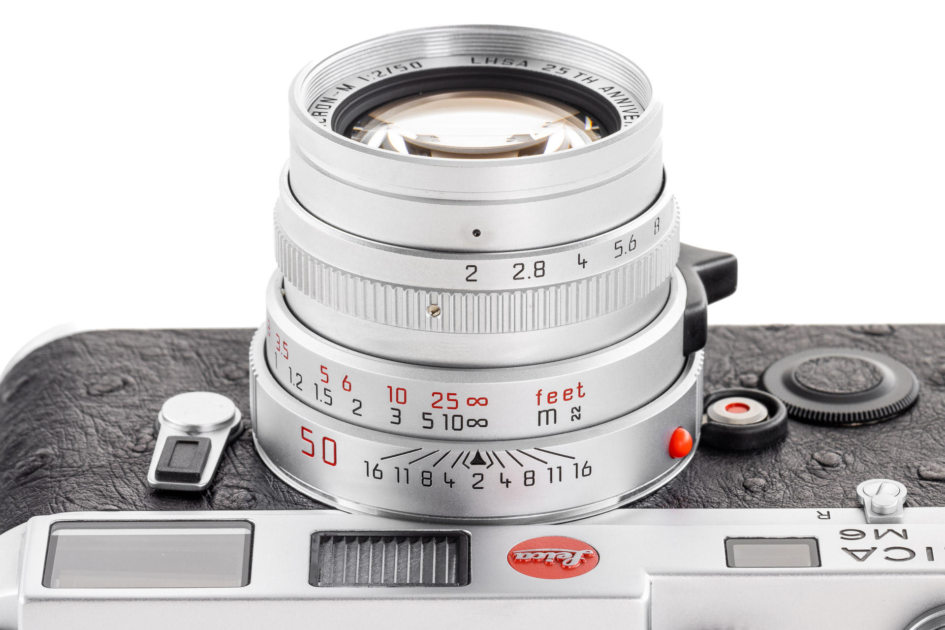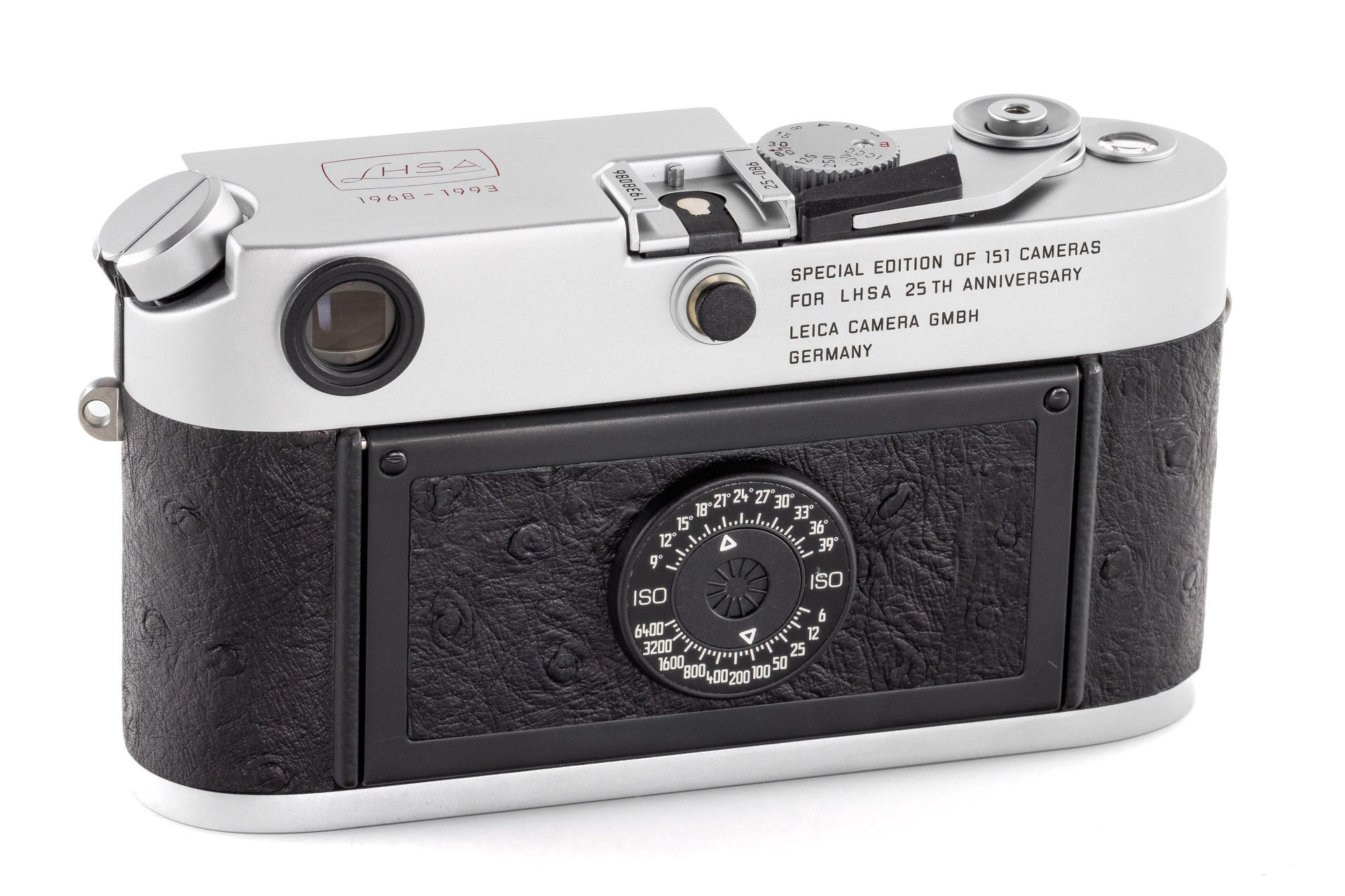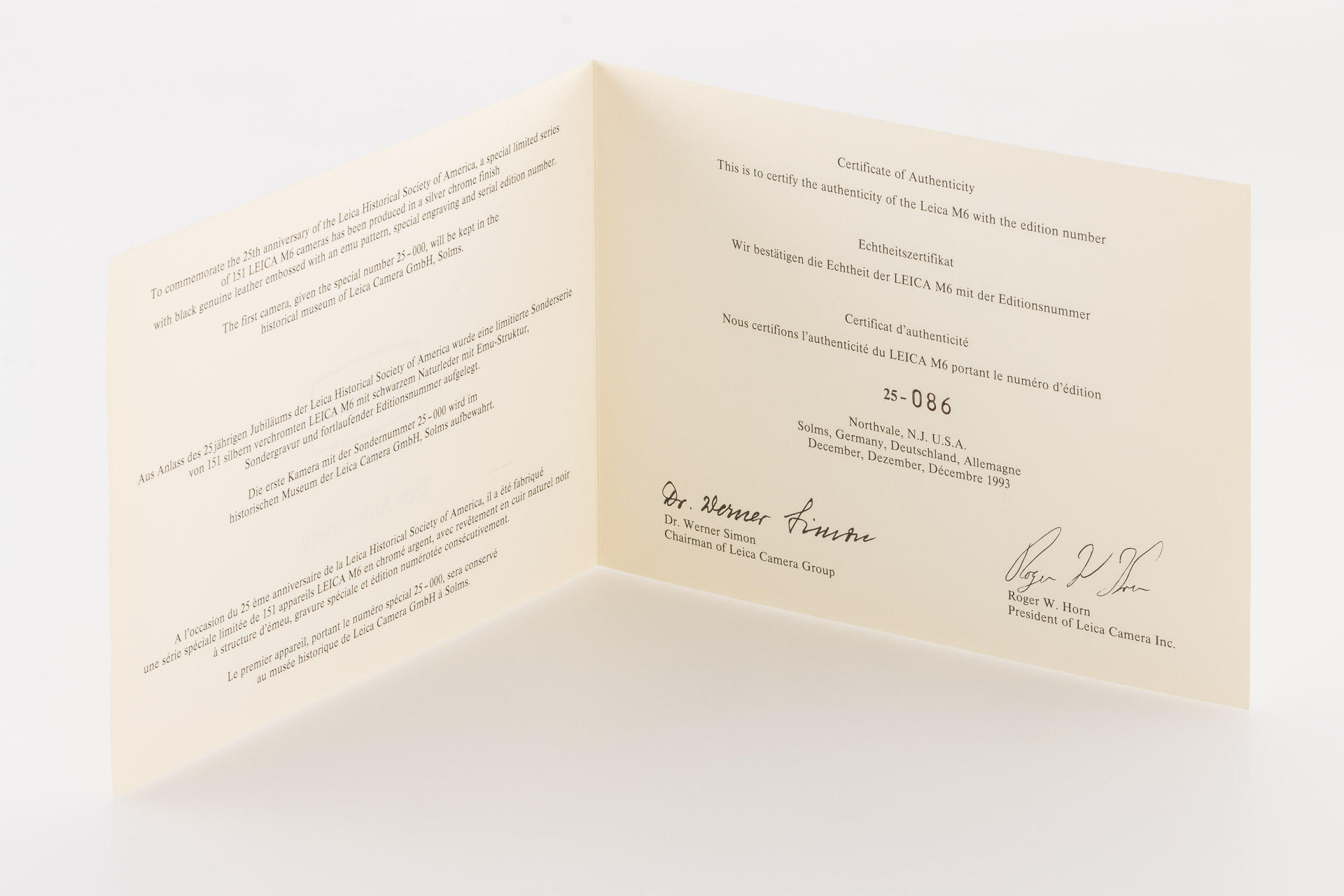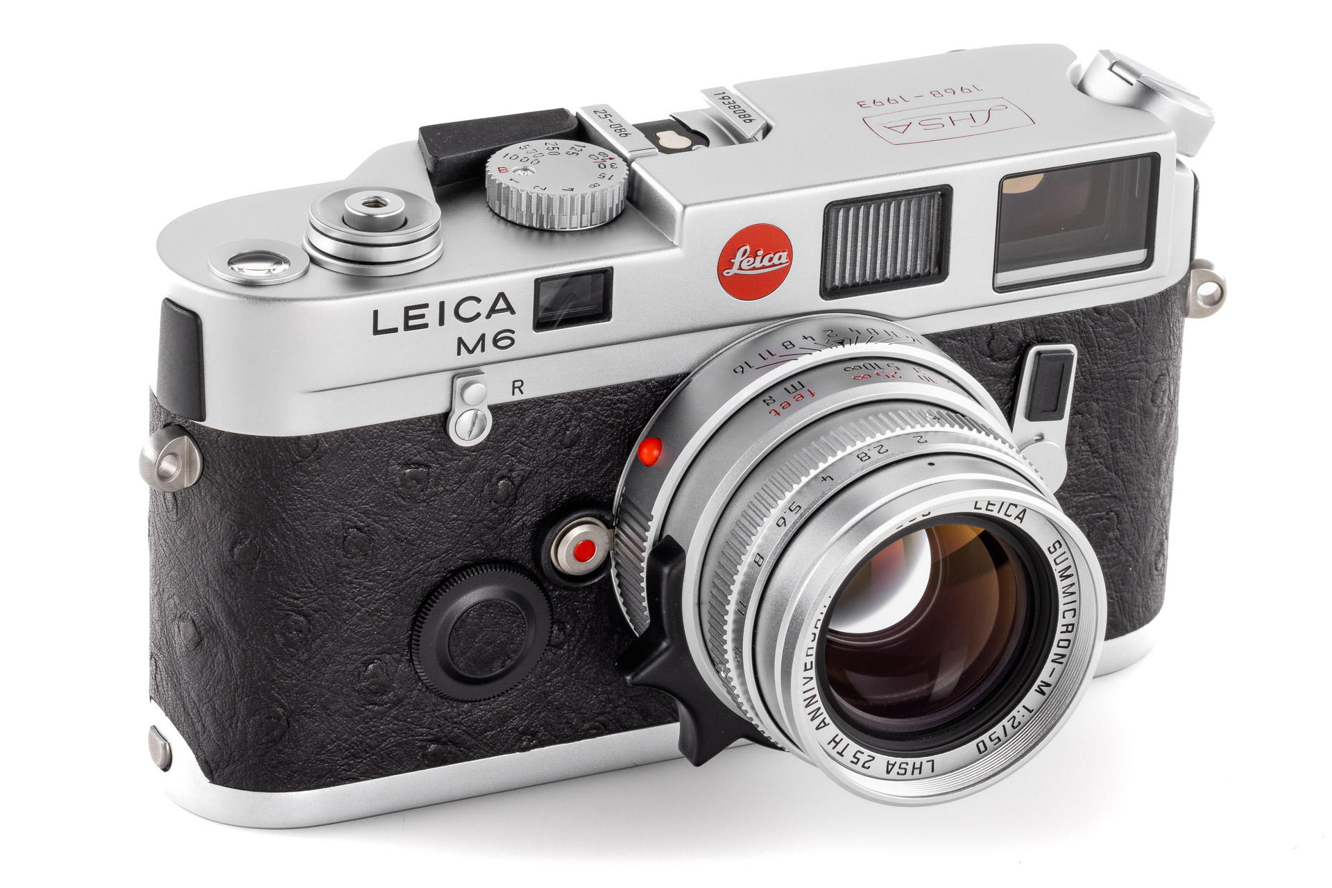 rare Leica M6 outfit, issued in 1996 to commemorate 25 years of the Leica Historical Society of America, in mint, unused condition, with body no.1938086 and a set of three matching lenses: Summicron-M 2/50mm, Summicron-M 2/35mm, Summicron-M 2/90mm, everything with matching boxes and papers, including wooden presentation box, only 151 of these special sets were made