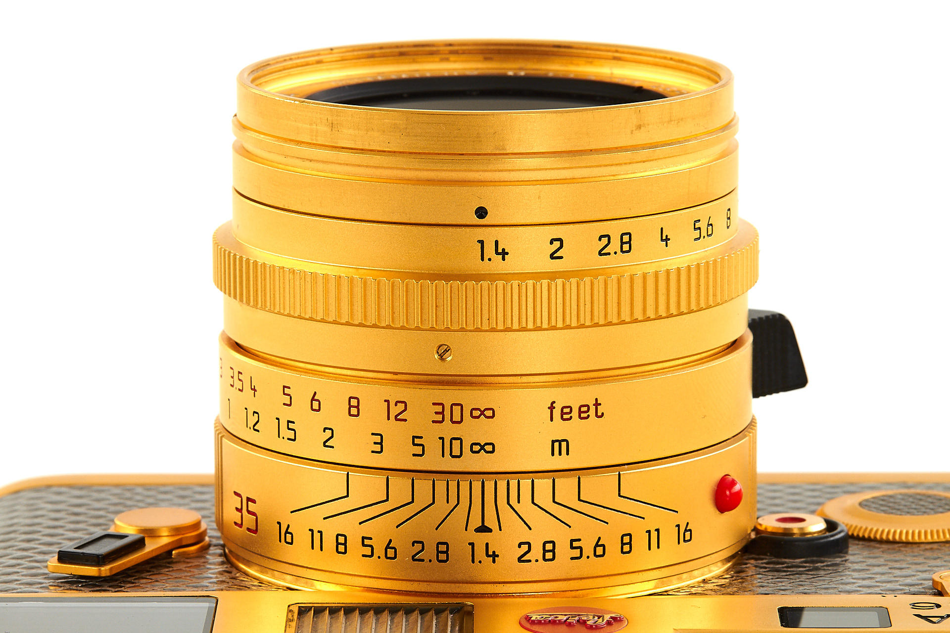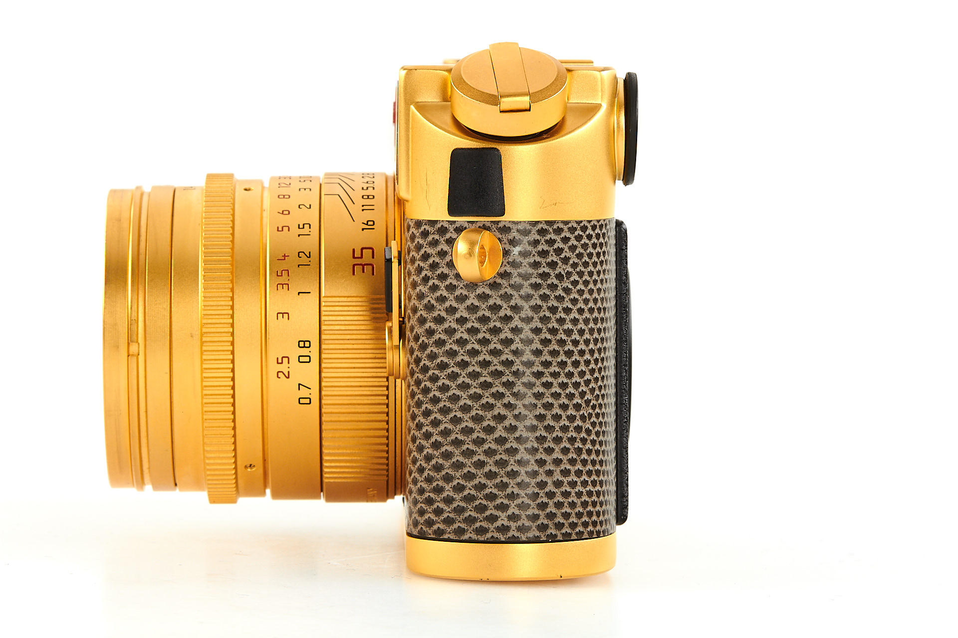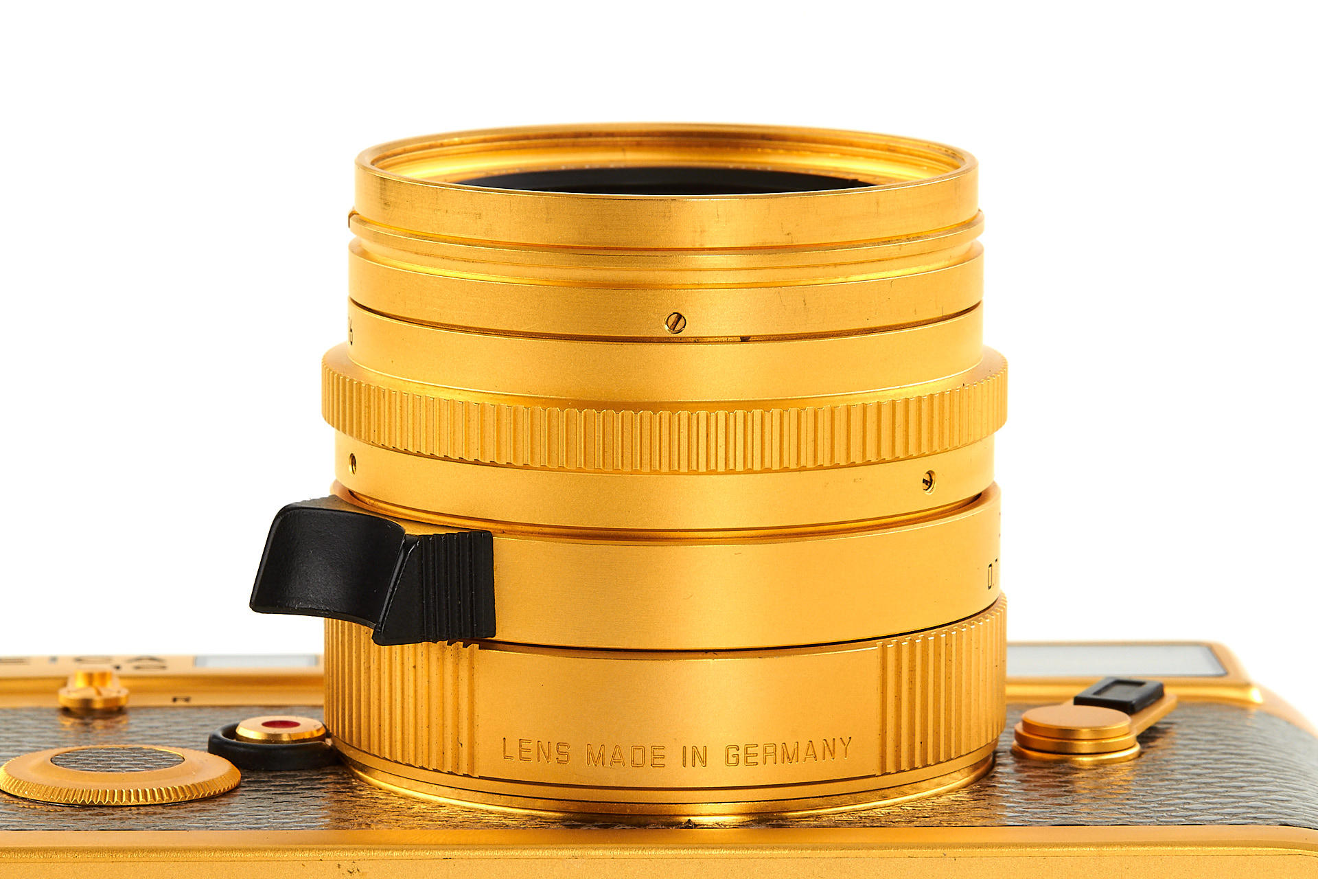 a prototype of the rare gold edition M6, the golden M6 has been produced in limited quantity for the Sultan of Brunei as gifts for his special guests, with matching Summilux-M 1.4/35mm ASPH. no.3751000, wooden presentation box