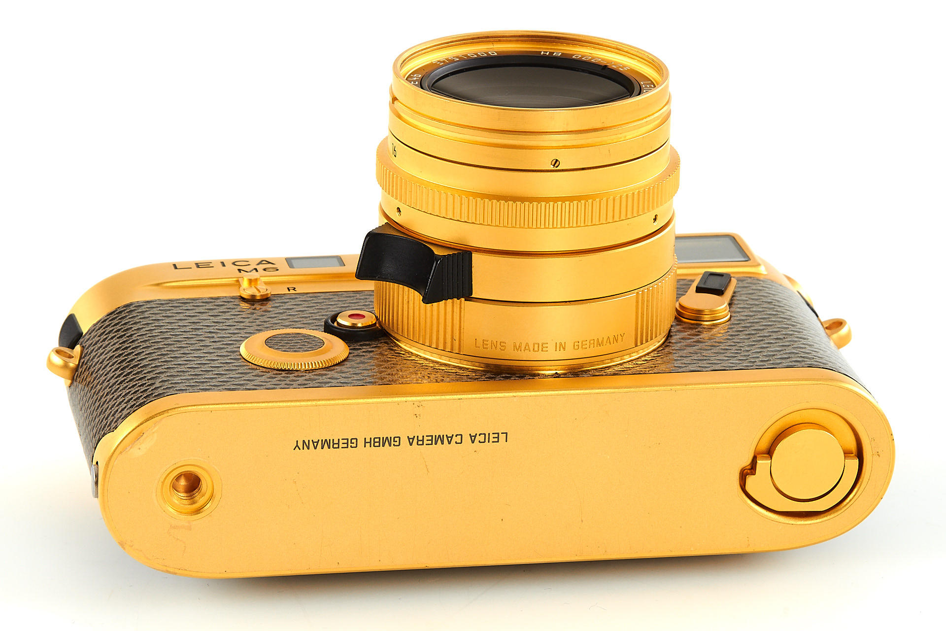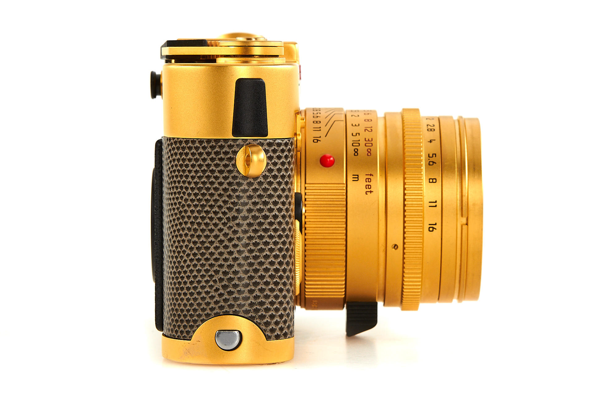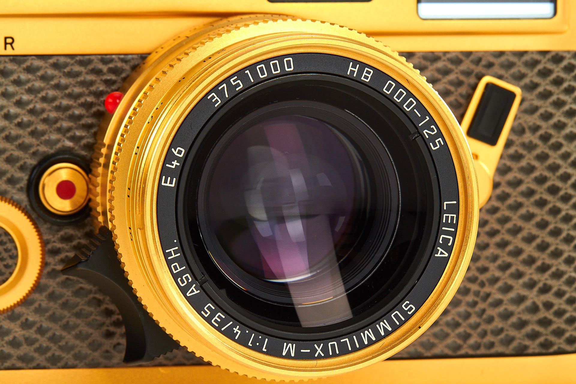 a prototype of the rare gold edition M6, the golden M6 has been produced in limited quantity for the Sultan of Brunei as gifts for his special guests, with matching Summilux-M 1.4/35mm ASPH. no.3751000, wooden presentation box