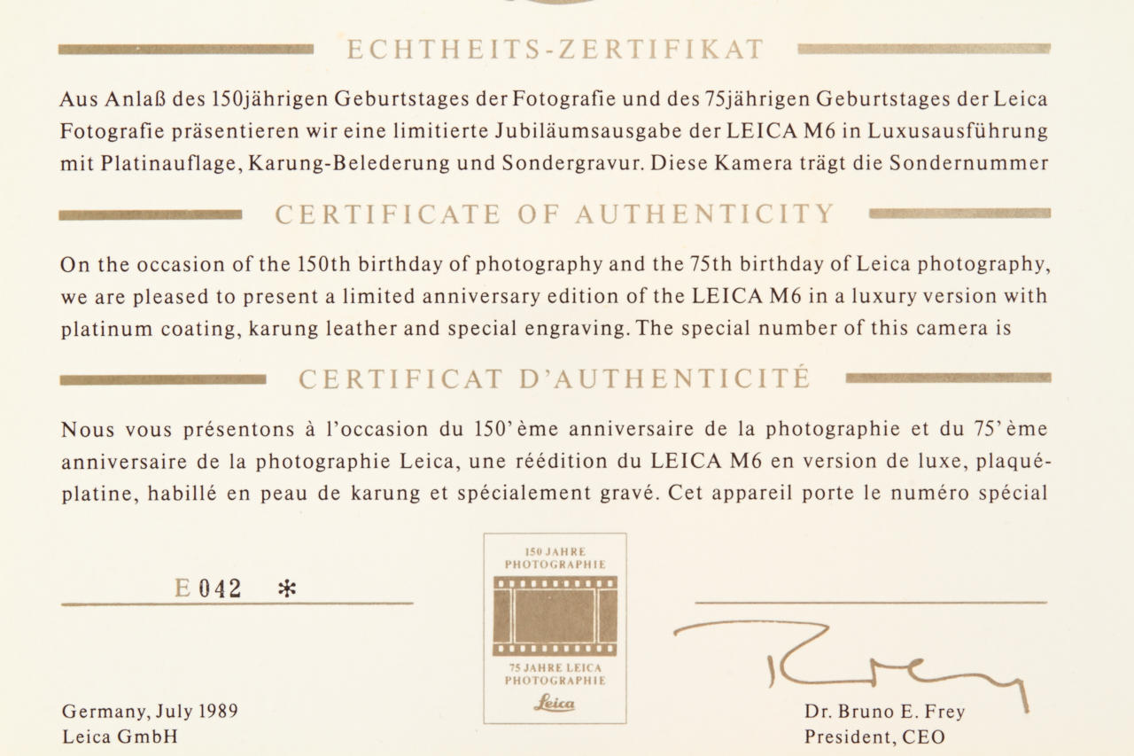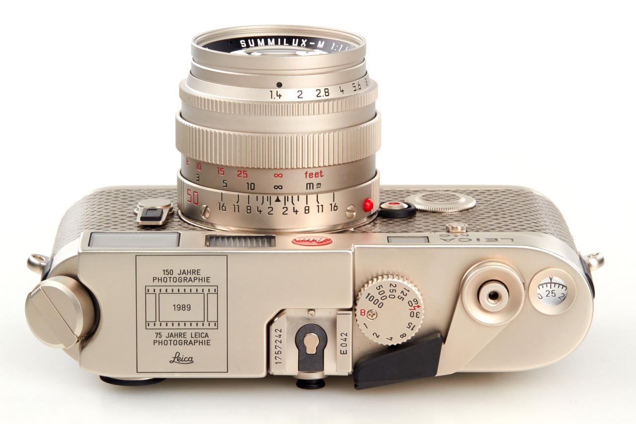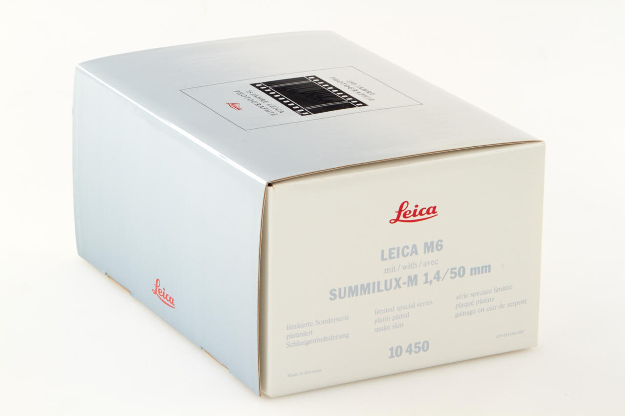 special edition for 150 years of photography and 75 years of Leica photography (special number E042), platinum Summilux-M 1.4/50mm no.3482532, in new condition, with wooden presentation box, all accessories, papers, maker's box, outer box