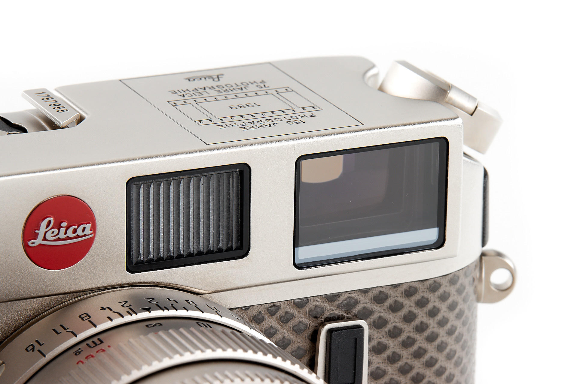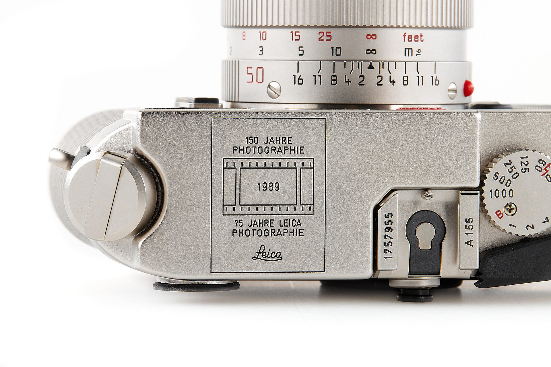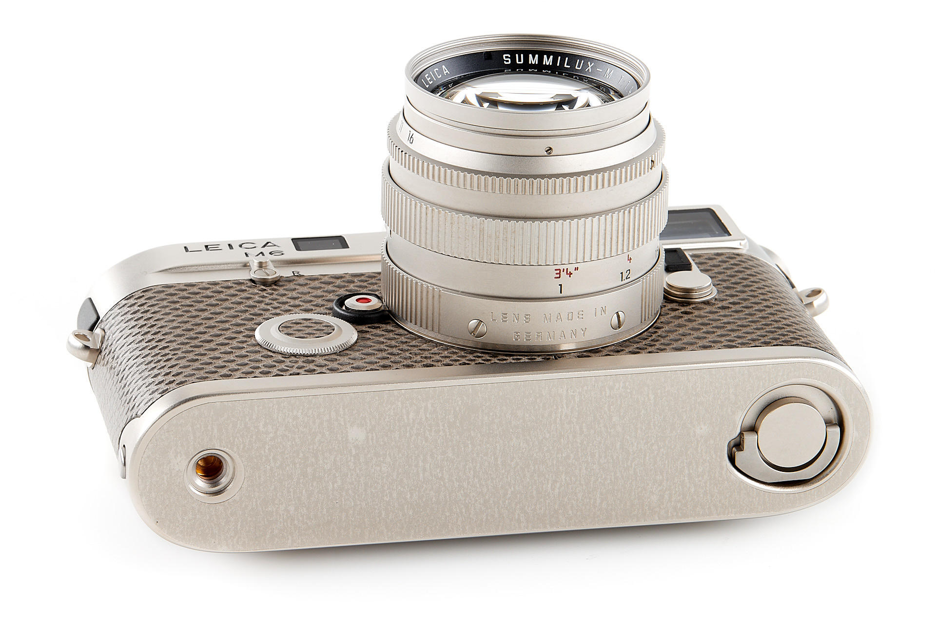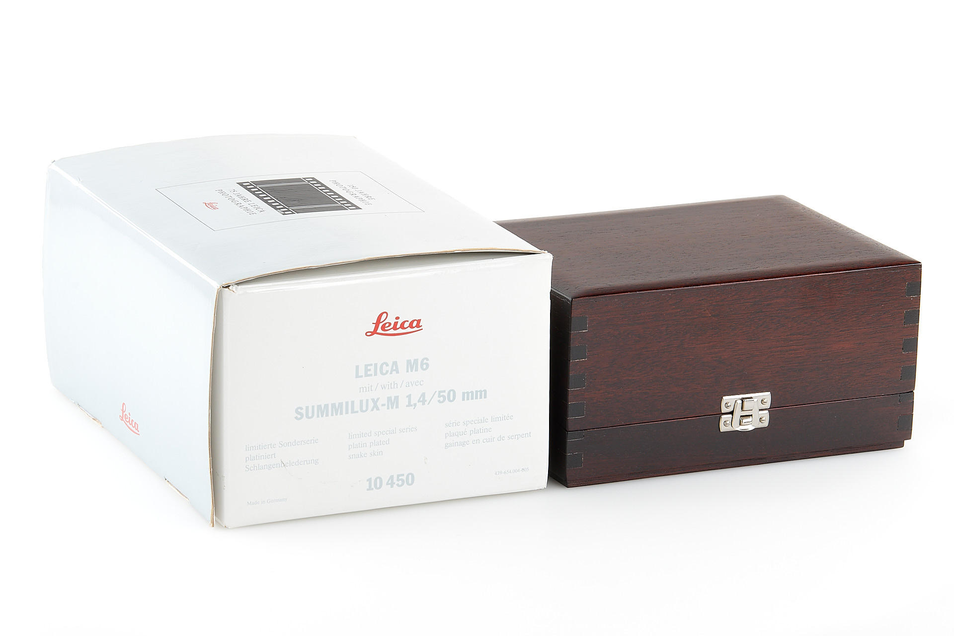 special edition issued for 150 years of photography and 75 years of Leica photography, body number 1757955, platinum Summilux-M 1.4/50mm no.3481970, in mint condition, with wooden presentation box, maker's box