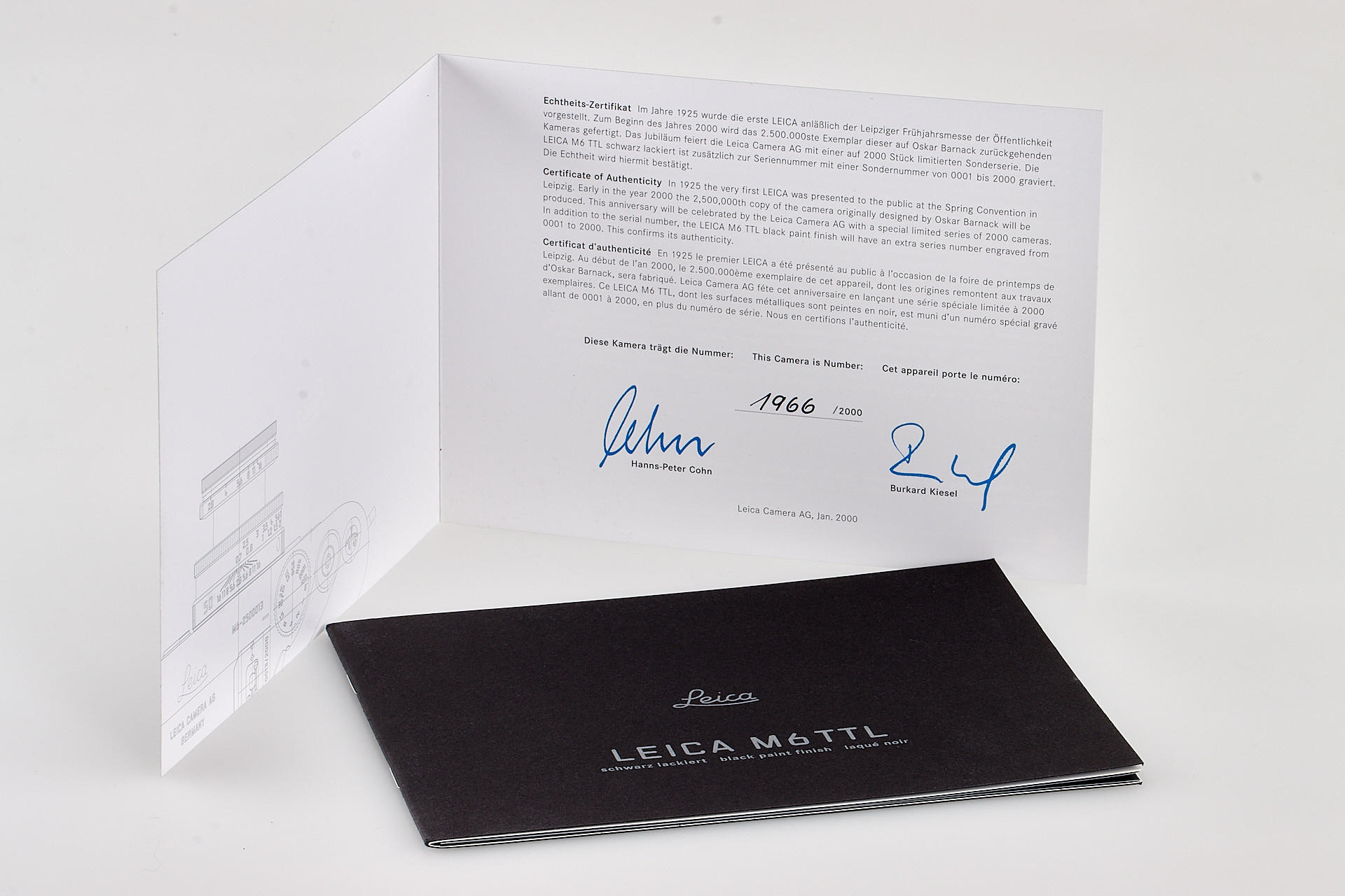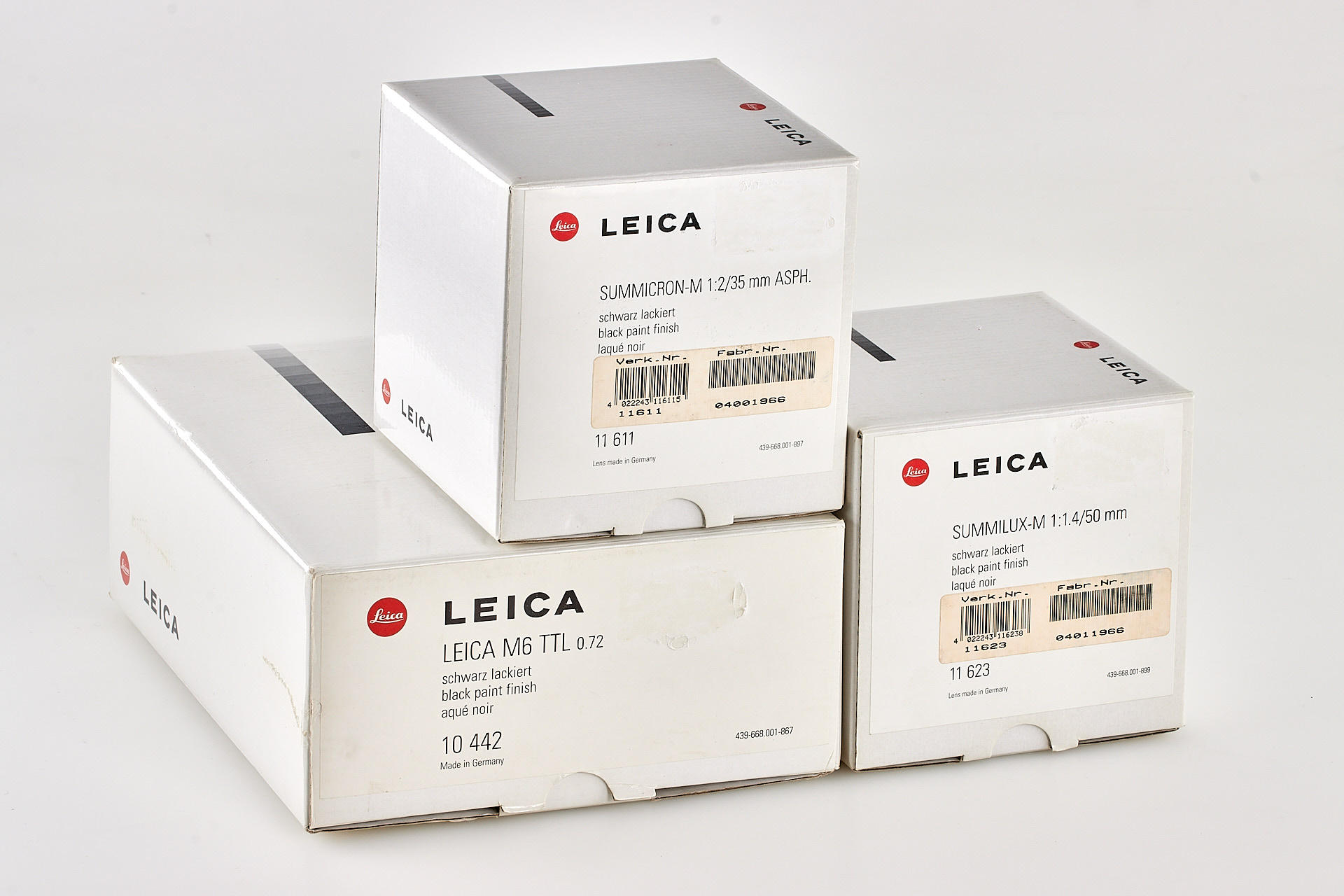 Sought-after Millennium outfit, complete with black paint M6 TTL 10442 no.2501966, Summicron 2/35mm Asph. no.4001966 and Summilux 1.4/50mm no.4011966 - everything with matching serial numbers and complete in maker's boxes. It is for sure one of the most beautiful modern special editions of Leica.