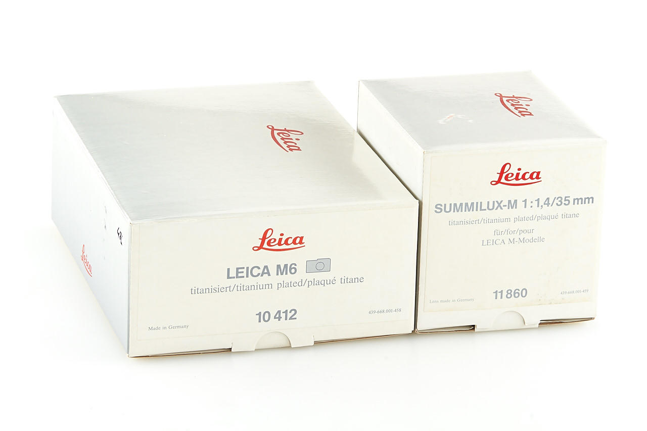 near mint titanium body, complete with all papers and accessories in matching maker's box, with quite rare pre-Aspherical Titanium Summilux-M 1.4/35mm no.3570965, in near mint condition, clean lenses, with rear cap, 12504 hood, keeper, matching warranty card and maker's box